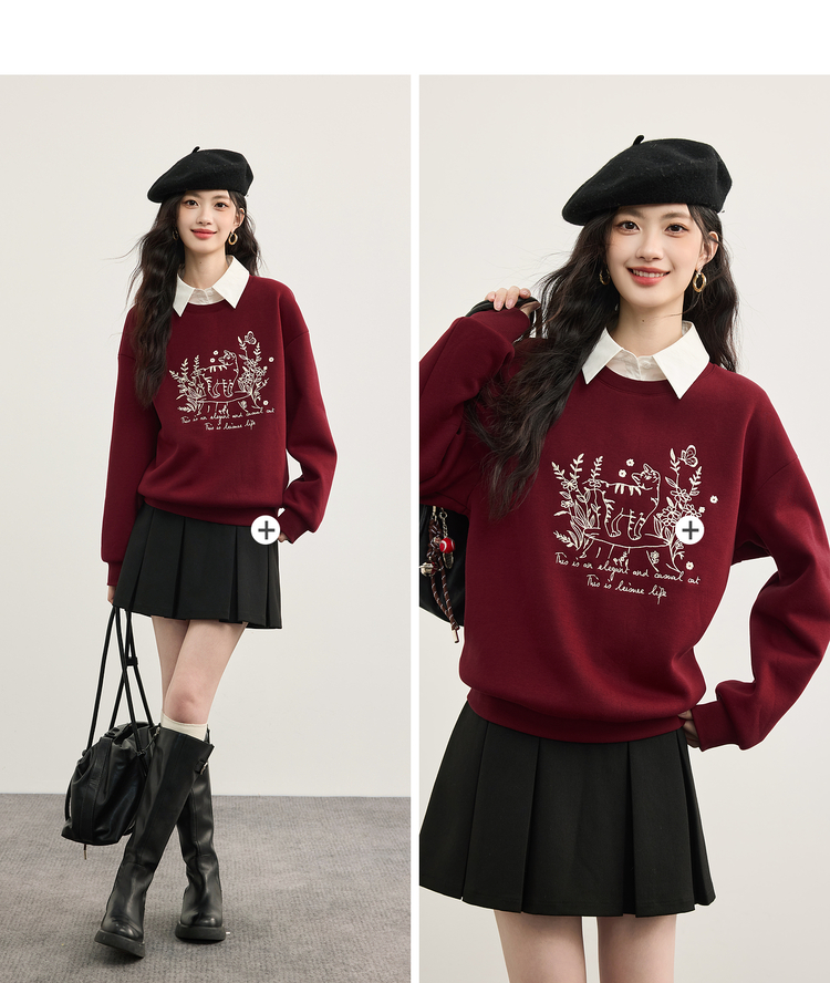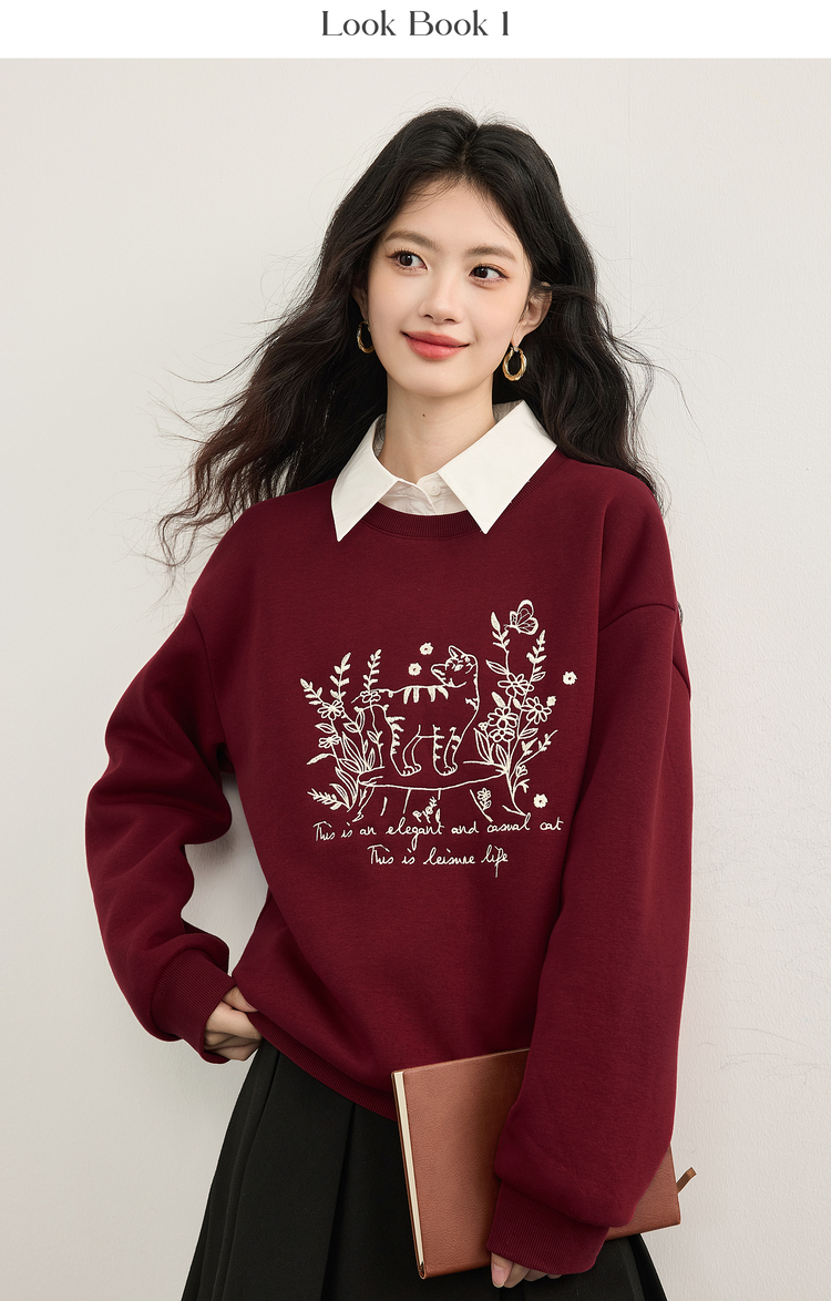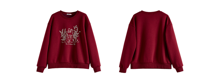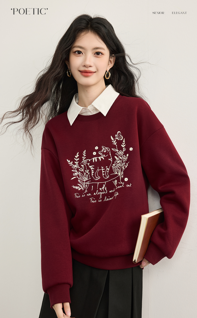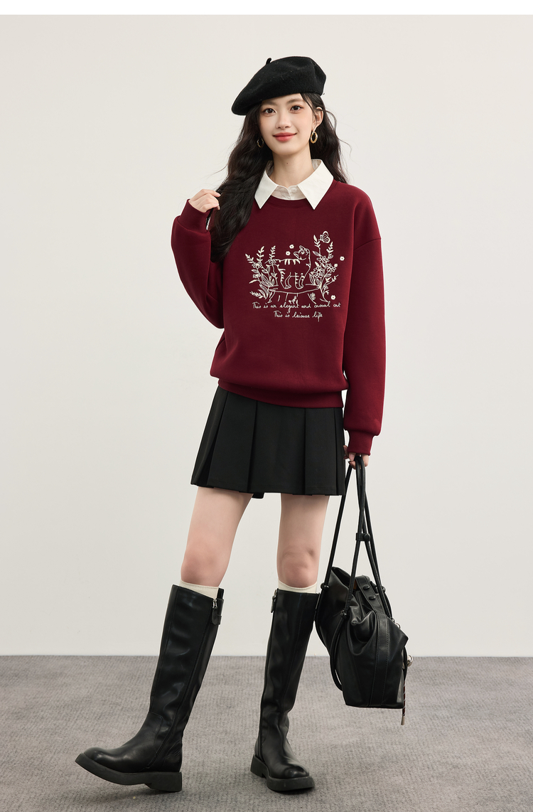 【周末秒杀】熙世界miu系酒红色加绒卫衣女宽松慵懒美式刺绣上衣2025秋冬新款