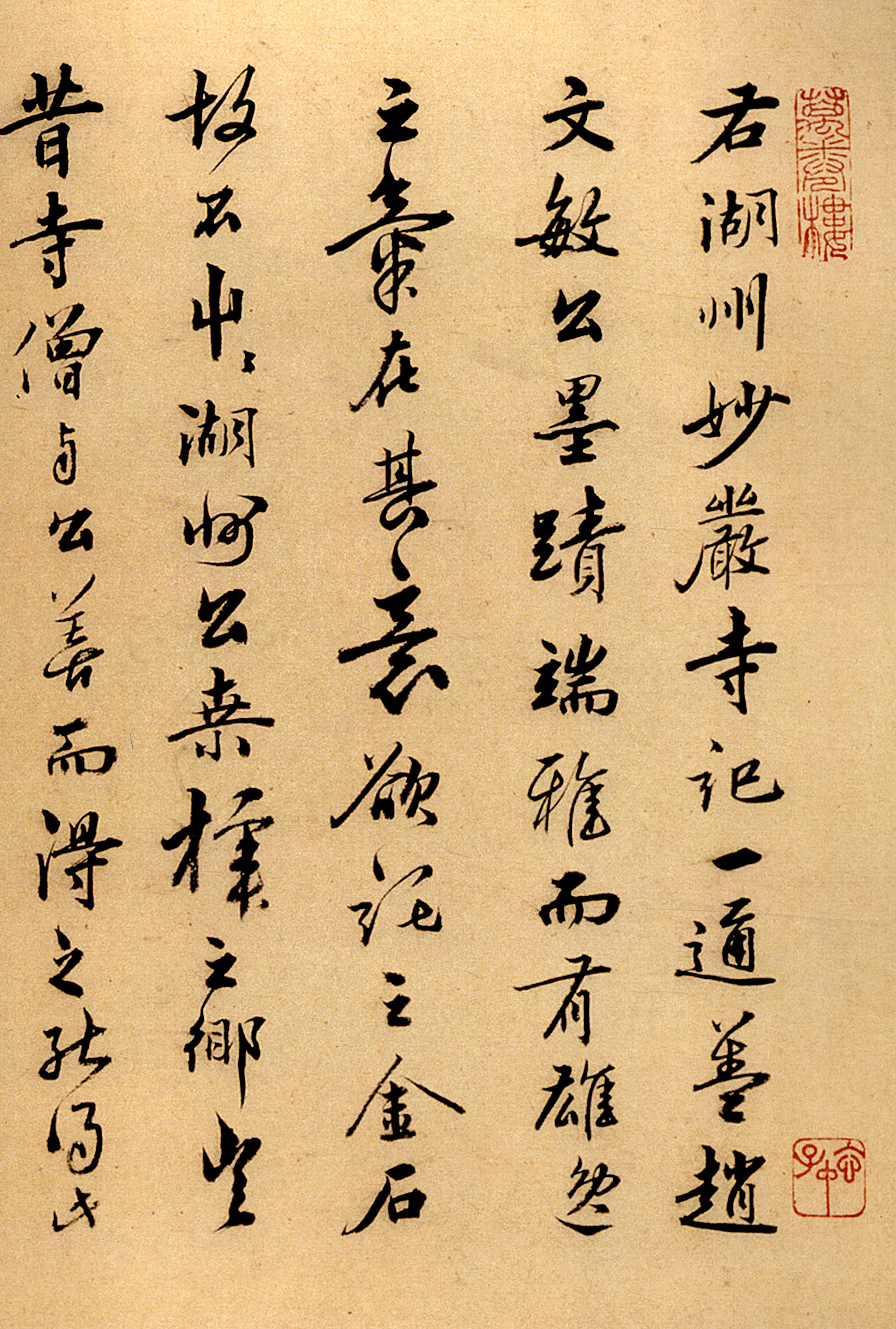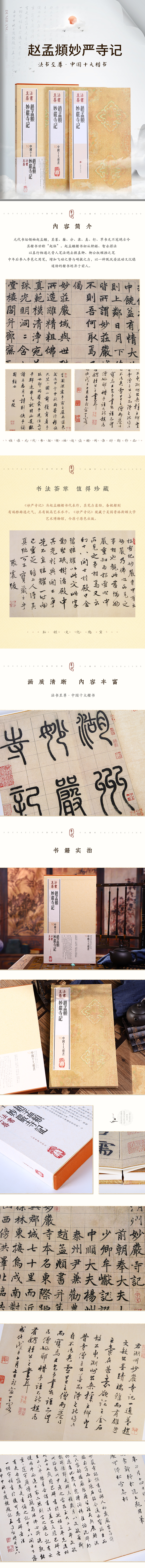 本册为赵孟頫《妙严寺记》。楷书发展至元代,能卓然立于唐贤之后者,惟赵孟頫而已。赵孟頫书法各体兼工,行楷尤为著名,秀丽道润;楷书与欧阳询、颜真卿、柳公权合称“楷书四大家”,世称“赵体”。《元史》称其“篆、籀、分、隶、真、行、草书无不冠绝古今,遂以书名天下”。《妙严寺记》以真行相通之晋人笔法绝去颜、柳顿挫之笔,并参入李邕之用笔,增加飞动之势与峭拔之力,以一种既风姿流动又沉稳道劲的楷书迥异于前人。现以传世墨迹本影印出版。