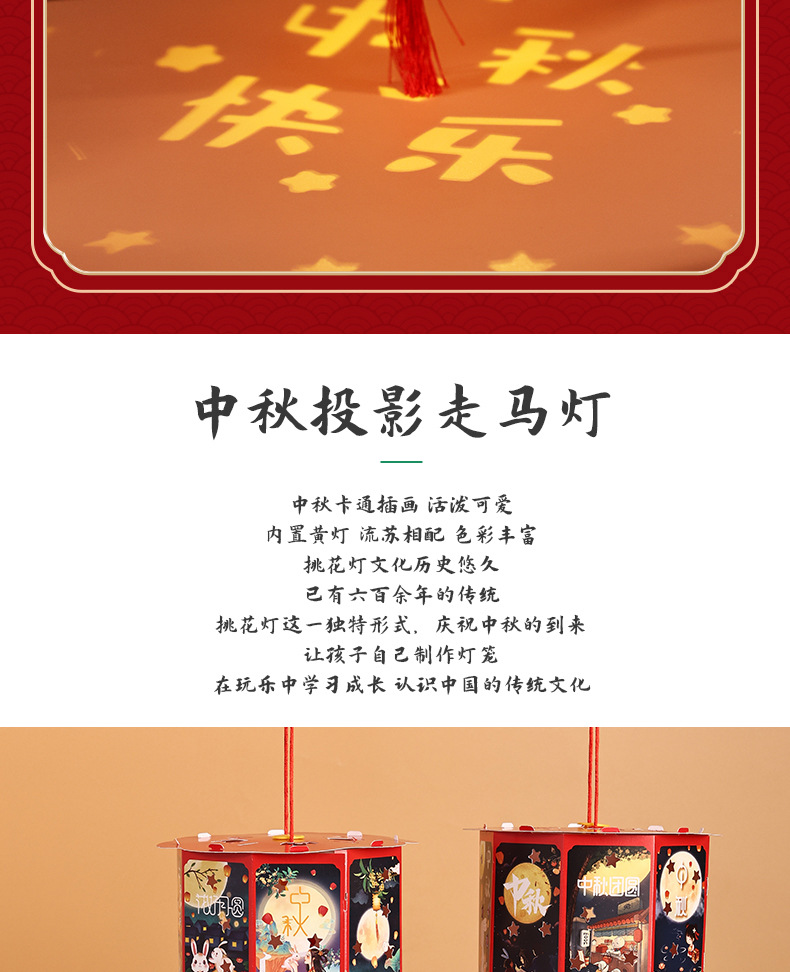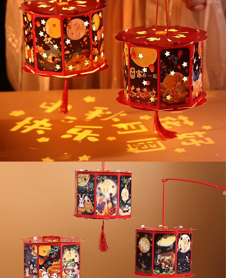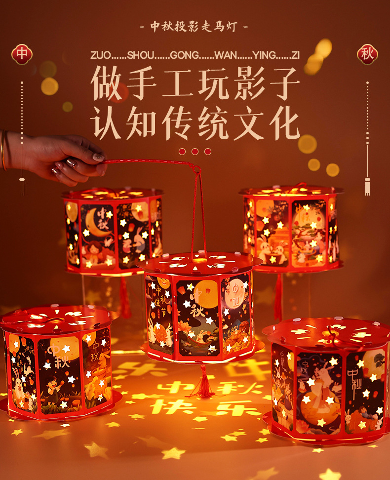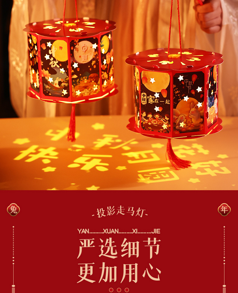 送同款【中秋佳节,赠礼有心】投影走马灯笼带你重温传统华美;手提灯夜市发光,惊艳夜空;宫灯小花灯DIY材料包,创意无限;让我们一起点亮中秋团圆的喜悦之光!