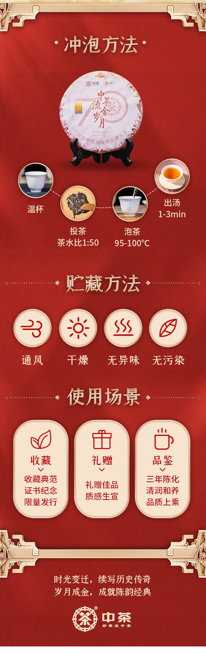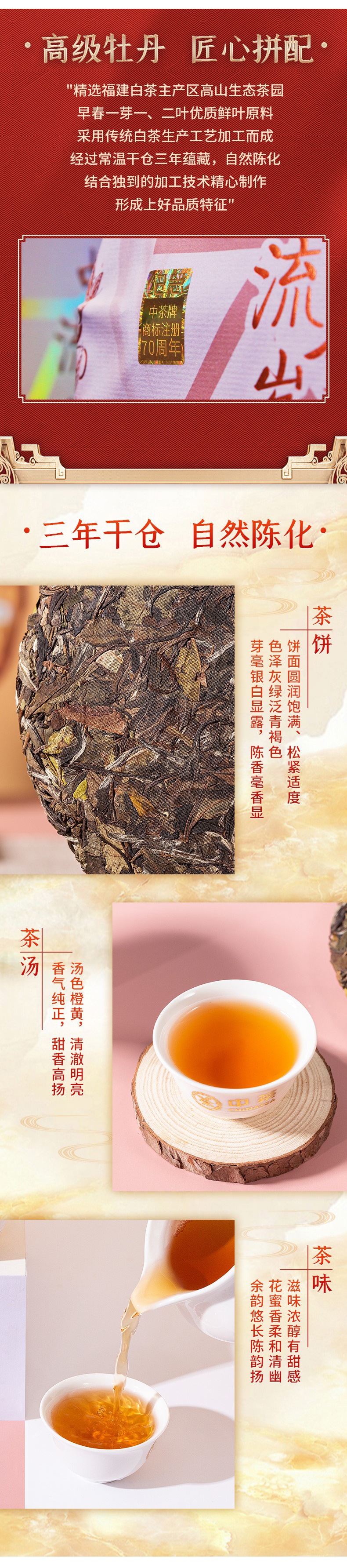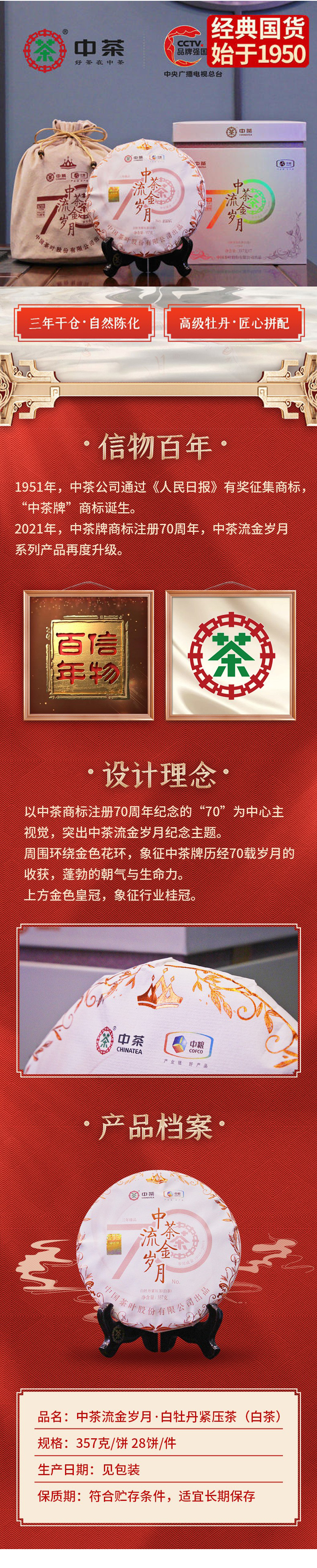 中粮-中茶2021年(三年陈老白茶)70周年纪念流金岁月系列白牡丹白茶饼357g /饼/干仓直发