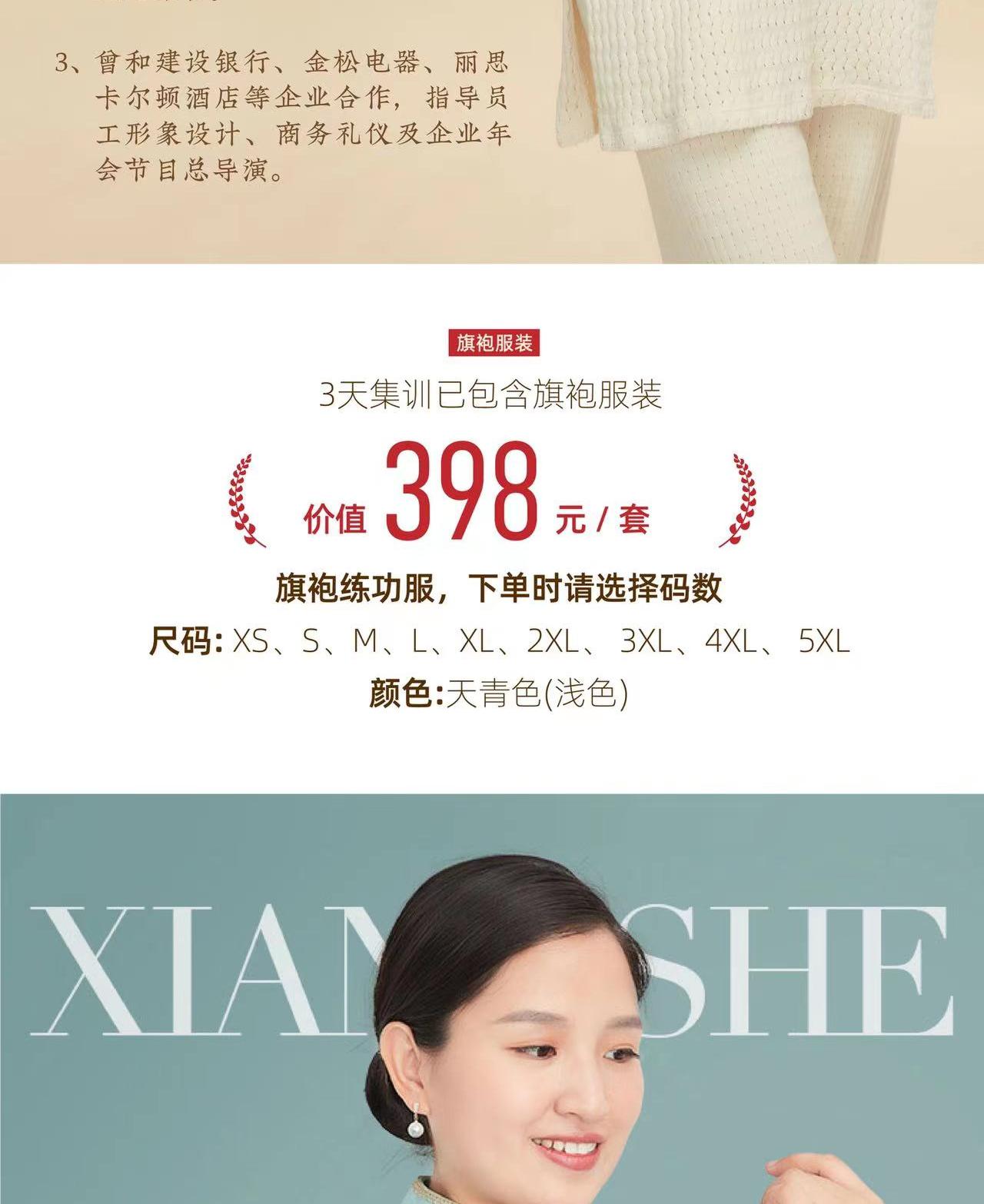 旗袍服装:3天集训已包含旗袍服装,价值398元/套旗袍练功服,下单时请选择码数,尺码:XS、S 、M 、L、 XL、2XL、 3XL、4XL、5XL 颜色:天青色(浅色)
