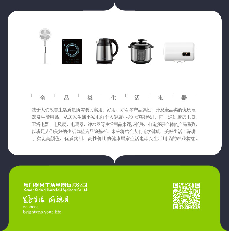 厦门视贝科技有限公司是集产品自主设计,研发,生产,销售于一体的高科技企业。拥有80000平方米的制造厂房,核心员工2000多人。产品线涵盖照明、电工,卫浴,线路,集成风暖等领域。