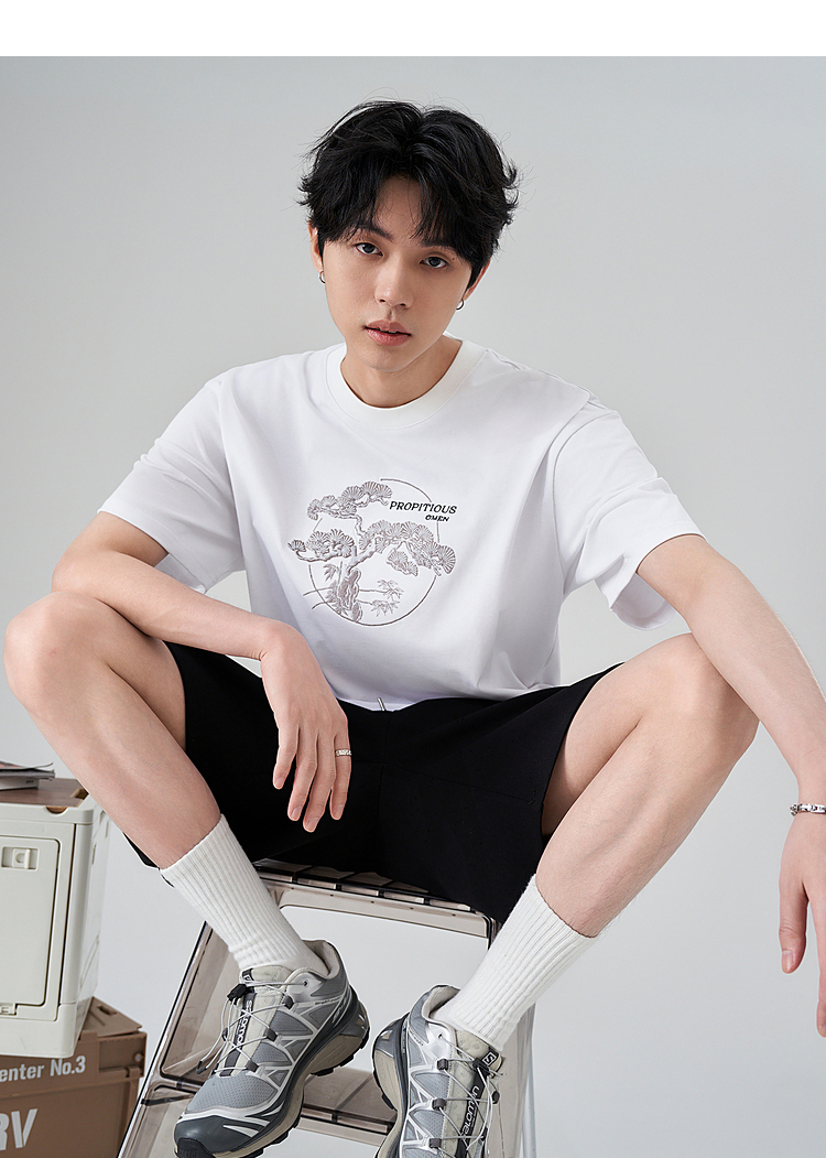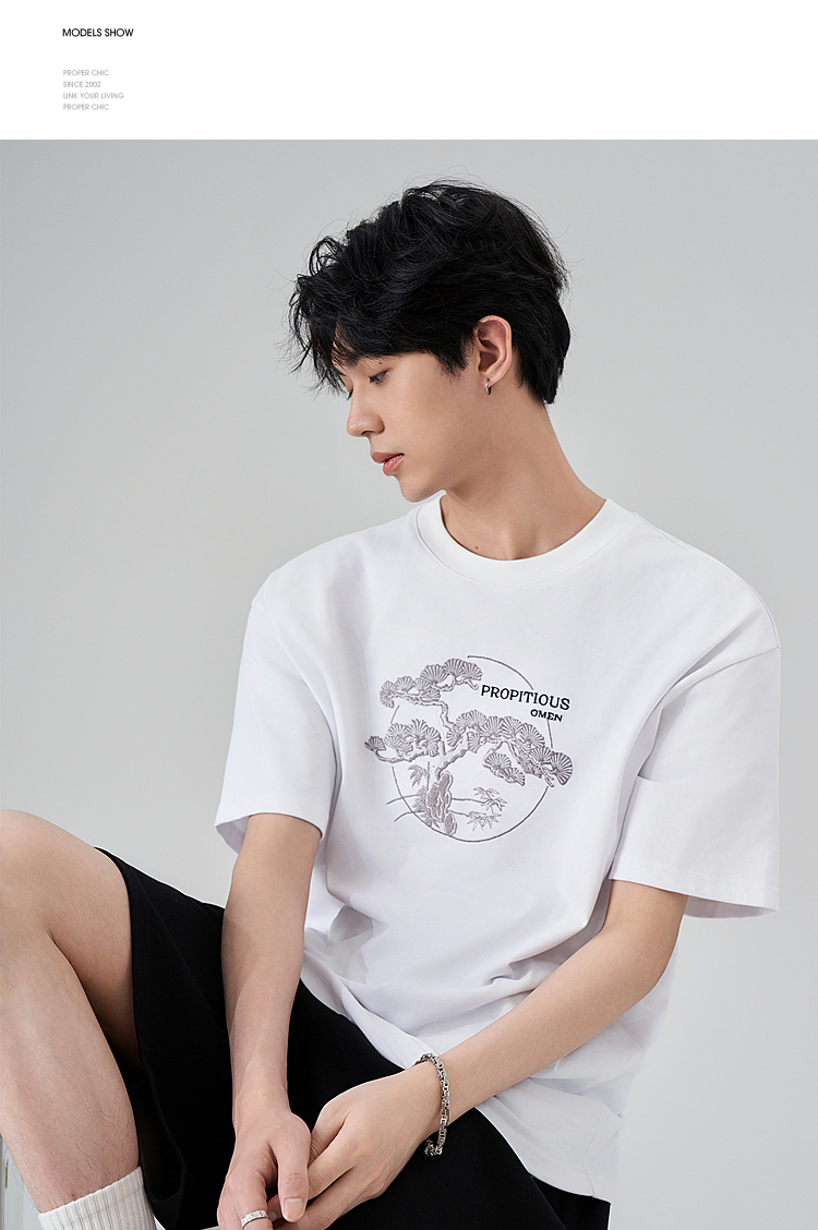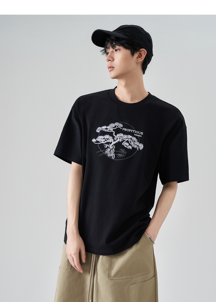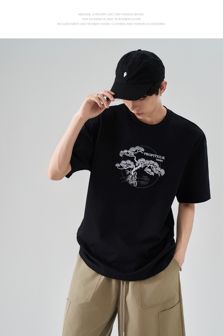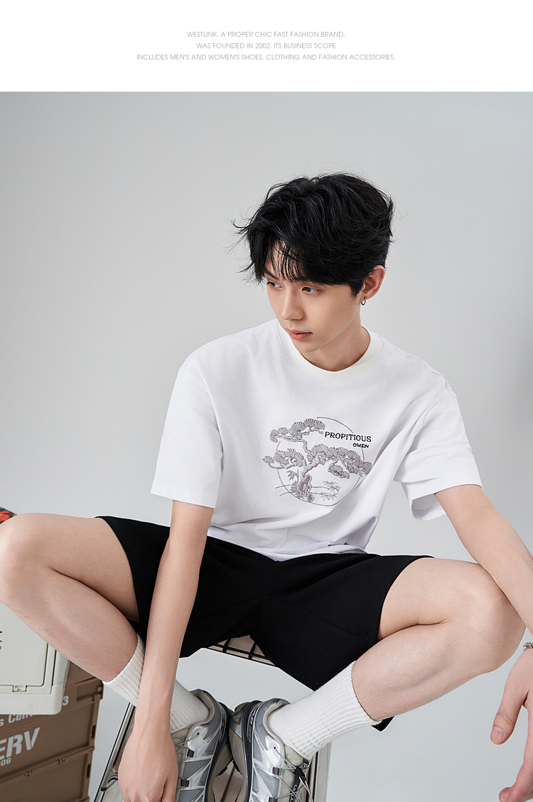 西遇国风精致绣花圆领男士T恤早春新款百搭简约宽松短袖上衣12545820