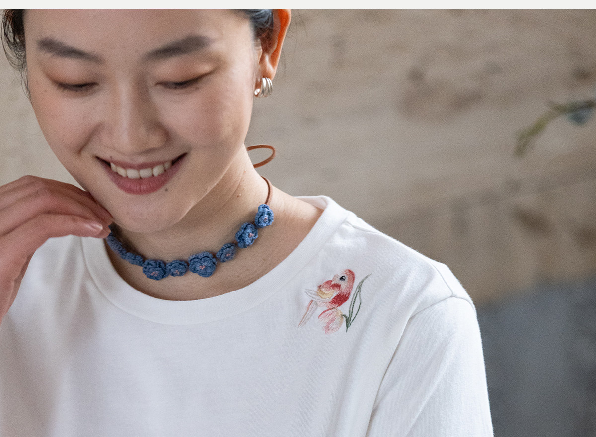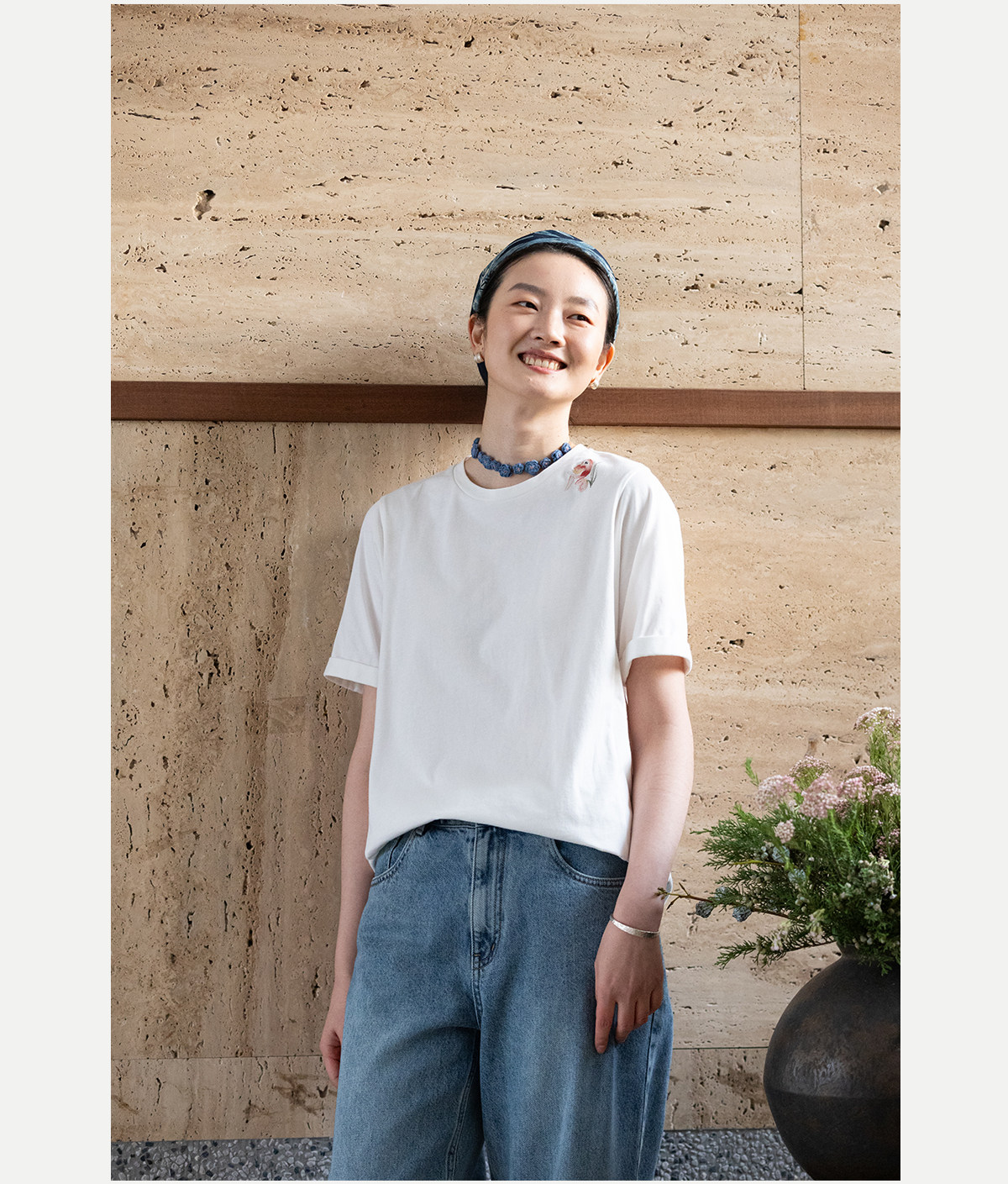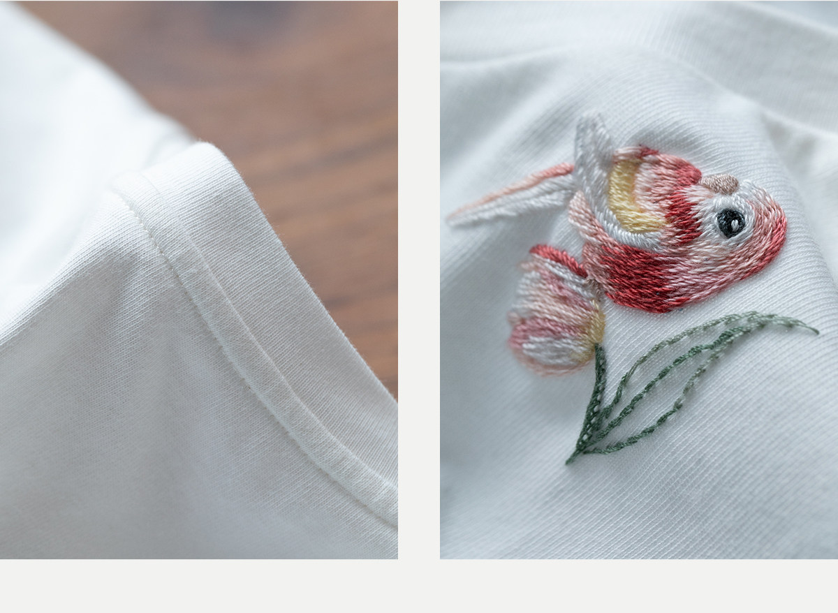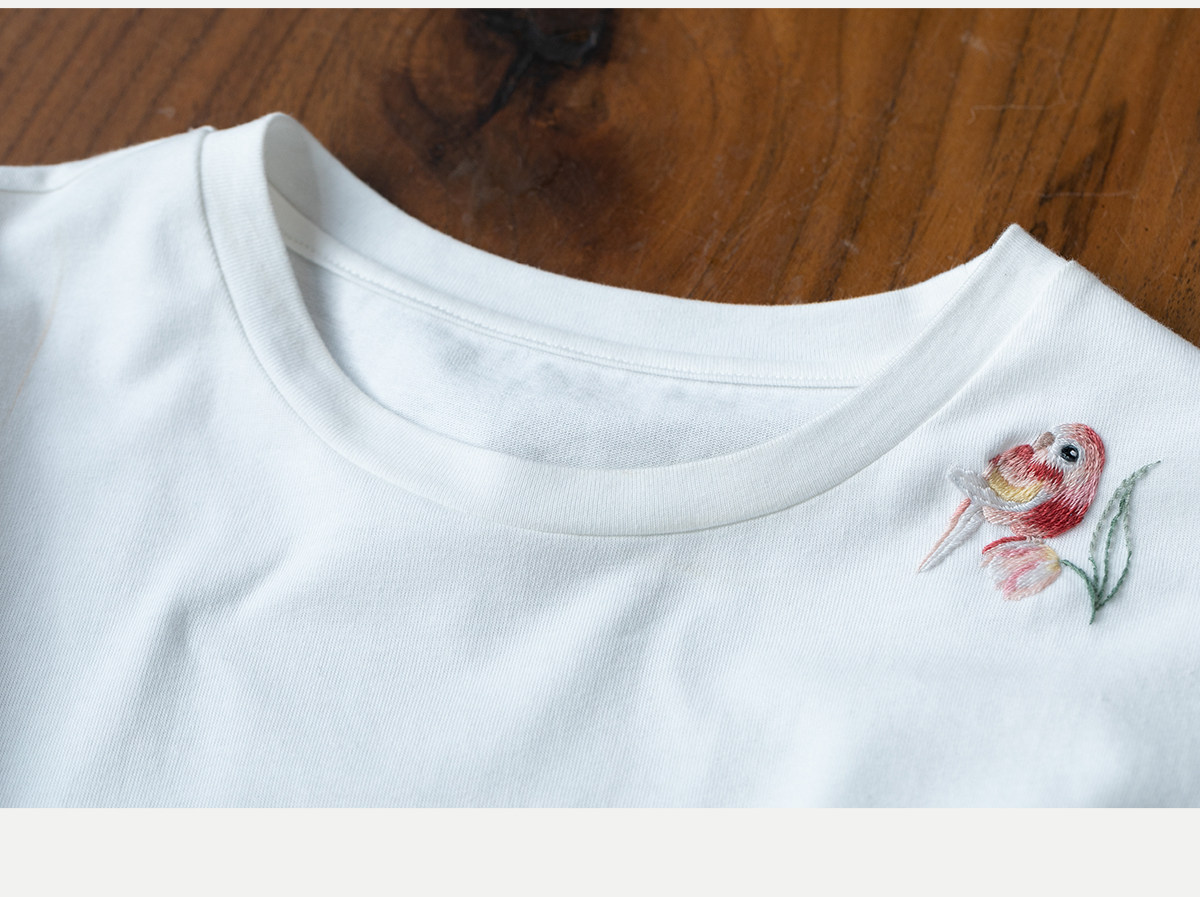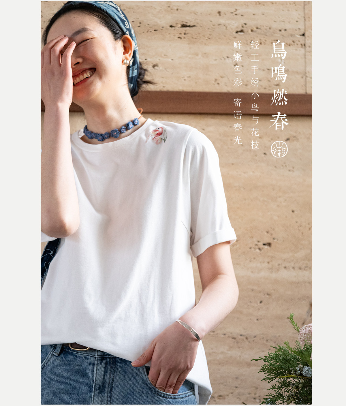 牧衣游原创手工刺绣纯棉T恤新款简约圆领百搭休闲短袖套头衫 乐渝
