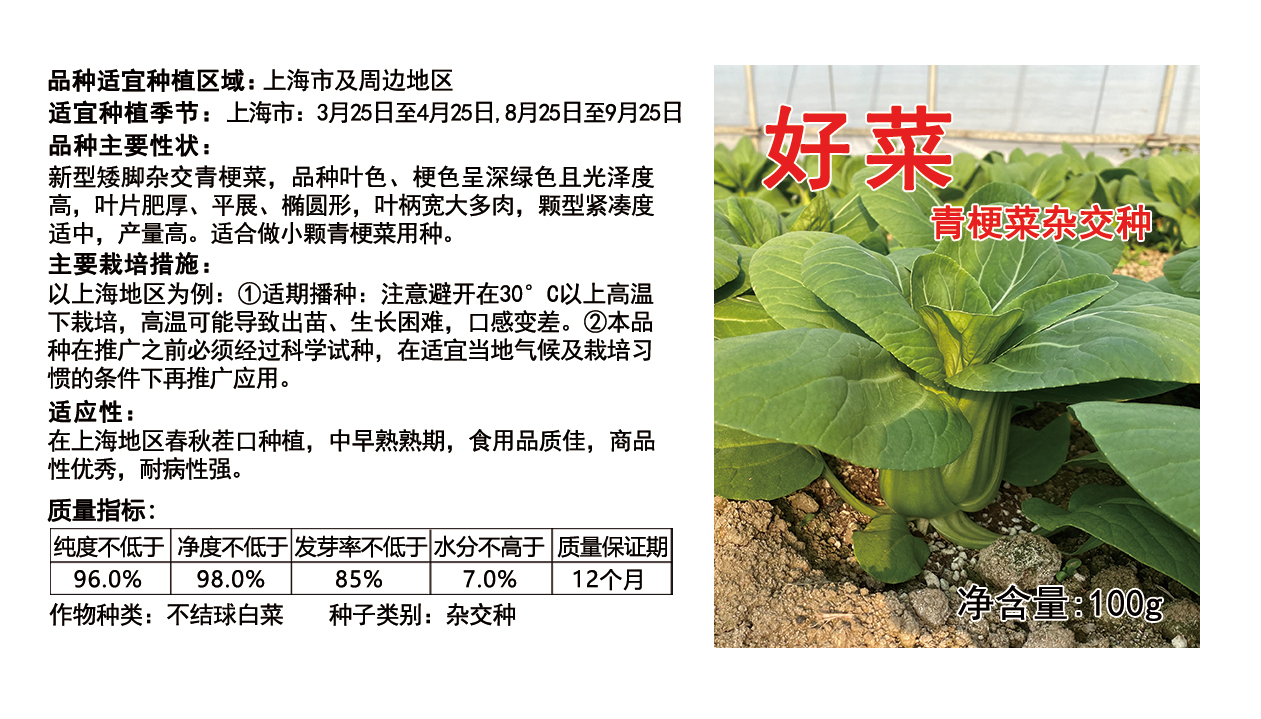 新型矮脚杂交青梗菜,品种叶色、梗色呈深绿色且光泽度高,叶片肥厚、平展、椭圆形,叶柄宽大多肉,颗型紧凑度适中,产量高。适合做小颗青梗菜用种。