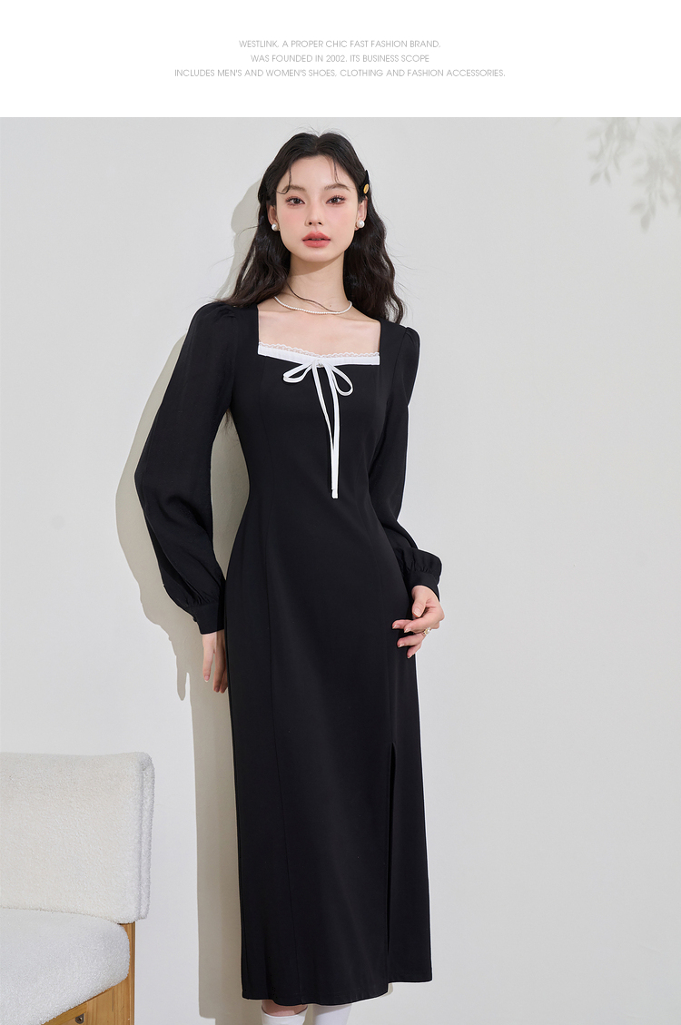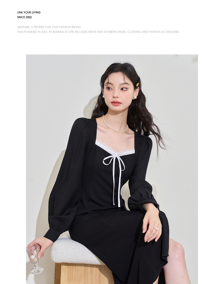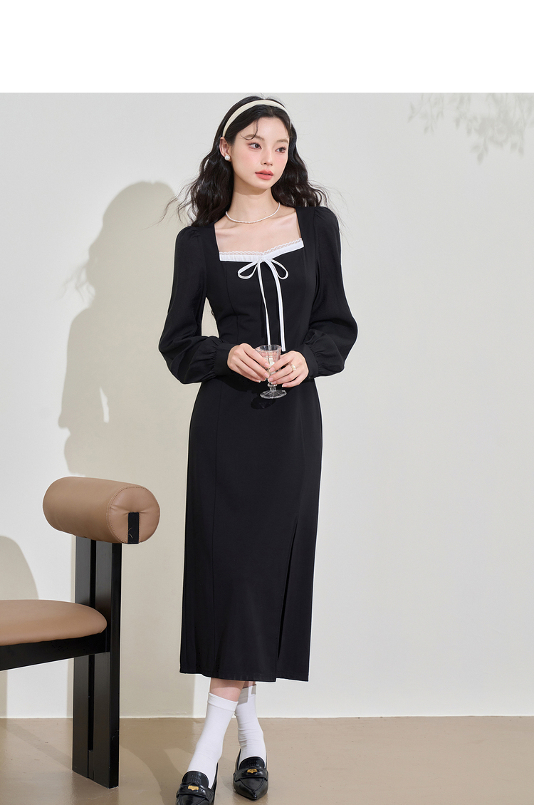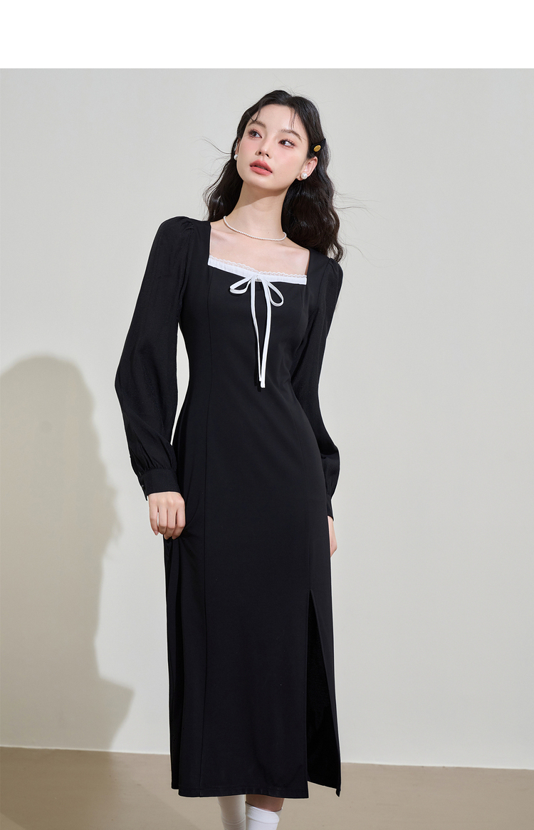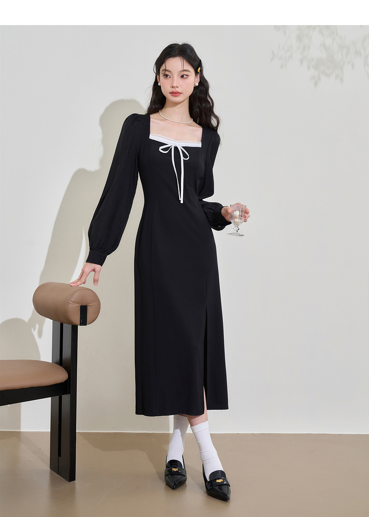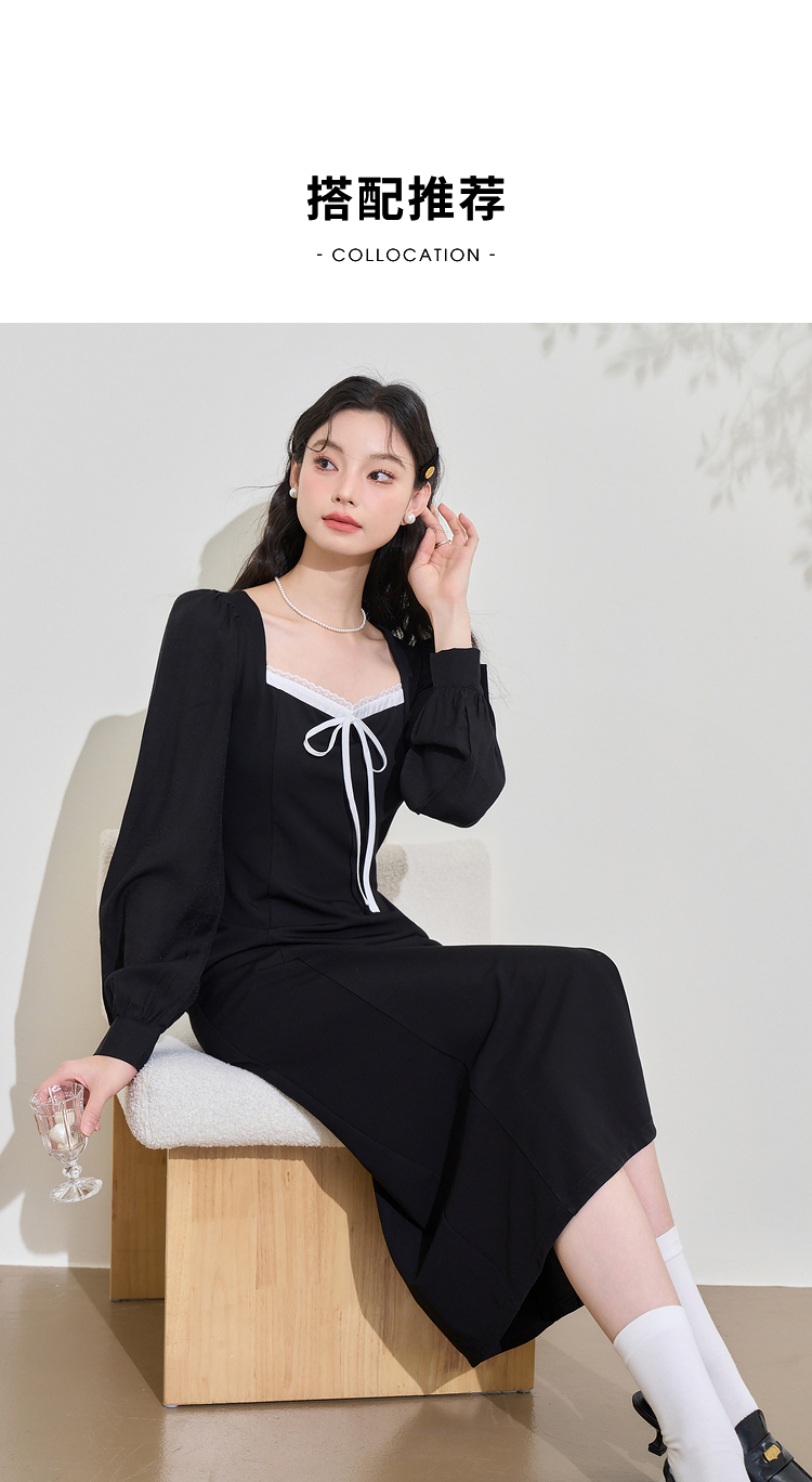 赫本风高级感浪漫复古长袖连衣裙女早春蕾丝花边拼接长裙V3342280