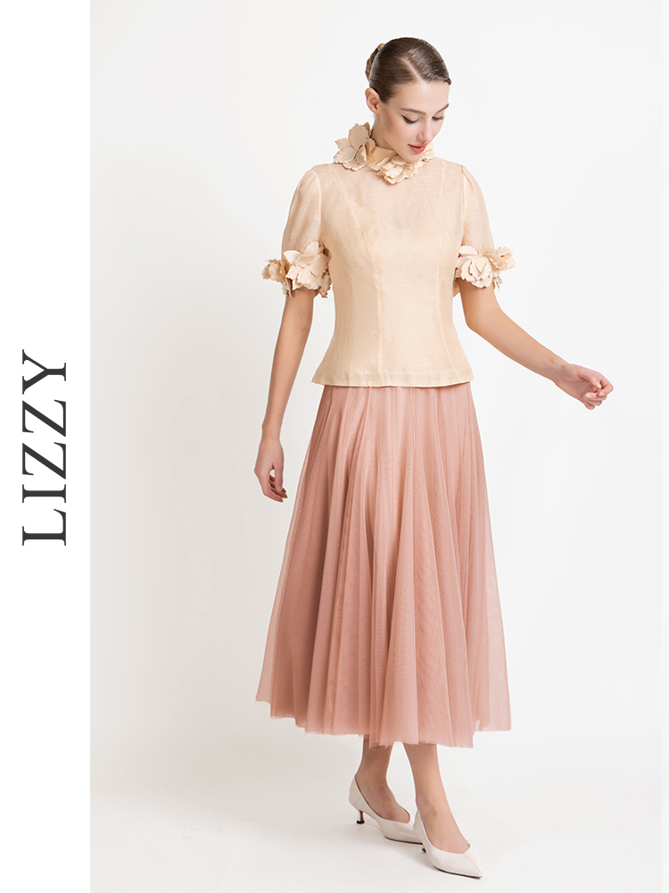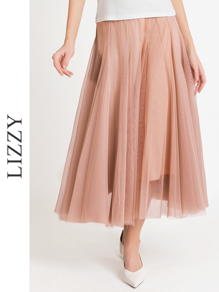 LIZZY四季款时尚优雅立体裁剪松紧腰双层纱百搭动感网纱裙7085