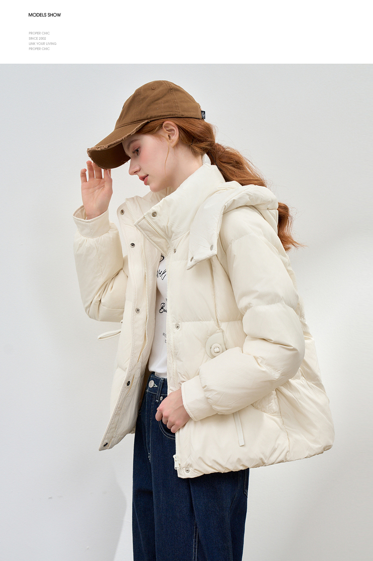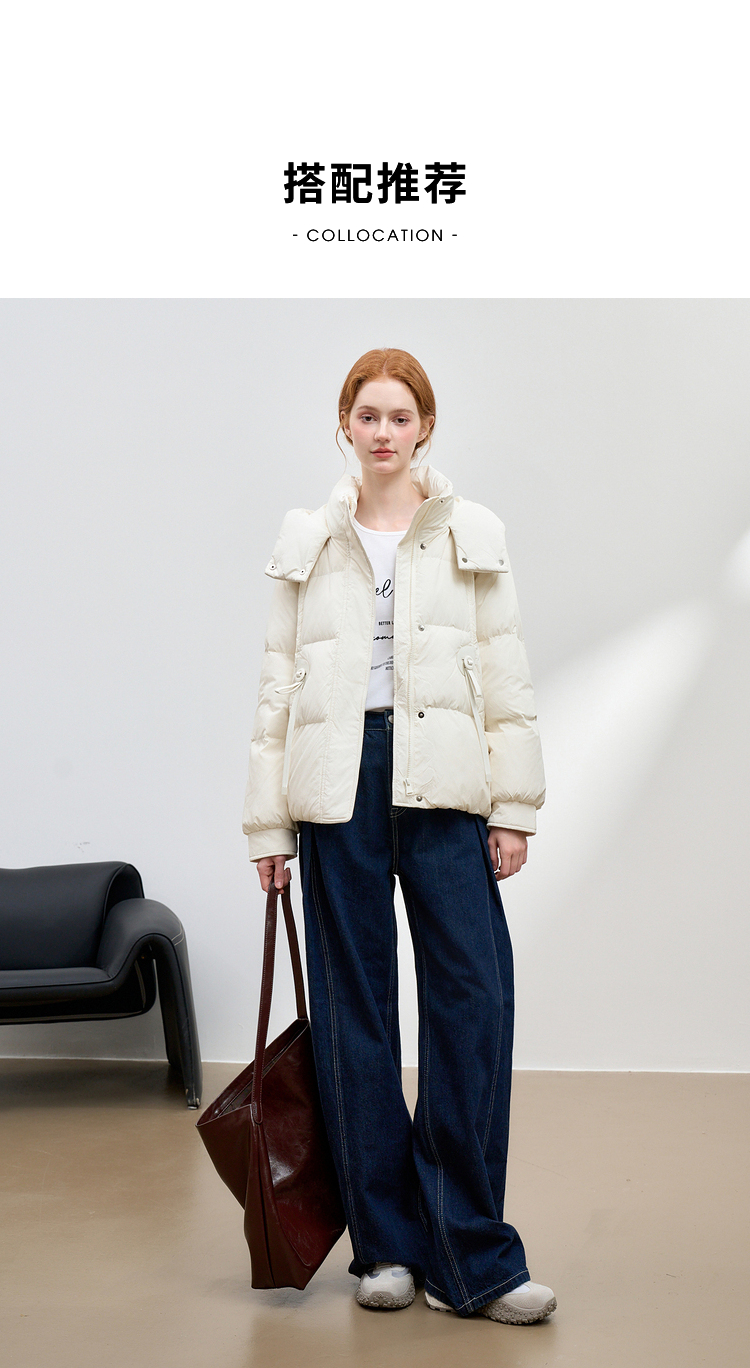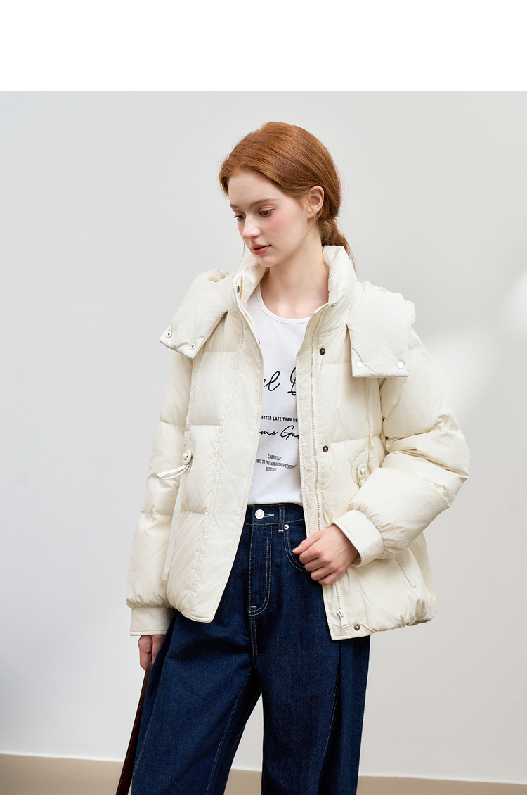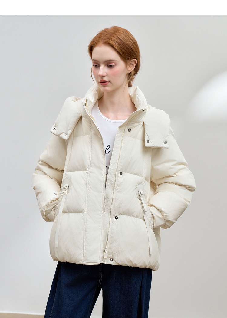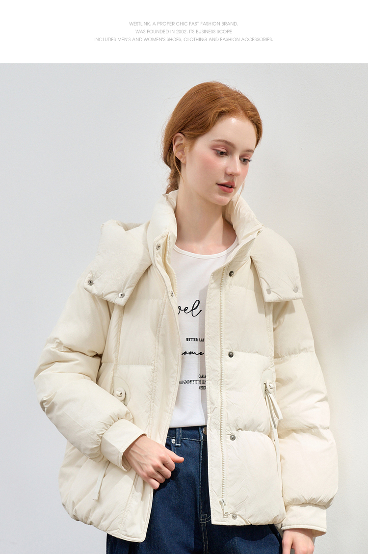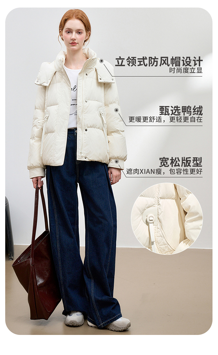 西遇杏色立领口袋鸭绒羽绒服女冬季新款时尚气质短款面包服M0043186