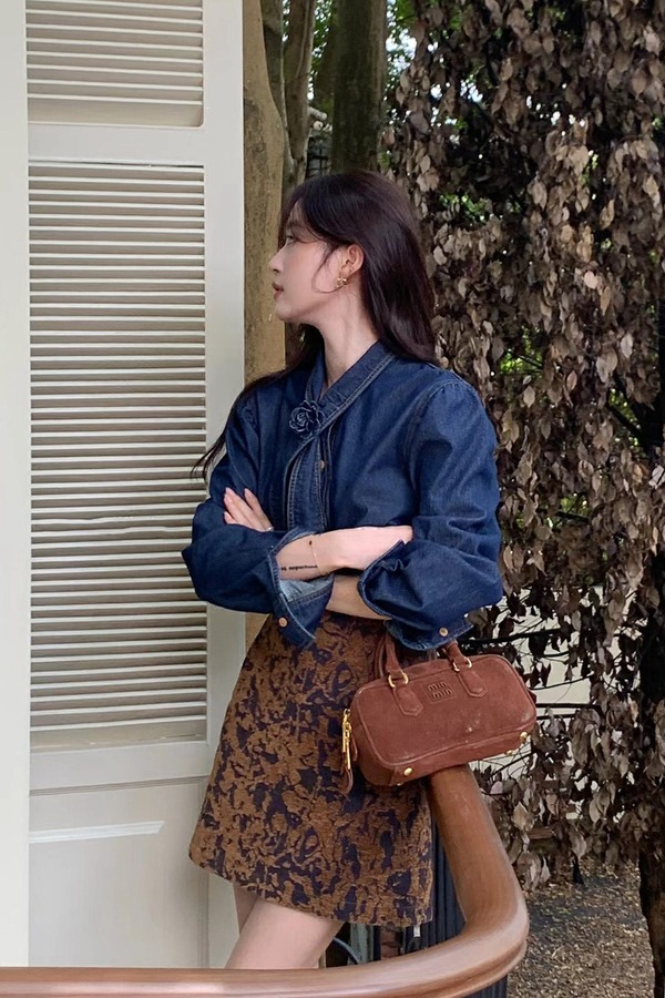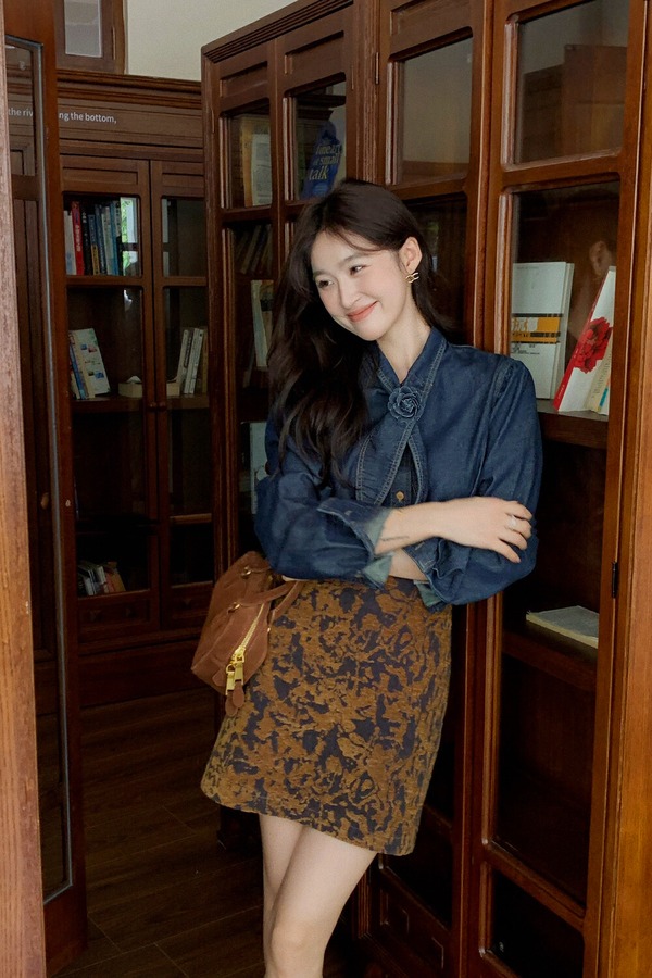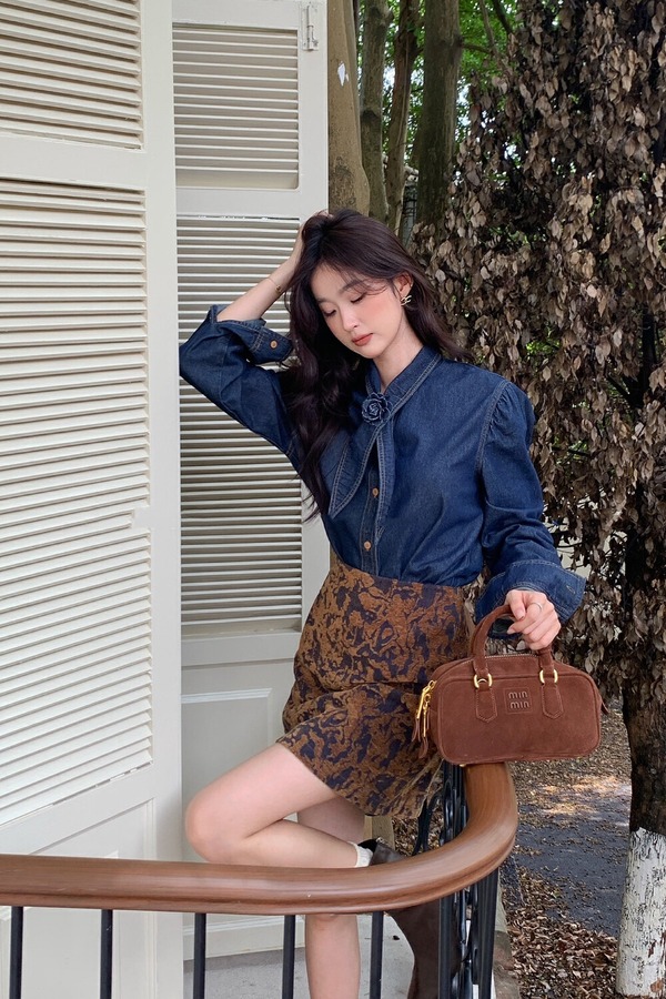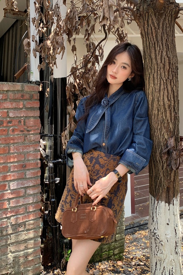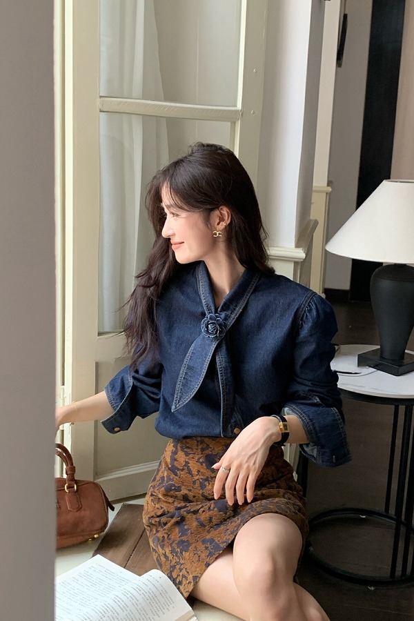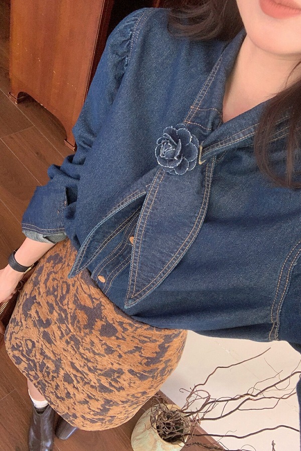 ANSUABEL 港风时尚花朵领结高级质感牛仔衬衫 21491
