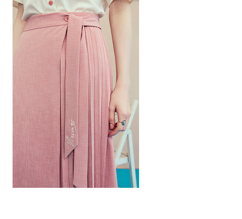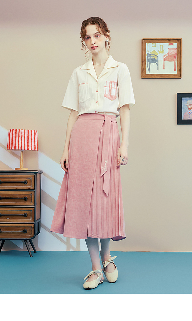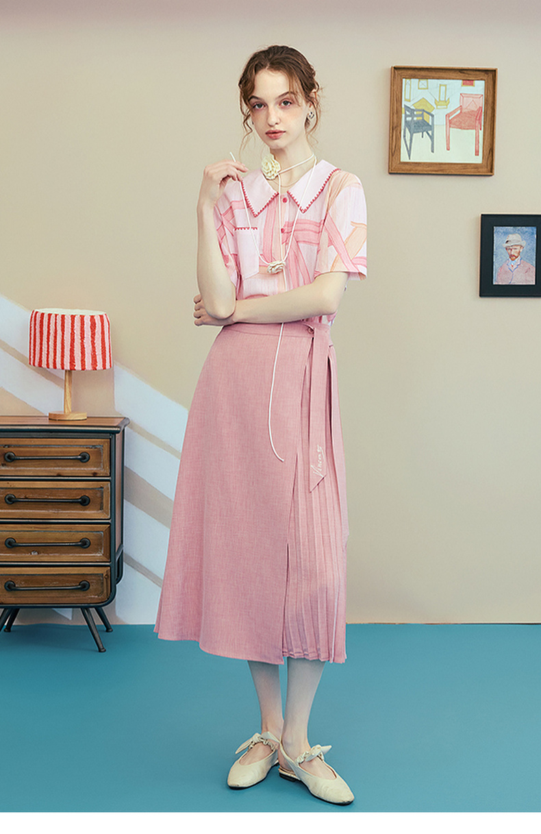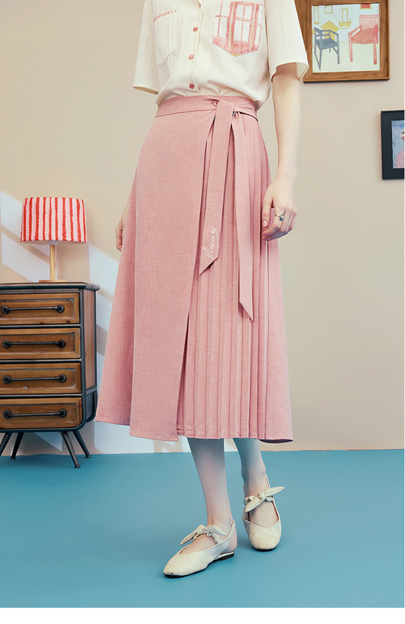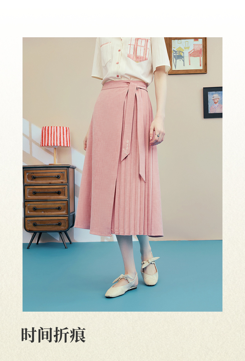 两三事梵高文艺时间折痕2025夏新款刺绣腰带粉色百褶裙高腰半身裙