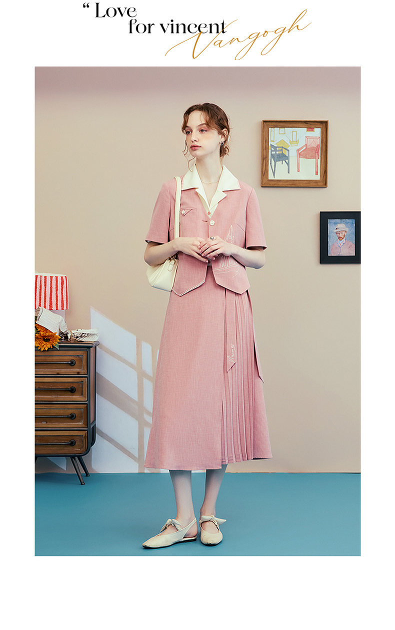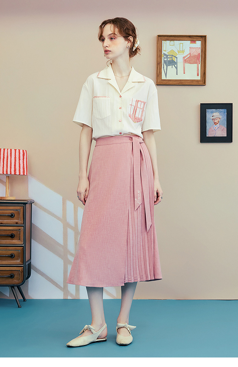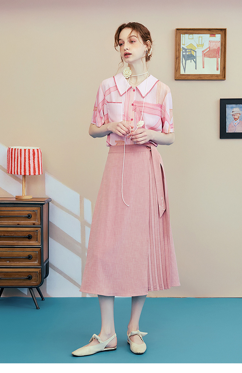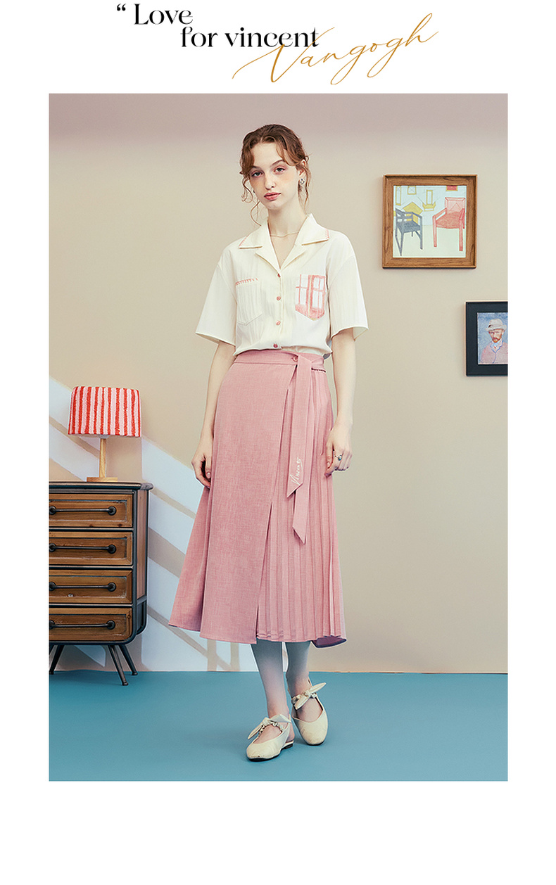 两三事梵高文艺时间折痕2025夏新款刺绣腰带粉色百褶裙高腰半身裙