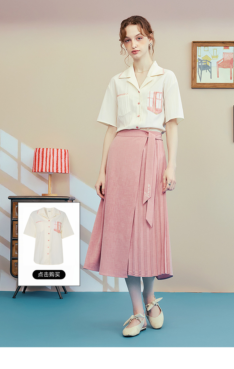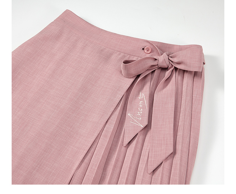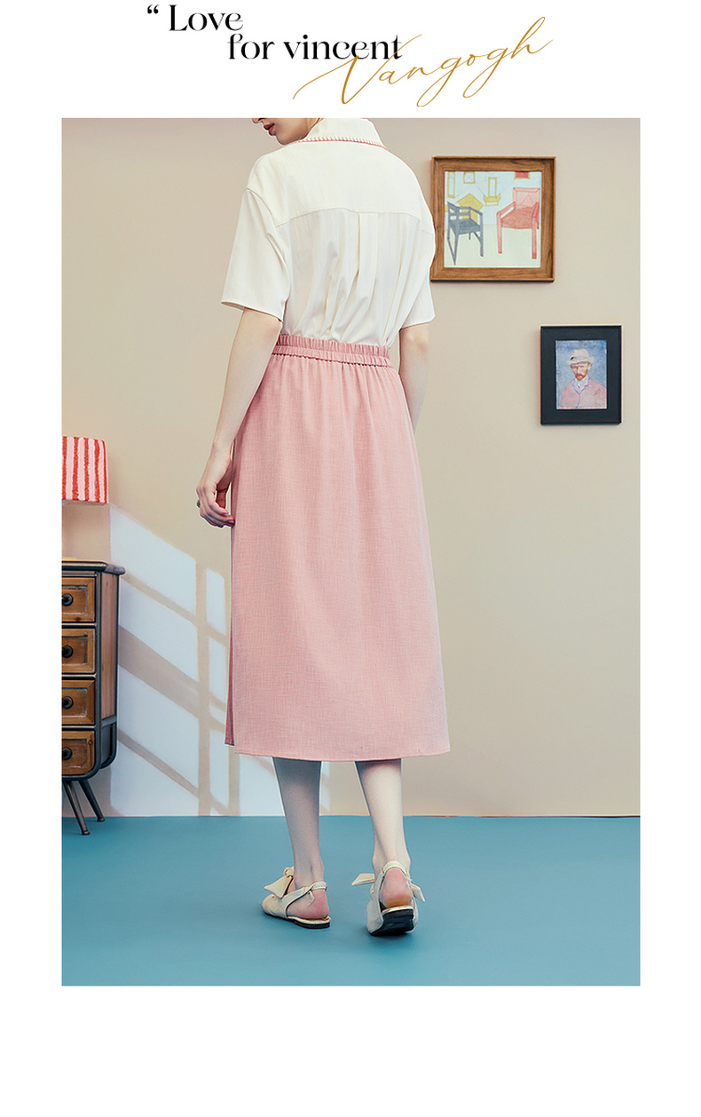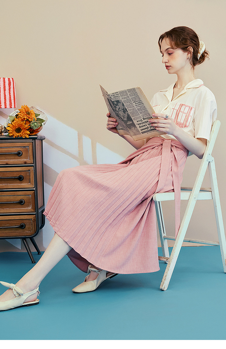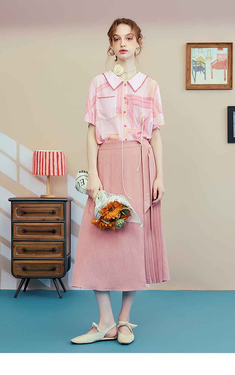 两三事梵高文艺时间折痕2025夏新款刺绣腰带粉色百褶裙高腰半身裙