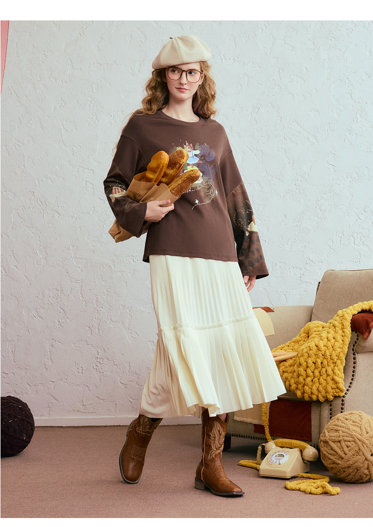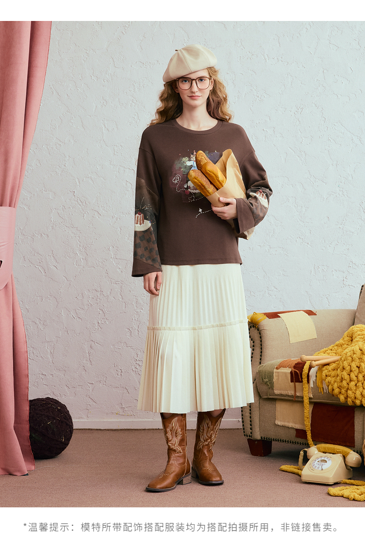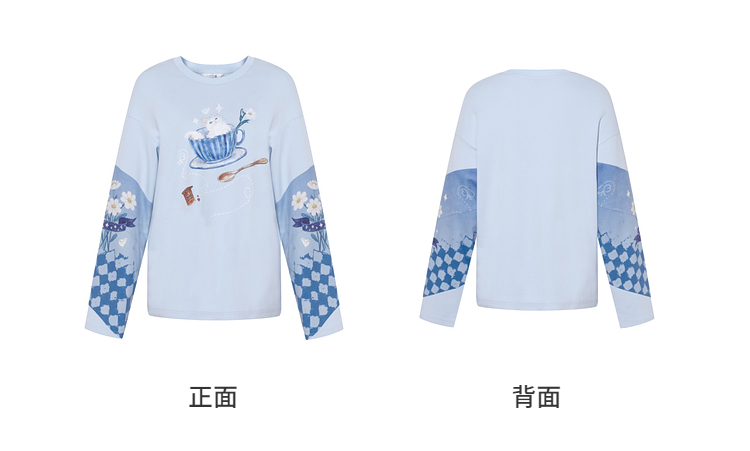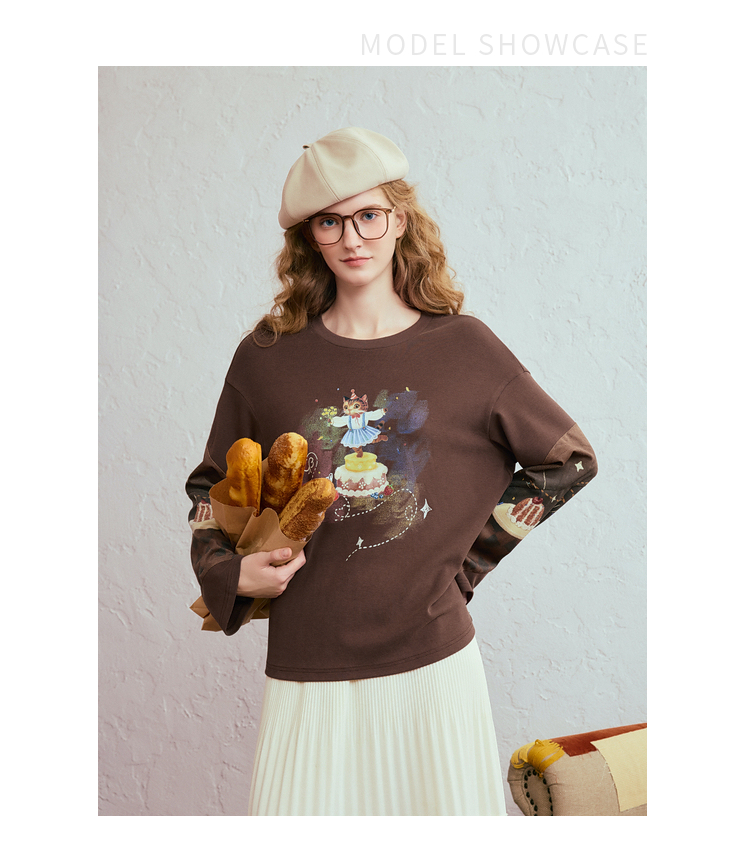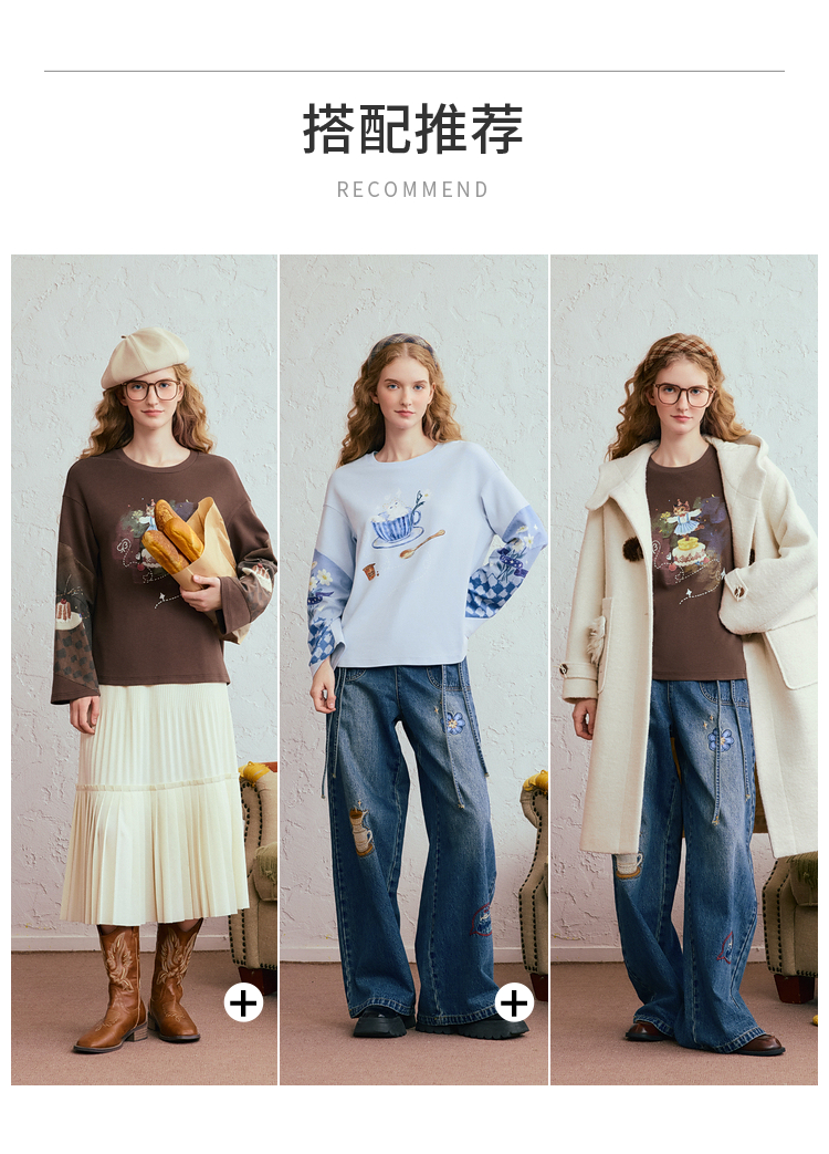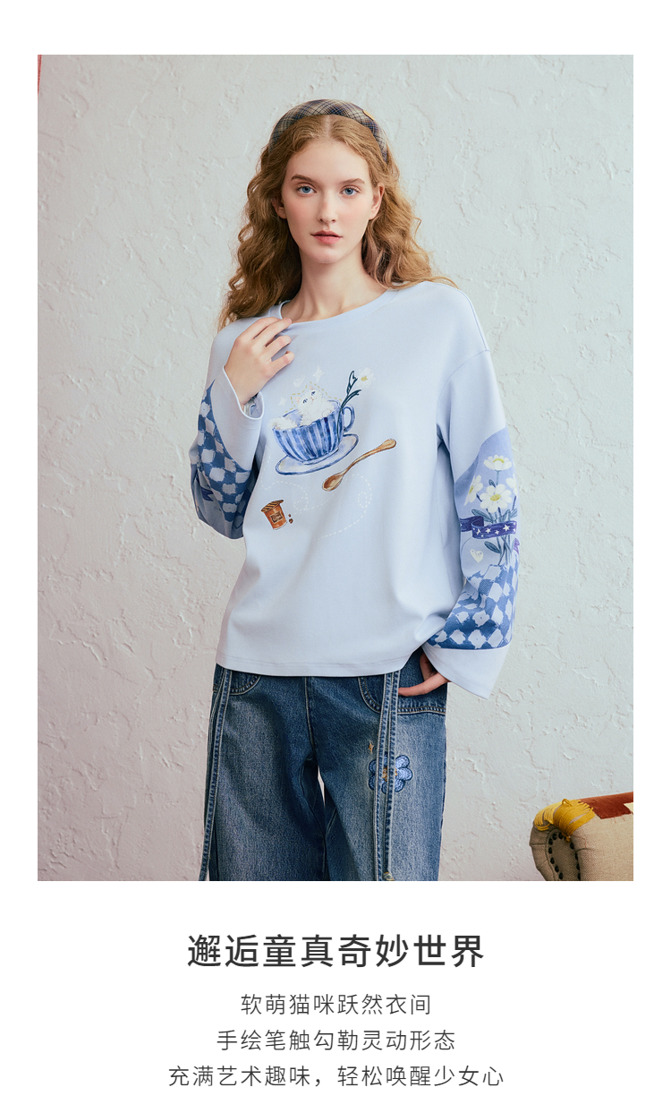 两三事 素写日常 2025冬季新款小清新印花拼接长袖t恤女宽松