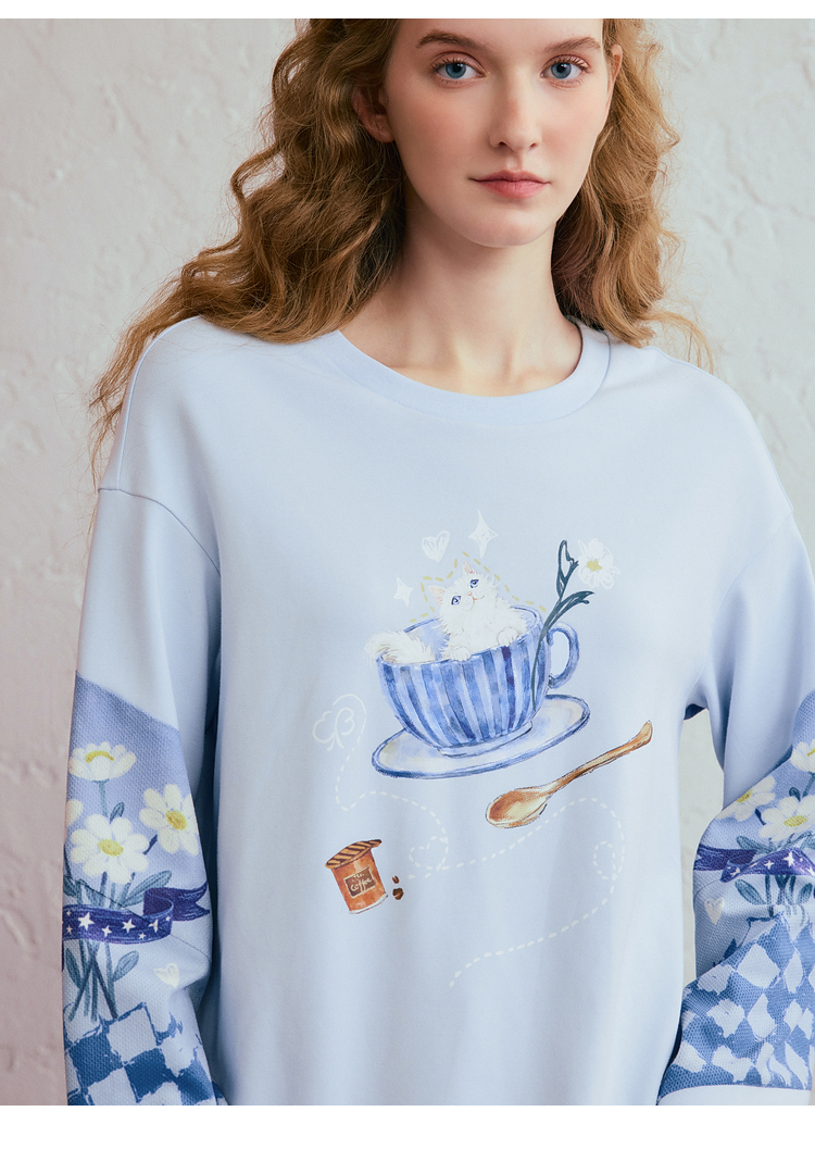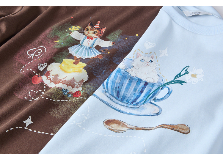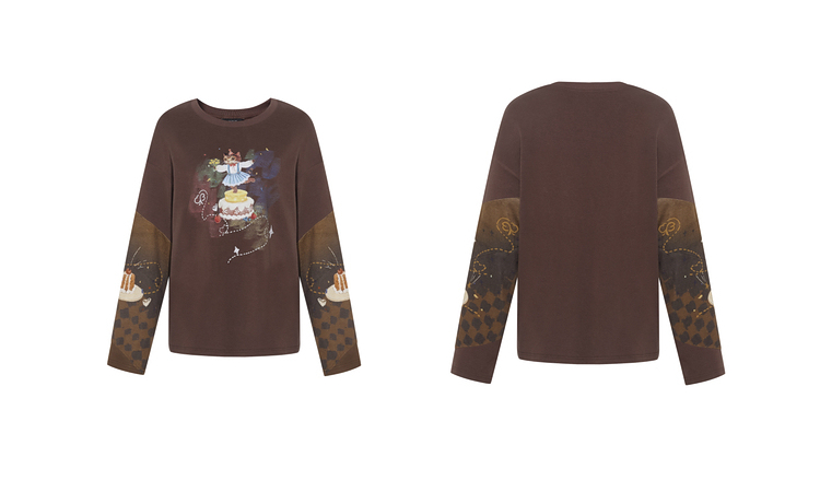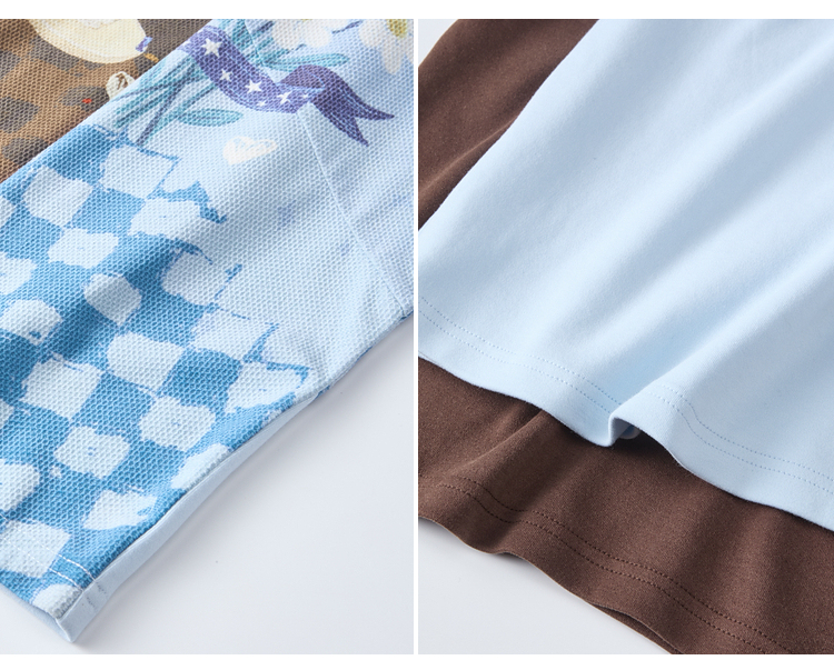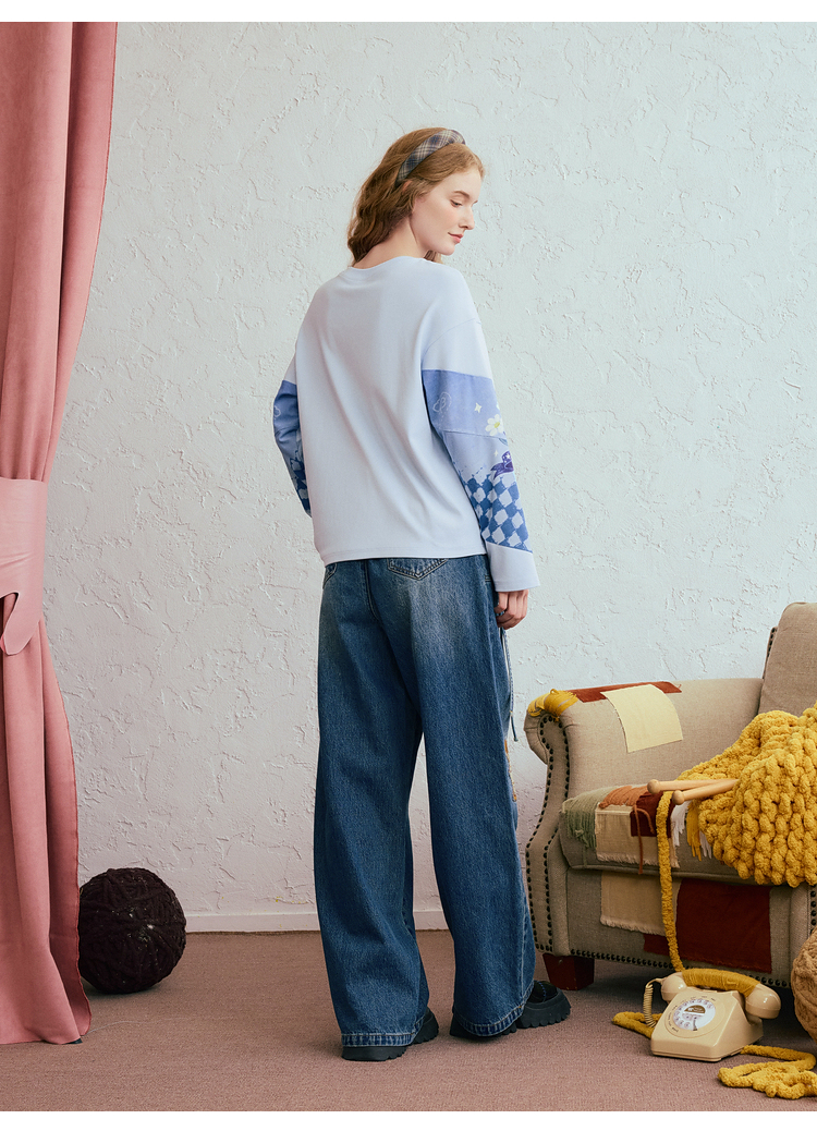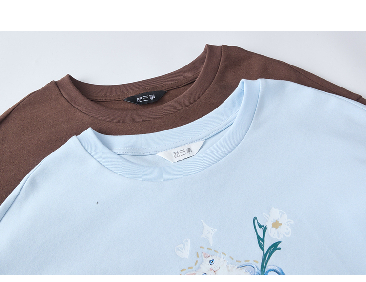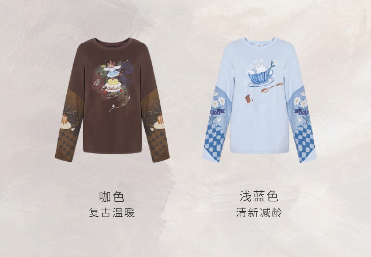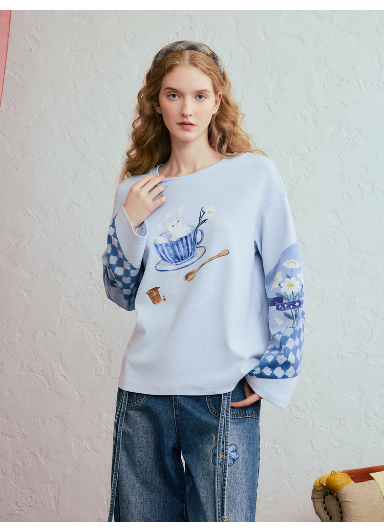 两三事 素写日常 2025冬季新款小清新印花拼接长袖t恤女宽松
