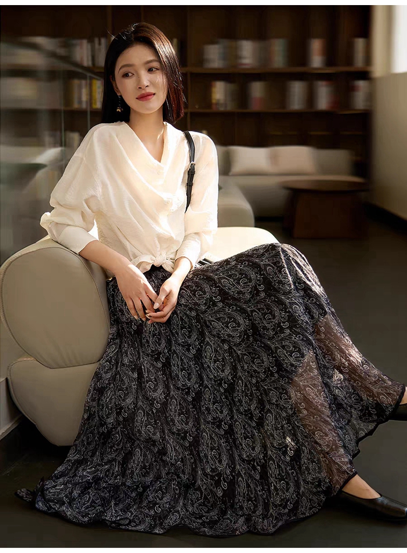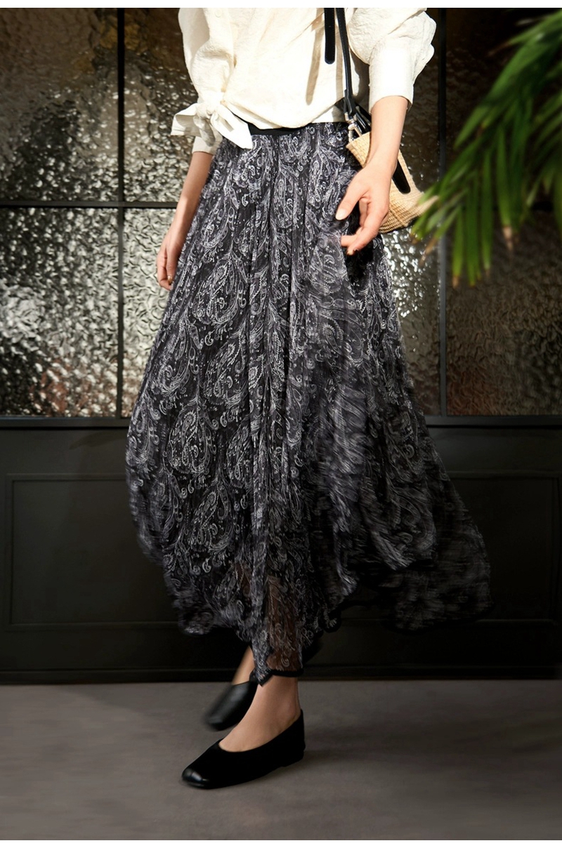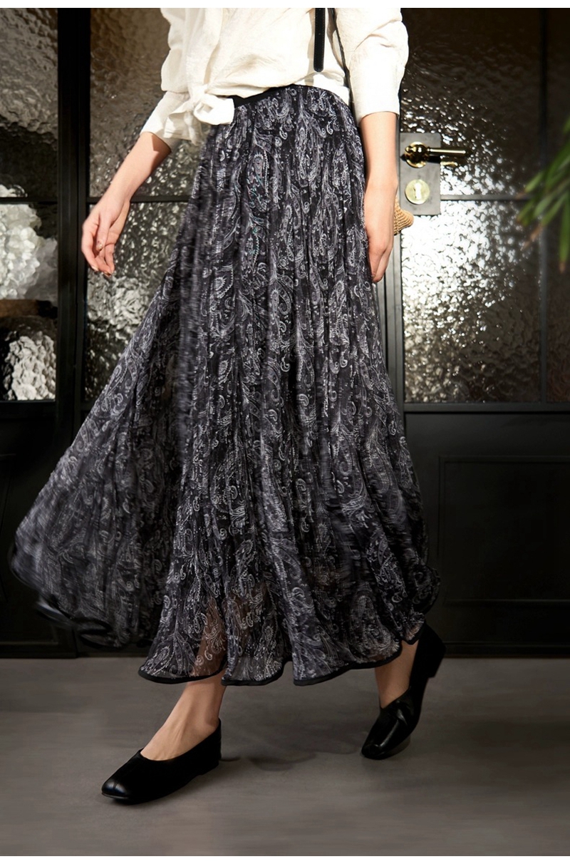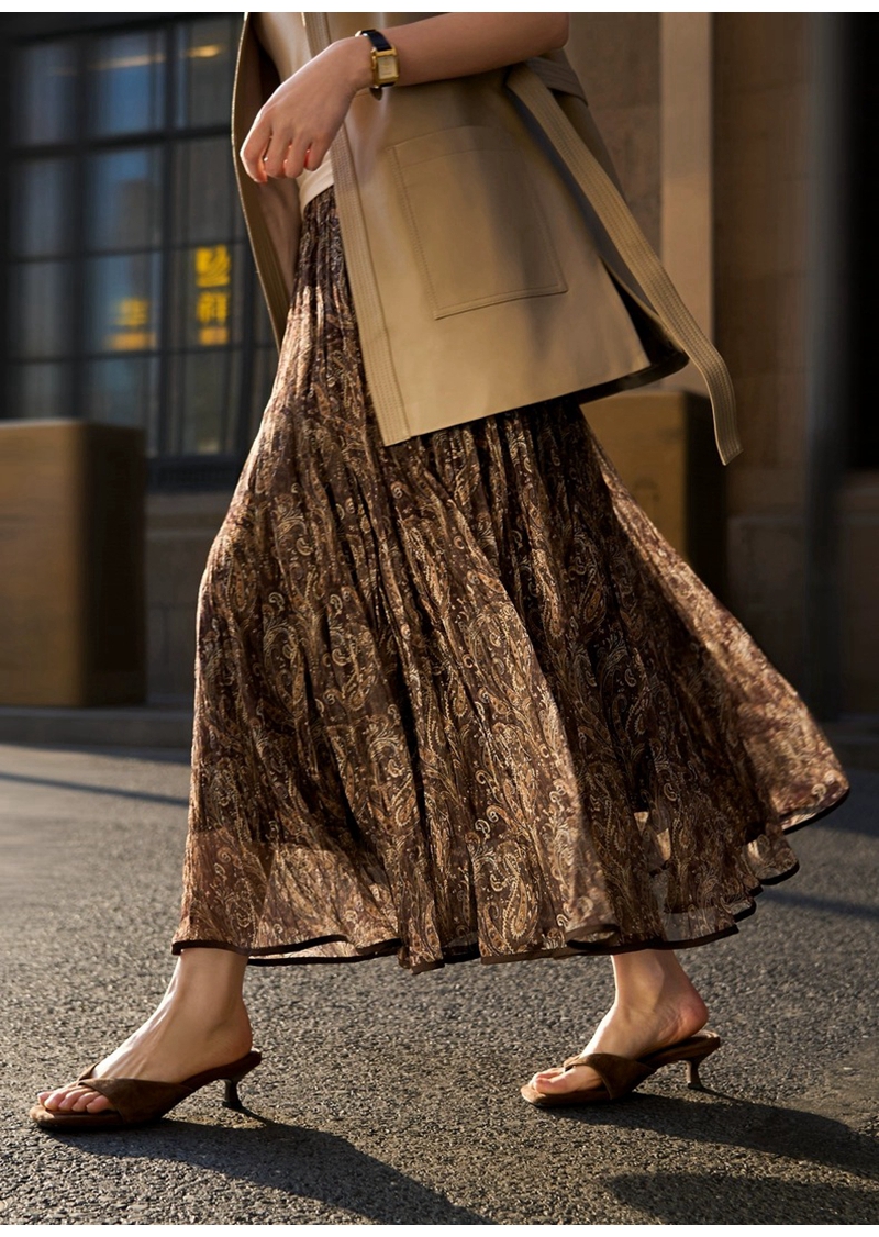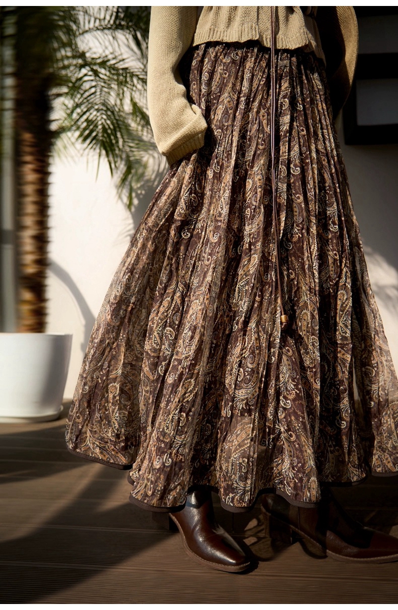 时尚高腰佩斯利花纹压褶大摆半身裙