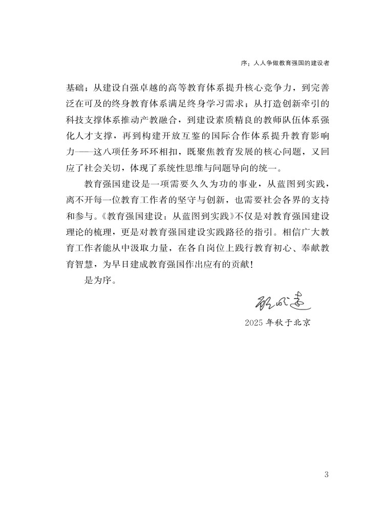 党的十八大以来,以习近平同志为核心的党中央坚持把教育作为国之大计、党之大计,作出加快教育现代化、建设教育强国的重大决策。2025年1月,中共中央、国务院印发《教育强国建设规划纲要(2024-2035年)》,对加快建设教育强国作出全面系统部署。《教育强国建设:从蓝图到实践》,以此为写作背景,从教育强国建设的重大意义、“三大属性”、“六大特质”,要正确处理的“五个重大关系”、“八大体系”,以及如何组织实施六个维度展开。本书的编写坚持学术性与实践性结合,坚持问题导向,内容详实、观点鲜明,以学术厚度和实践温度,为新时代教育强国建设提供“导航图”与“工具箱”,助力教育强国建设。