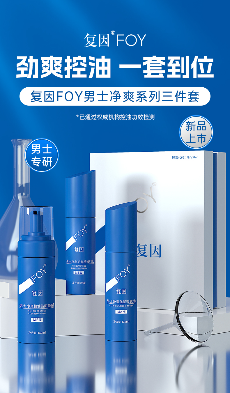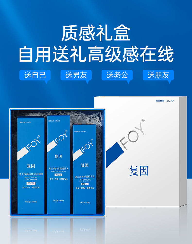 复因FOY男士净爽清洁保湿控油3件套装 (净爽平衡精华乳 100g+控油洁面慕斯150ml +净爽保湿爽肤水120ml )净爽控油 一套到位 清洁保湿控油锁水