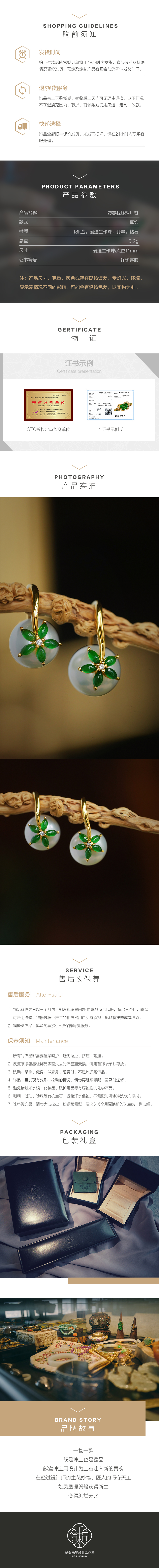龢盒原创 勿忘我18k金镶翡翠珍珠耳钉