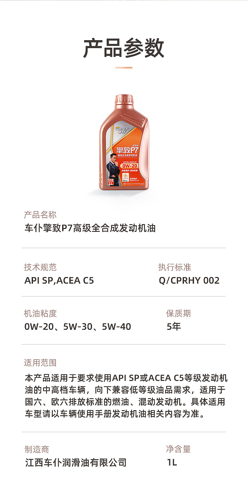 车仆官方正品擎致P7 0W20 5w30 5w40全合成润滑油汽车机油SP级1L