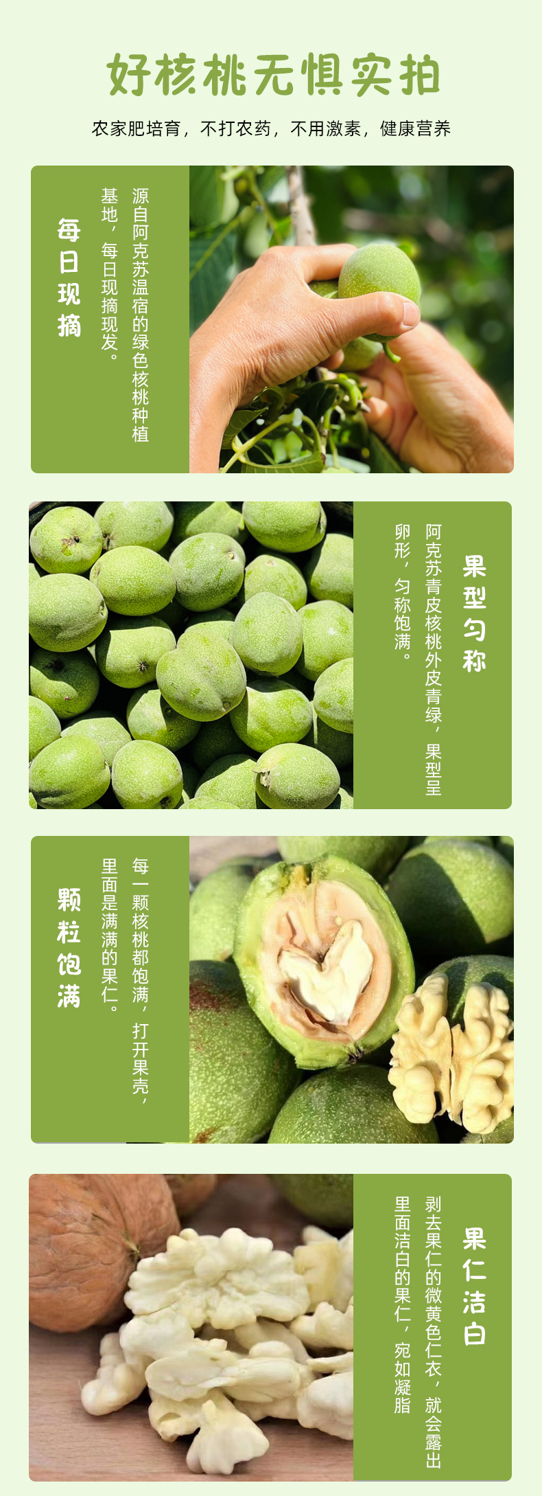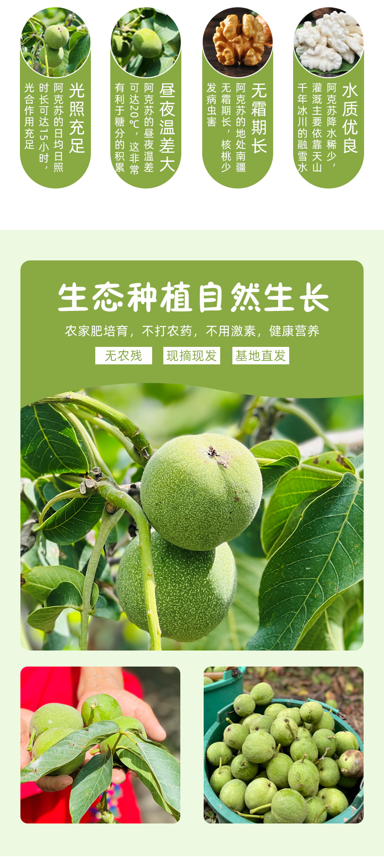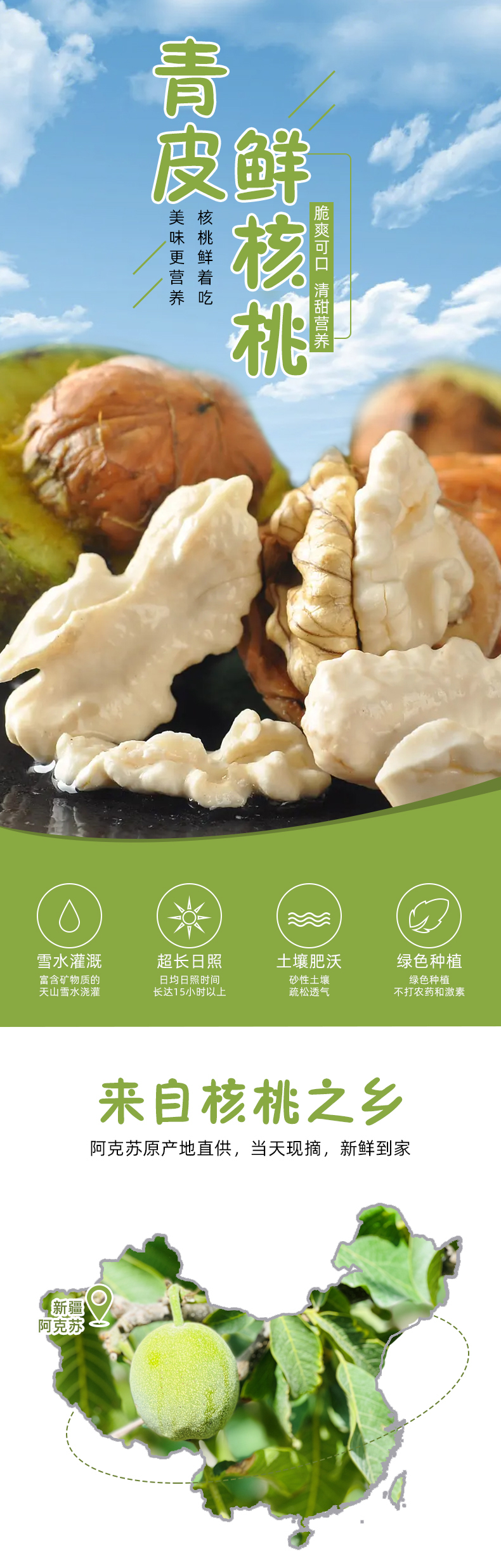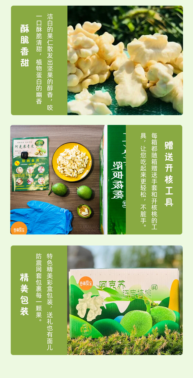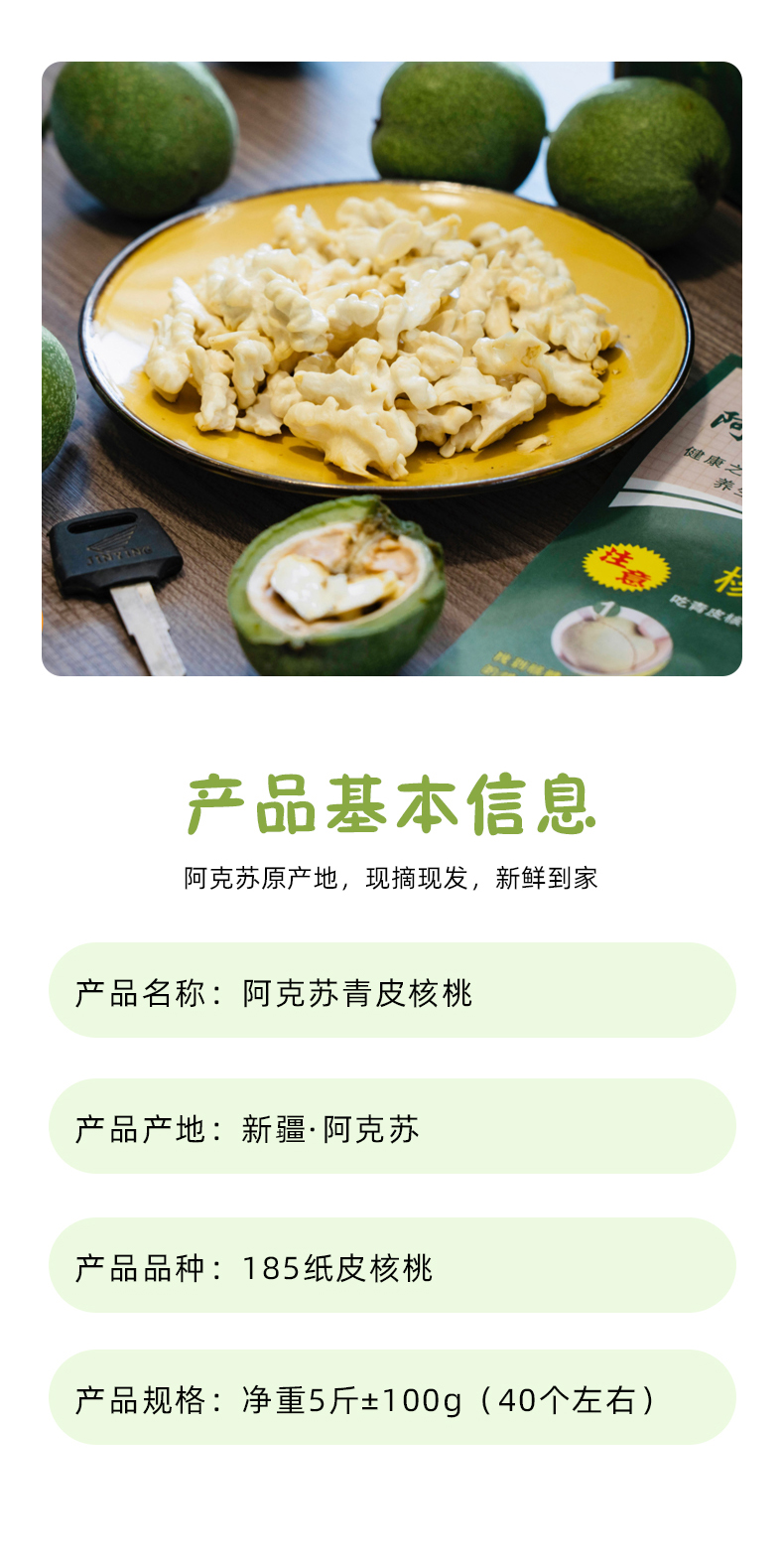 【卖点】8月阿克苏青皮核桃正当季,鲜核桃和干核桃相比,鲜核桃含有丰富的维生素,营养流失少,同时水分大,油脂低。鲜吃核桃不长胖,更健脑。