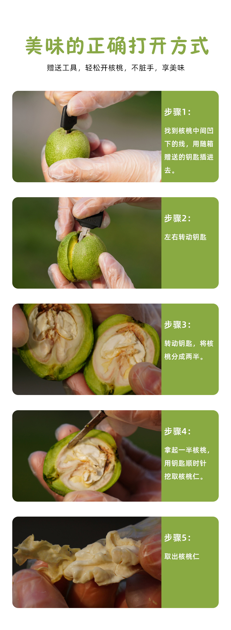 【青皮核桃食用说明】青皮核桃,皮薄易开。对第一次购买的客户,一定要让客户戴手套捏开,要正确的引导客户食用避免造成双手发黑的情况。