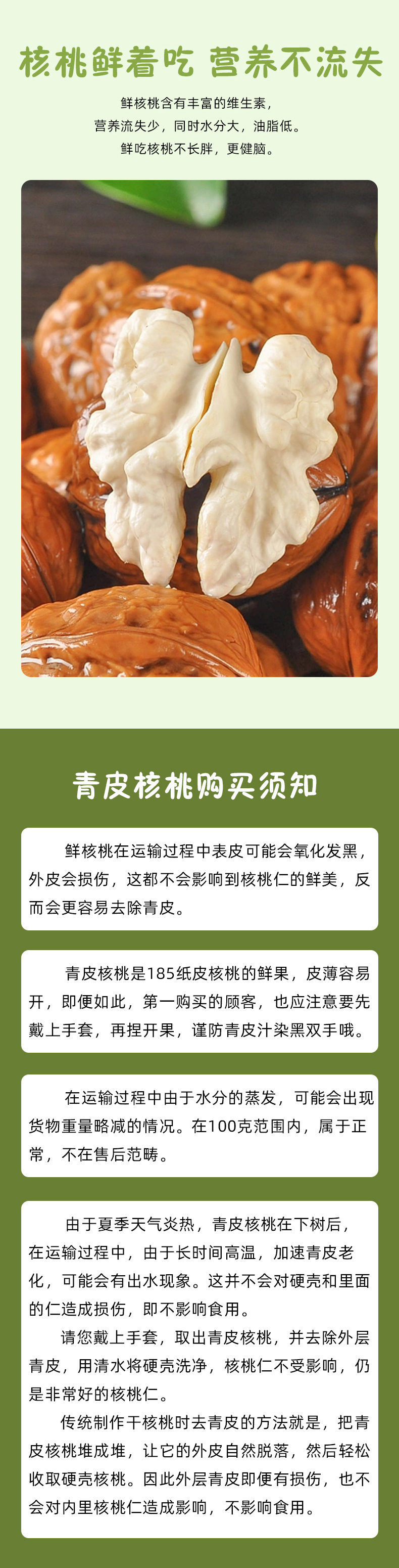 【特别说明】新鲜核桃在运输过程中表皮可能会氧化发黑,外皮会损伤,这都不会影响到核桃仁的鲜美、反而会更容易去除青皮。