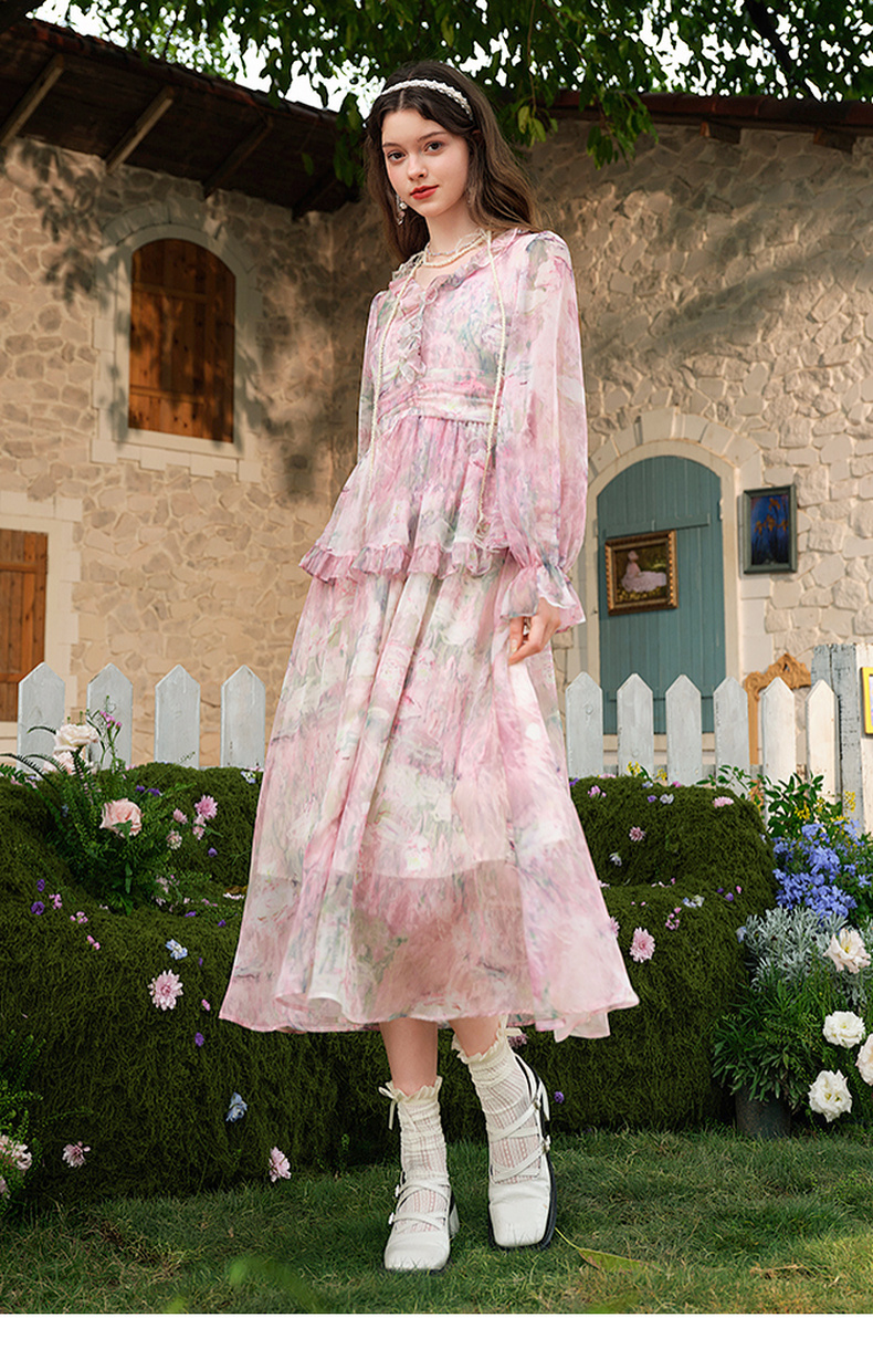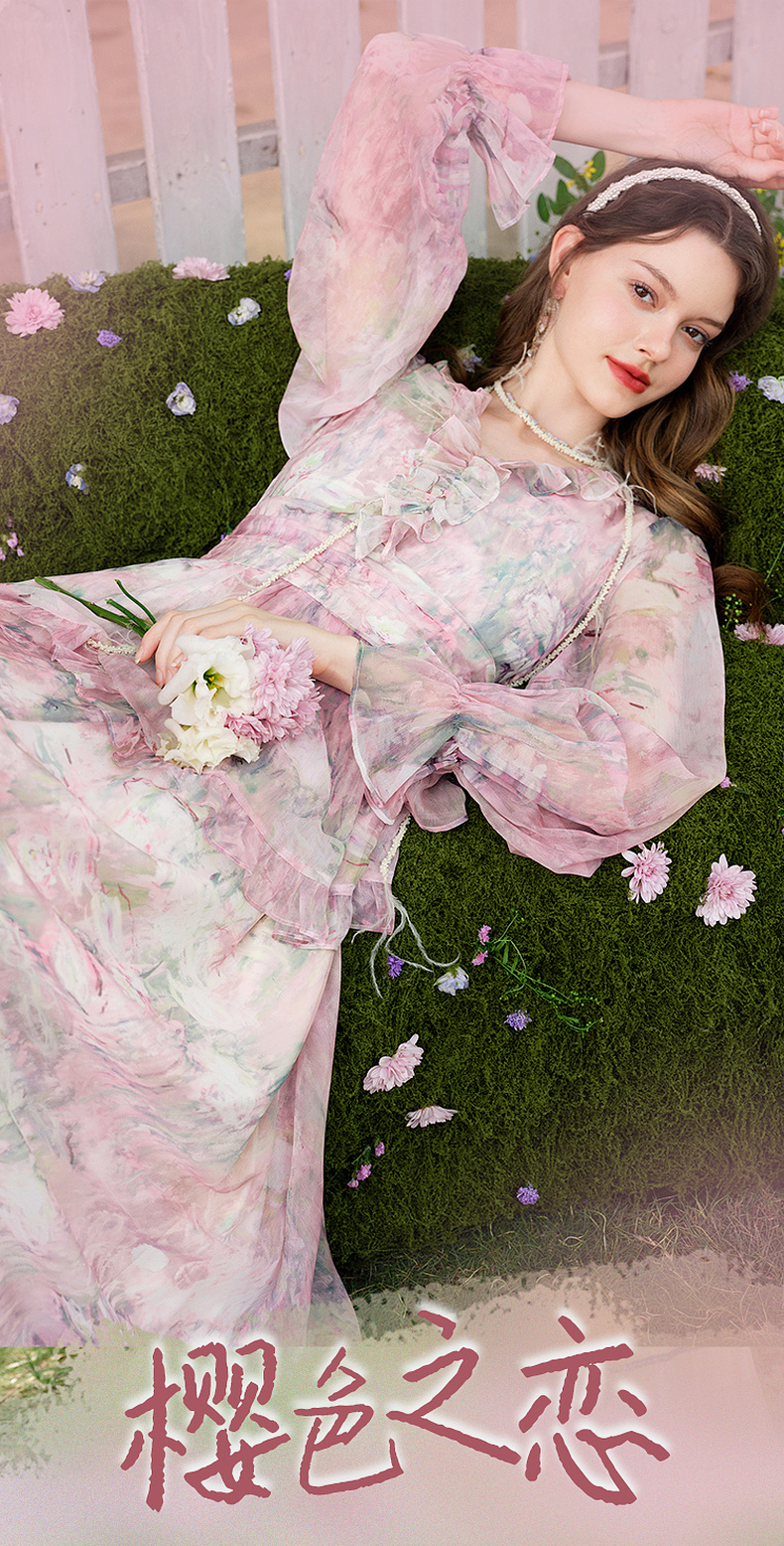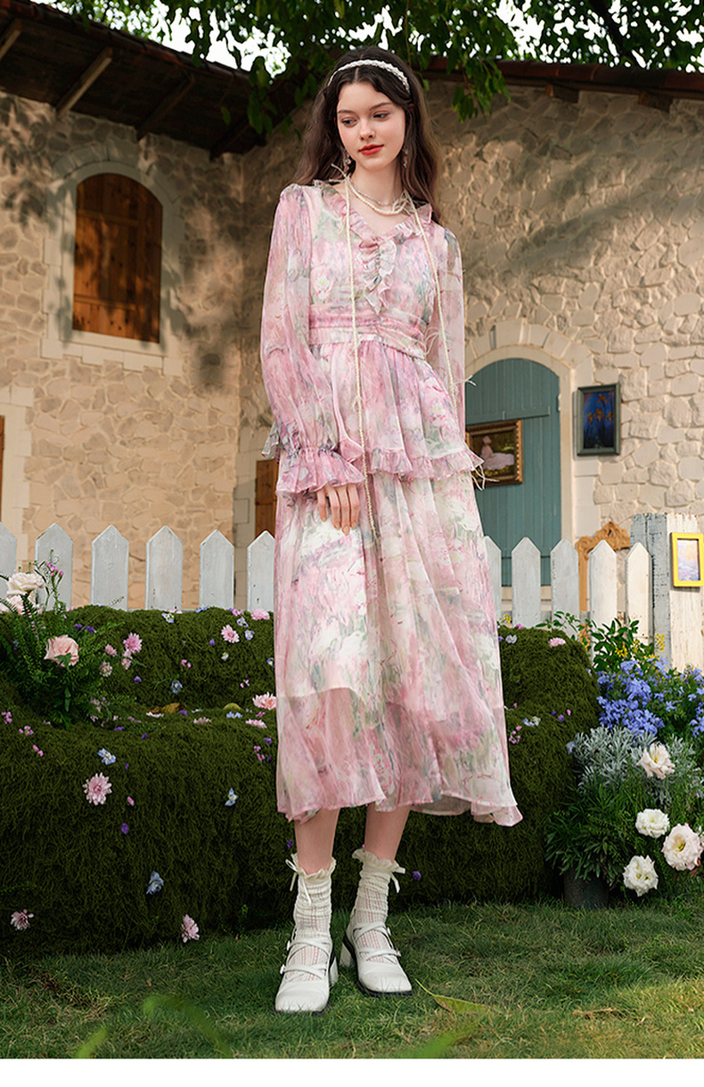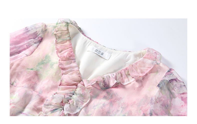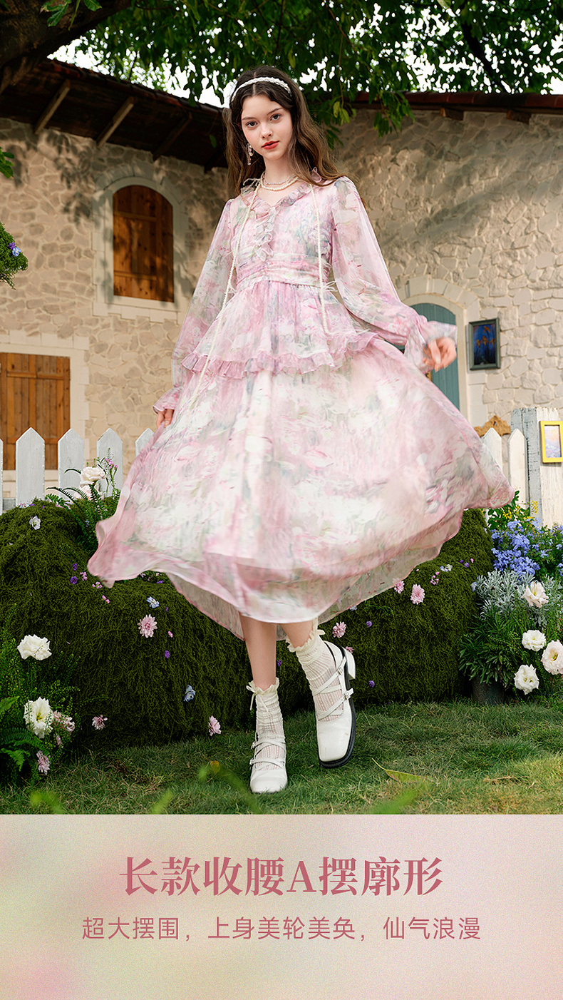 两三事 樱色之恋 2025春季新款荷叶边拼接印花雪纺连衣裙飘逸长裙
