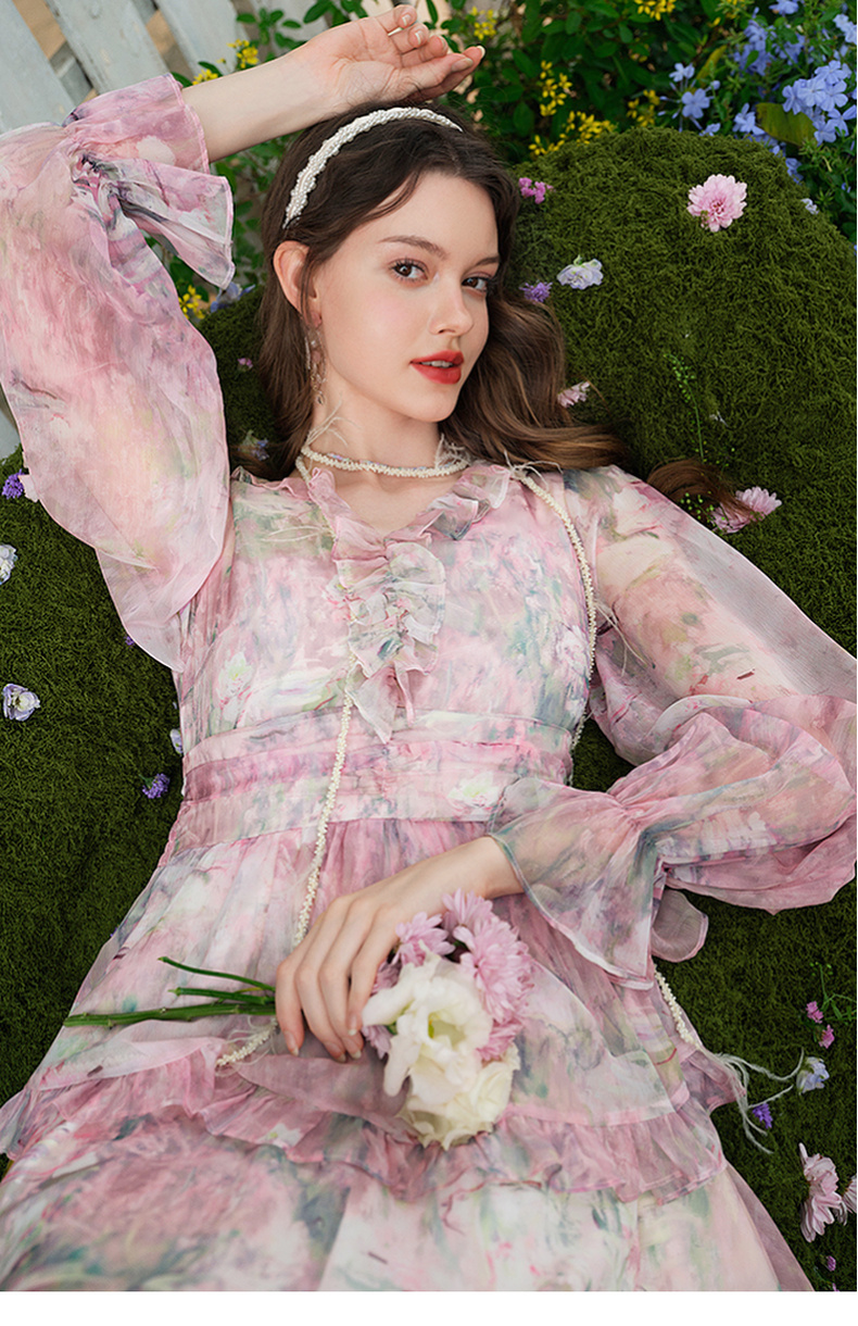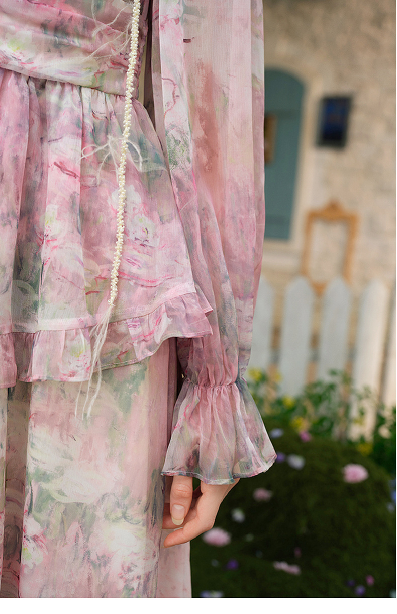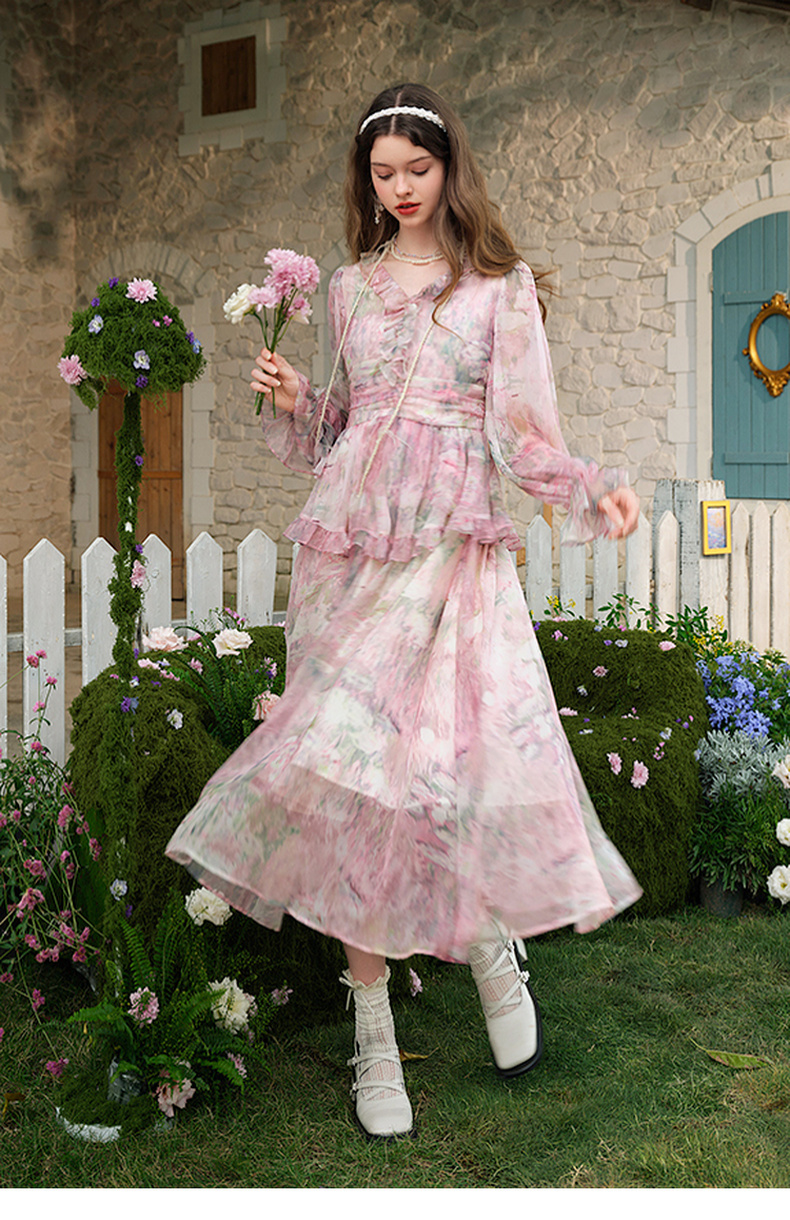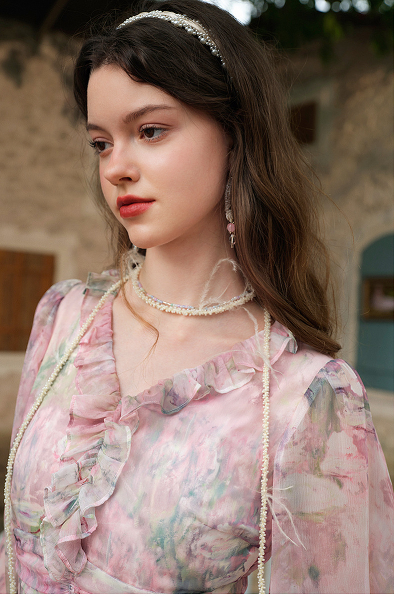 两三事 樱色之恋 2025春季新款荷叶边拼接印花雪纺连衣裙飘逸长裙