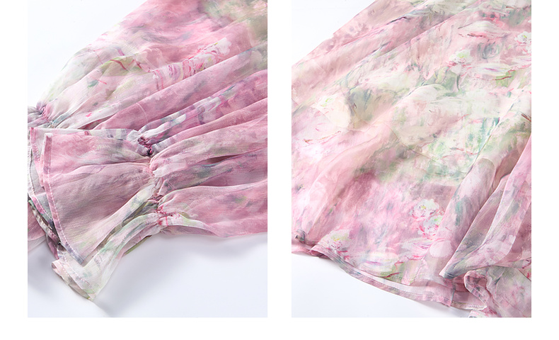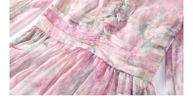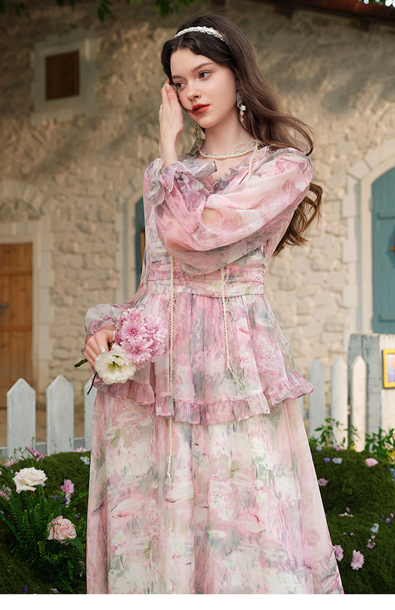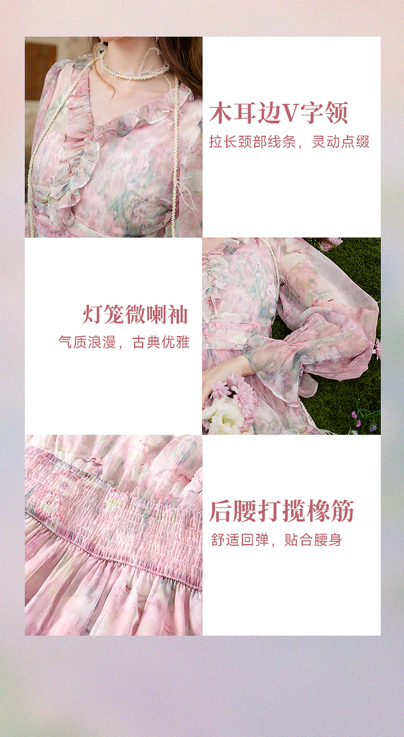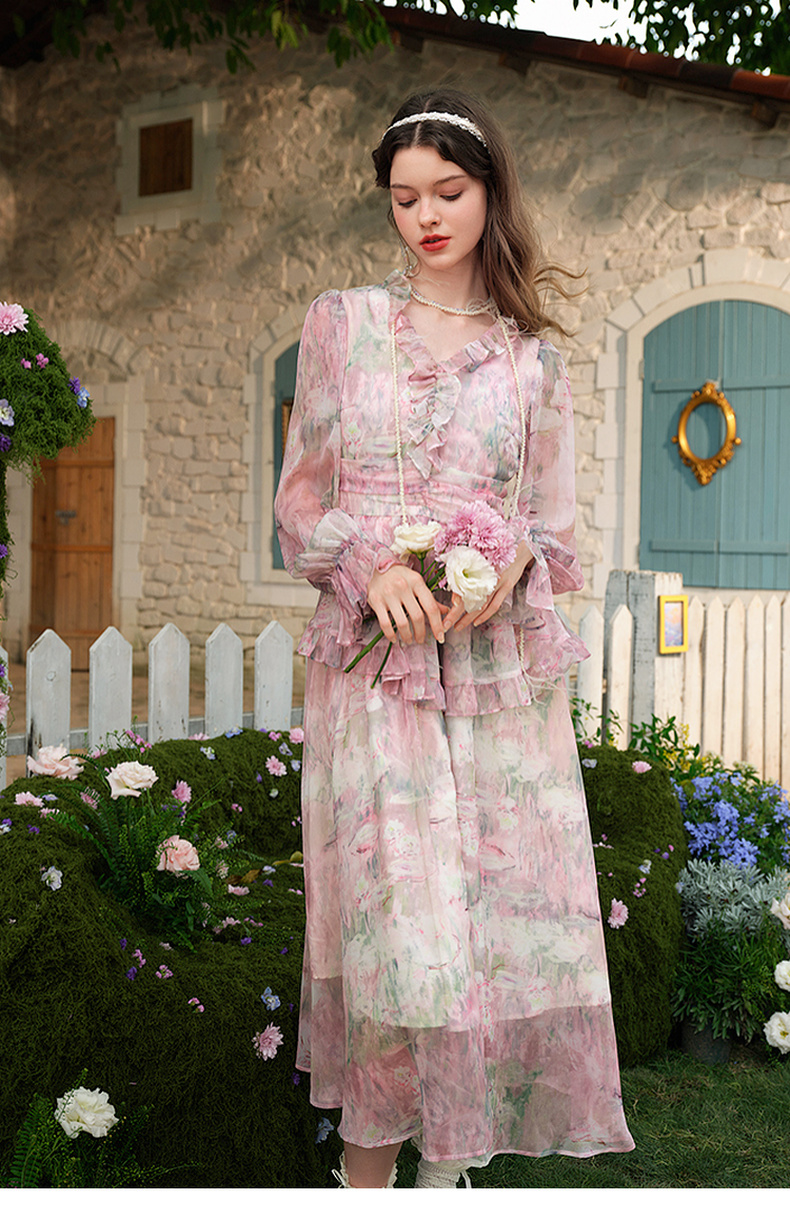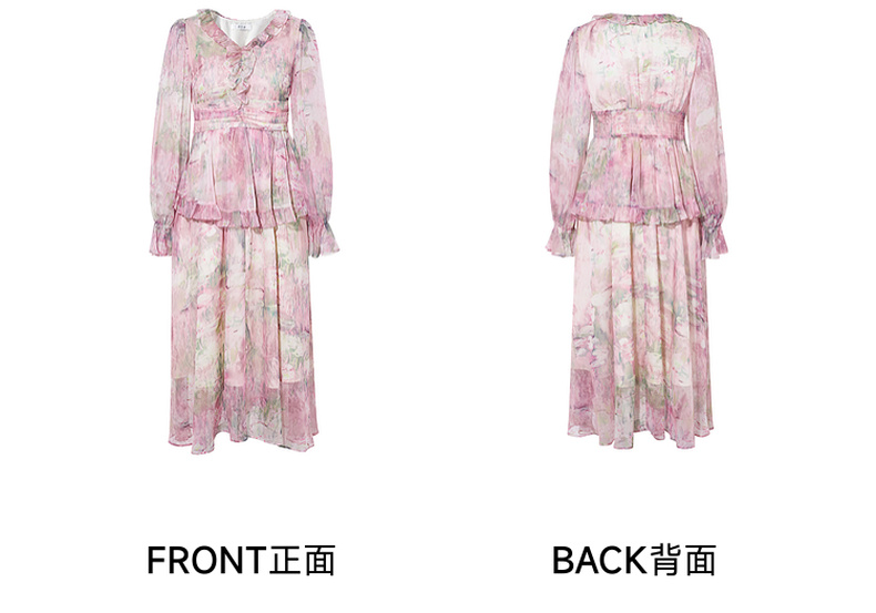 两三事 樱色之恋 2025春季新款荷叶边拼接印花雪纺连衣裙飘逸长裙