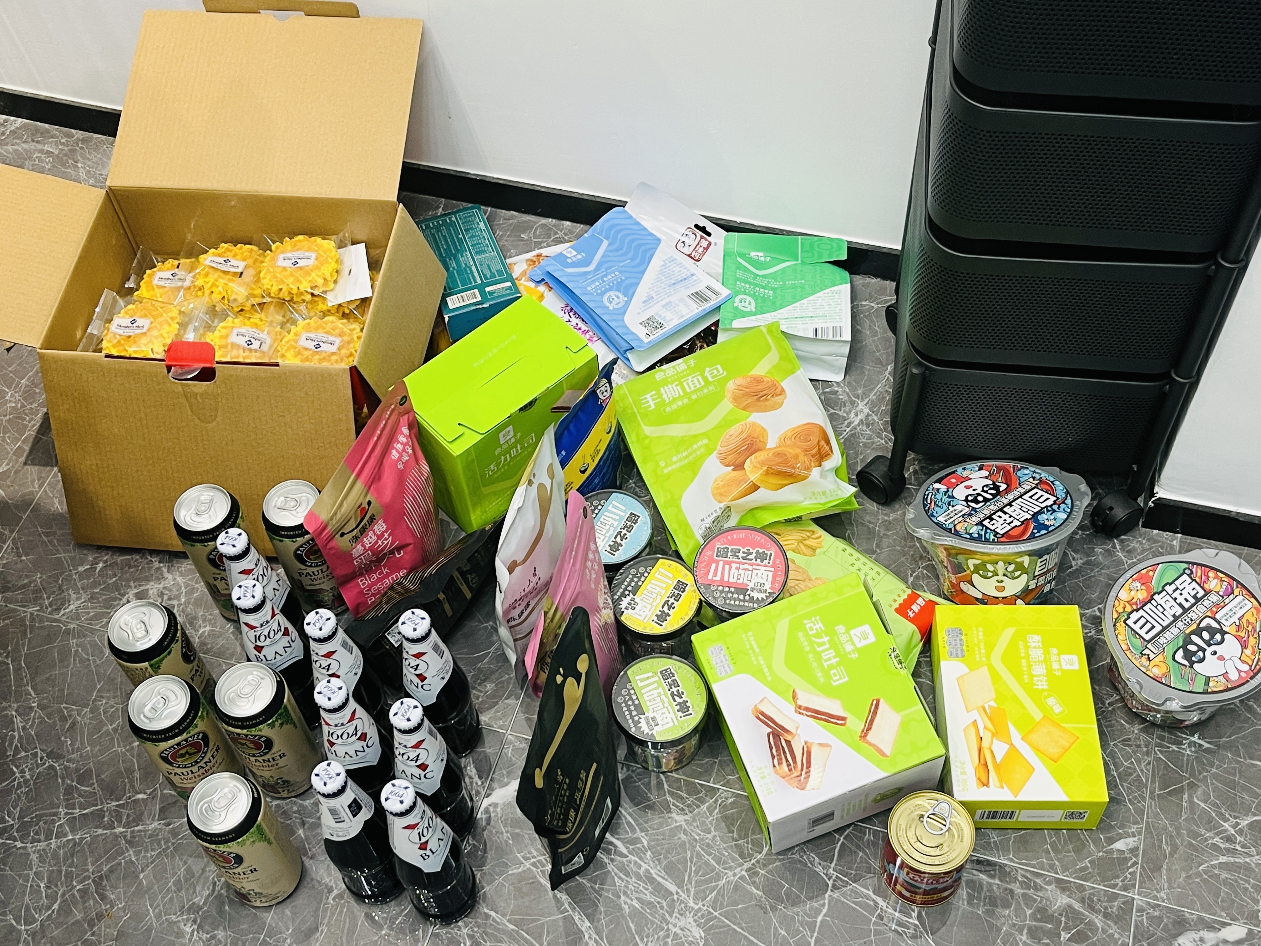 洗漱用品、囤的姨妈巾和纸巾、零食