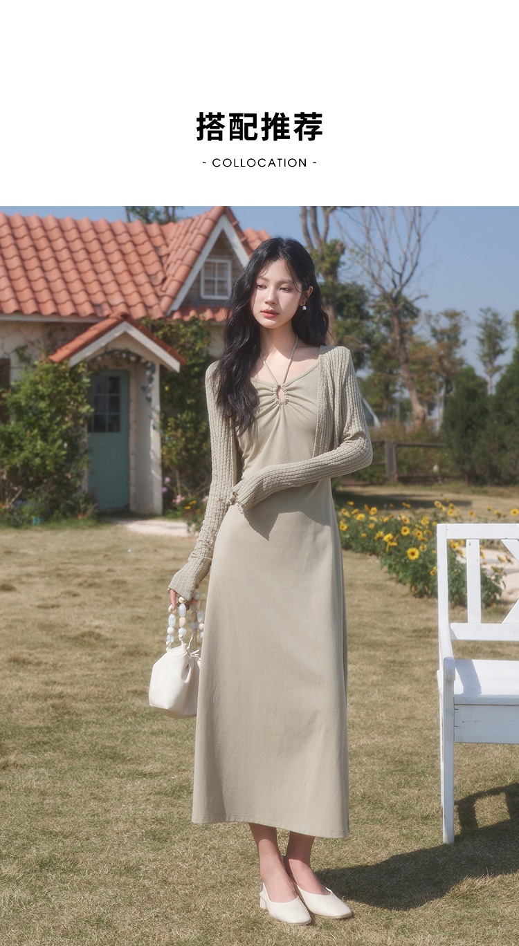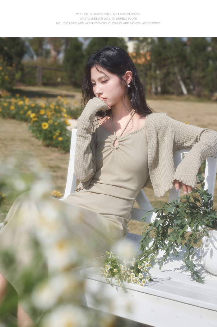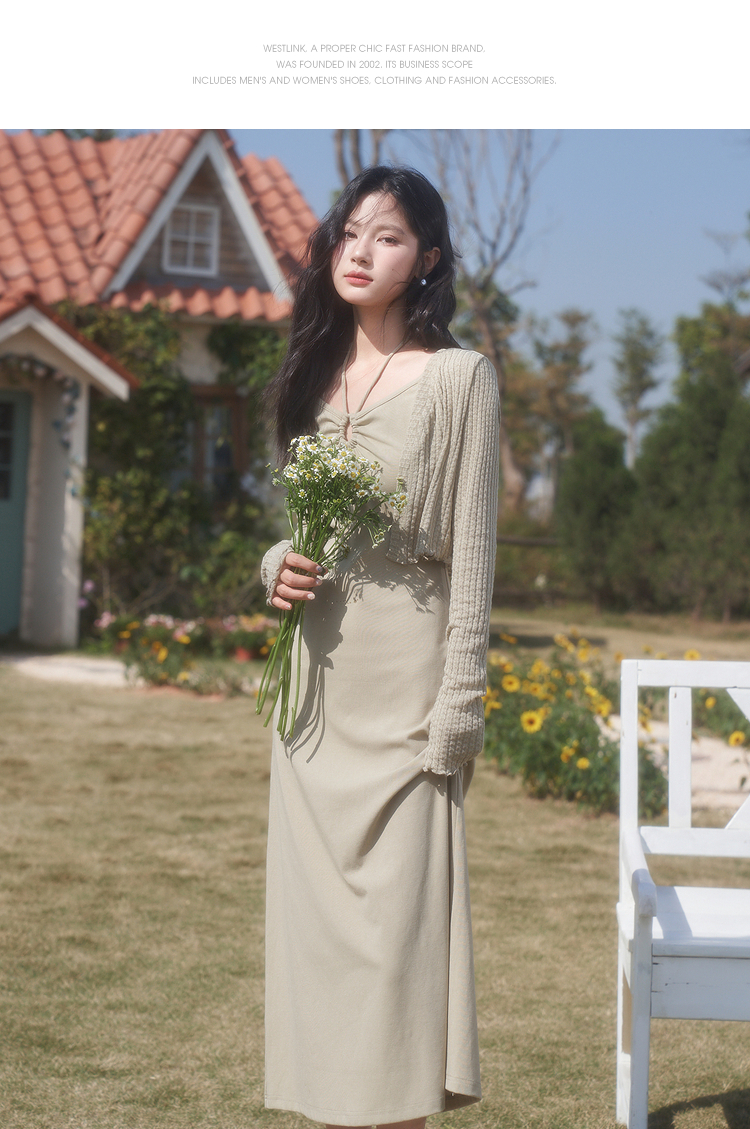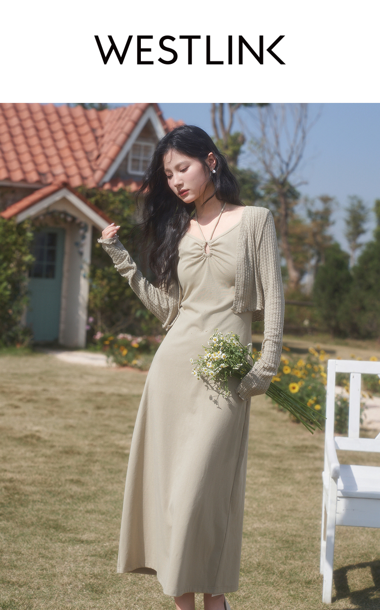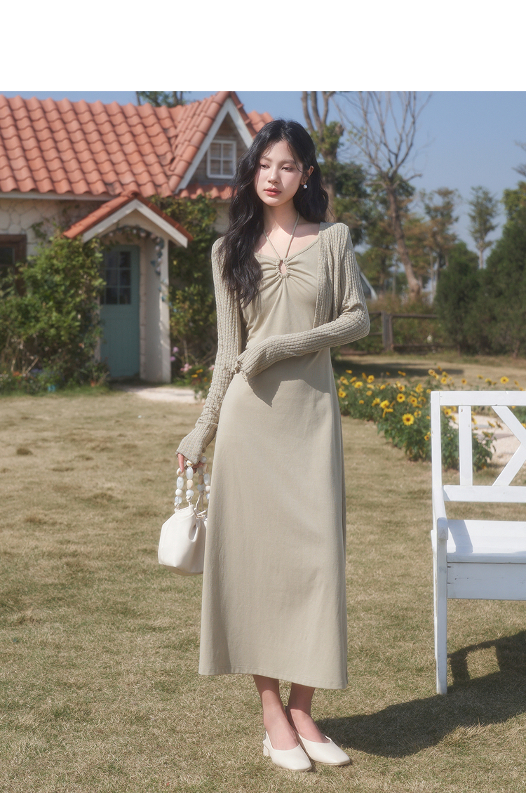 温柔慵懒两件套新款镂空缎面吊带连衣裙搭长袖针织衫V0440243
