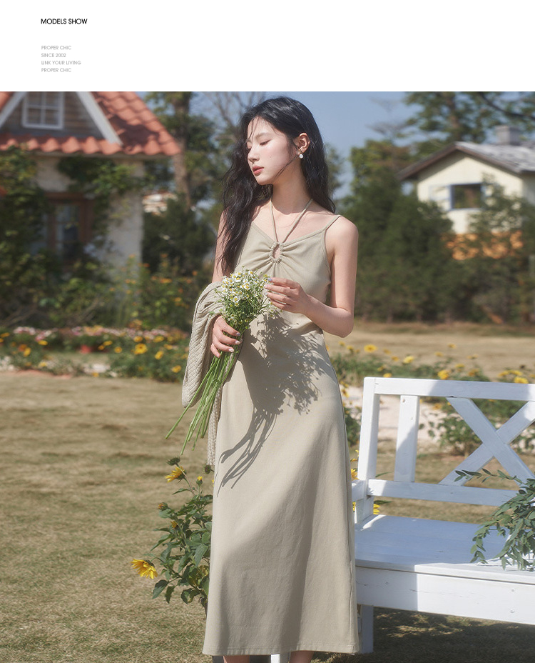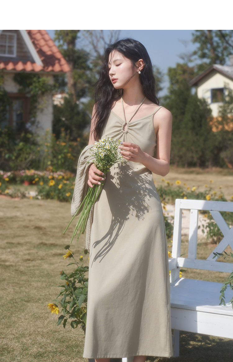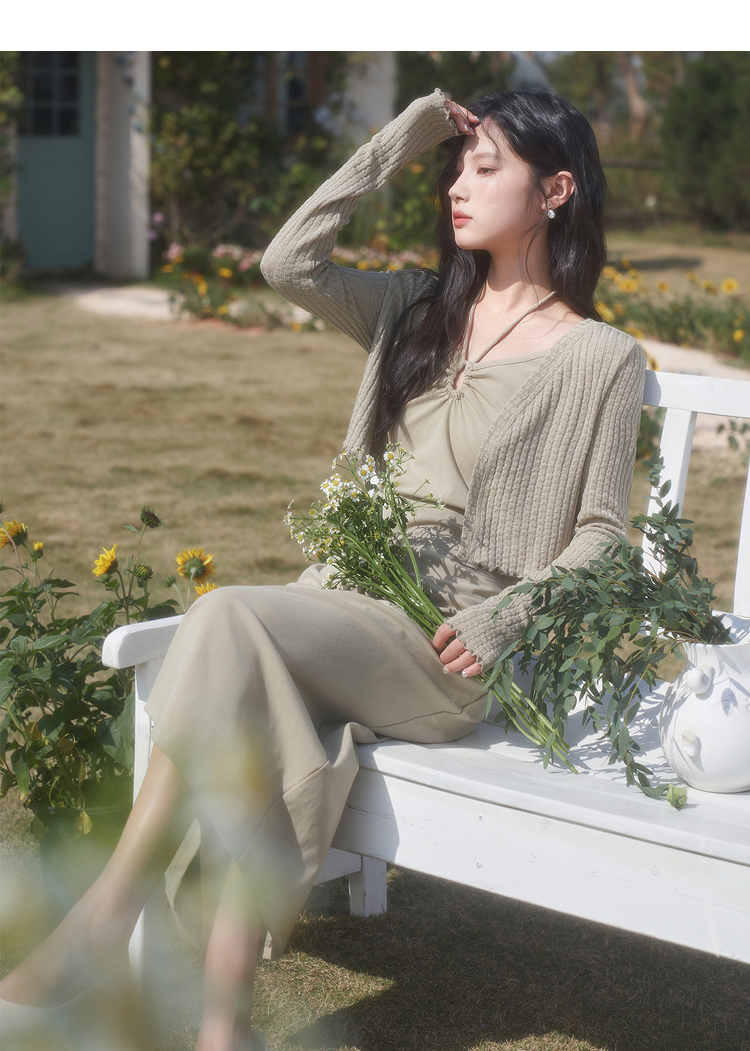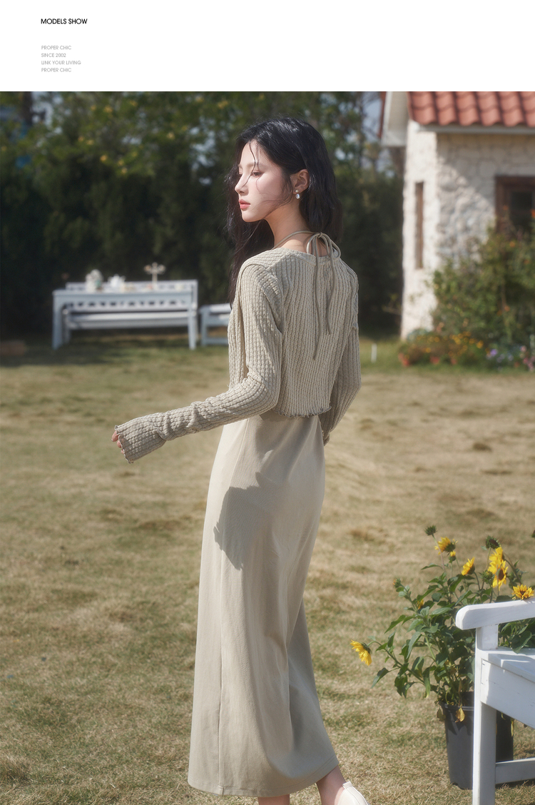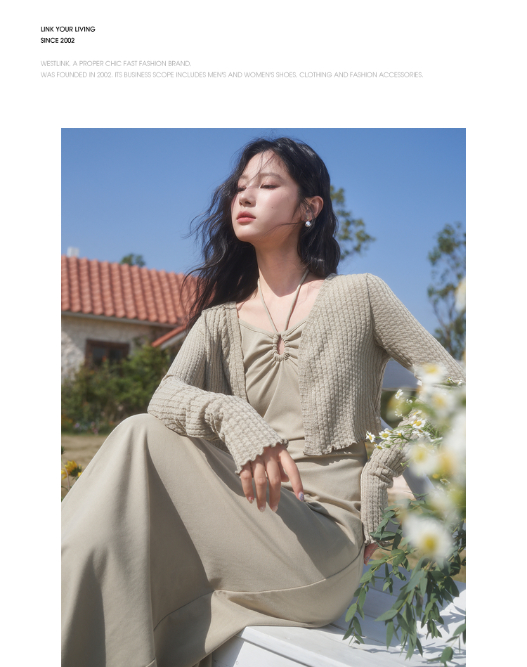 温柔慵懒两件套新款镂空缎面吊带连衣裙搭长袖针织衫V0440243