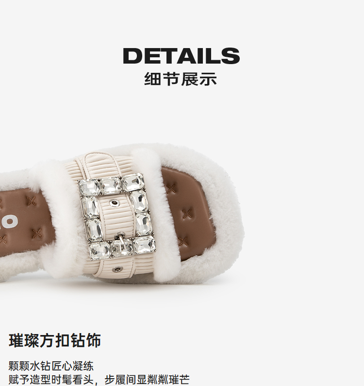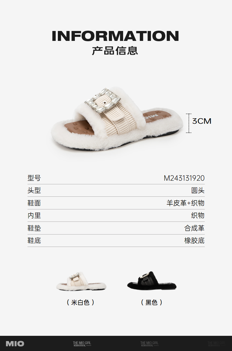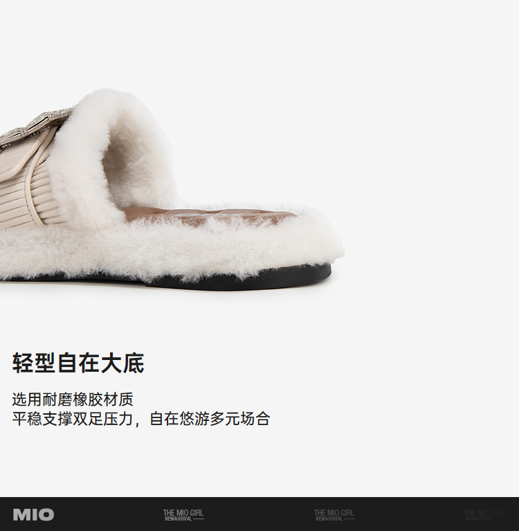 MIO米奥夏季低跟拖鞋方扣钻饰舒适慵懒一字拖毛毛拖女M243131920