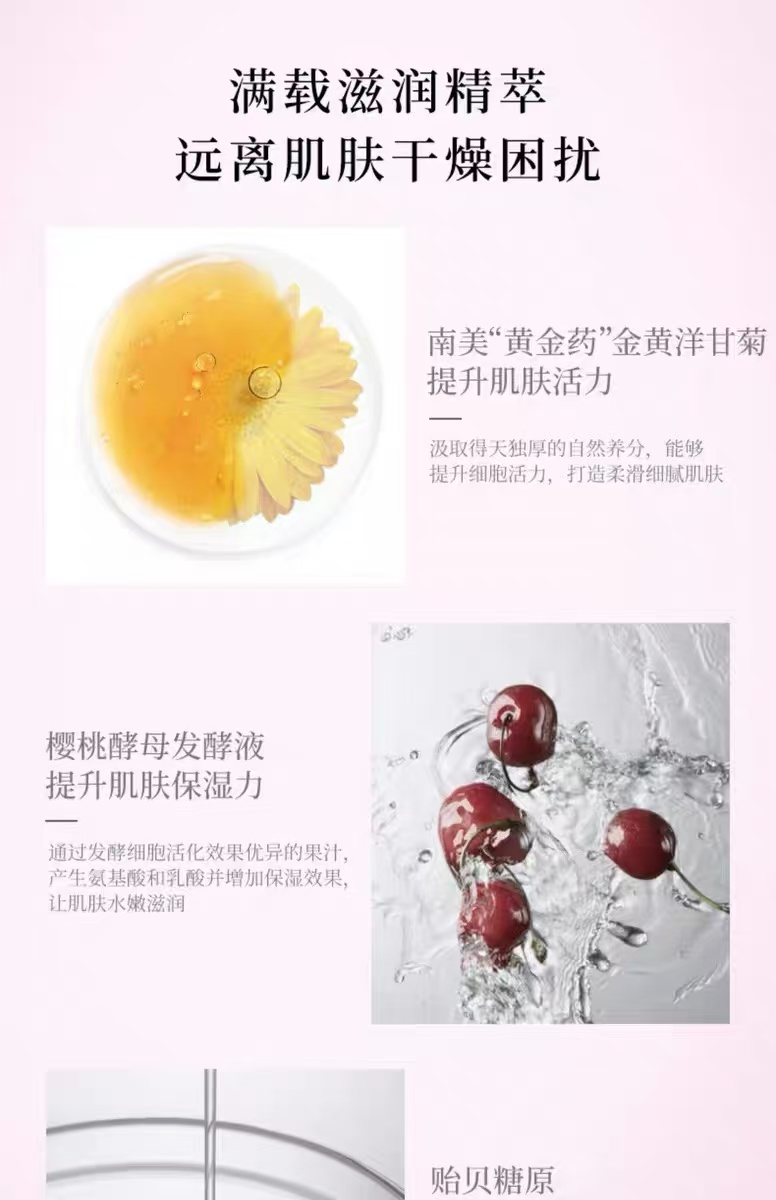 含有洋甘菊+樱桃发酵液+贻贝糖原,核心的面护成分,在按摩的同时源源不断的输送到皮脂深处,越揉皮肤状态越好!