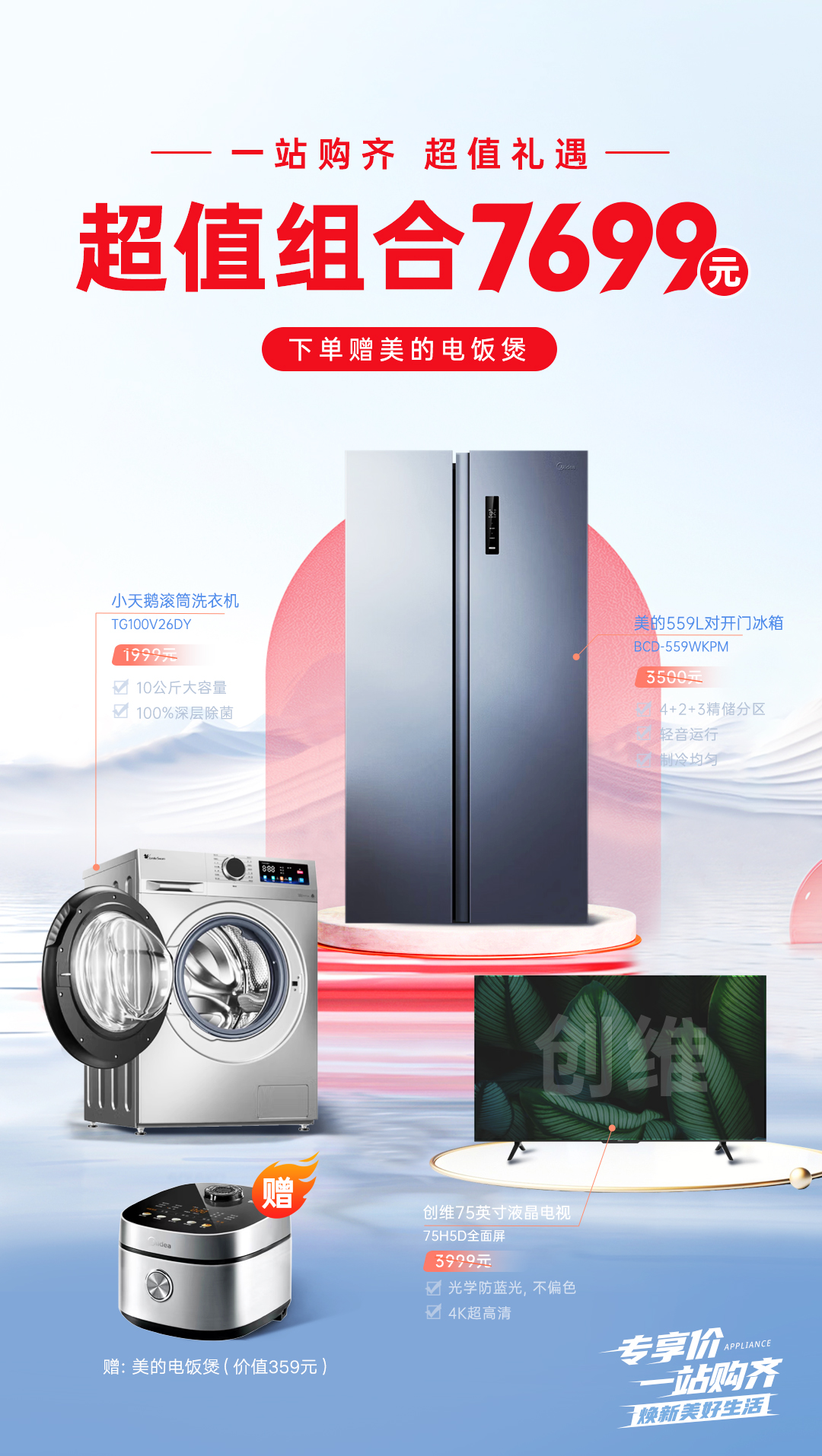 LR【家电组合三件(赠美的电饭煲)】小天鹅超微净泡洗衣机TG100V + 美的559L对开门冰箱 BCD-559WKPM + 创维75英寸液晶电视 75H5D全面屏