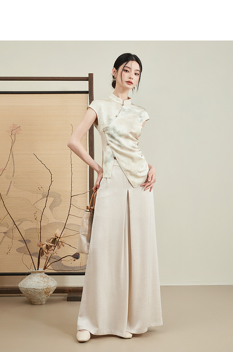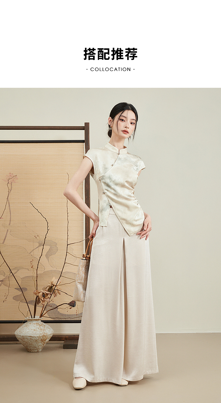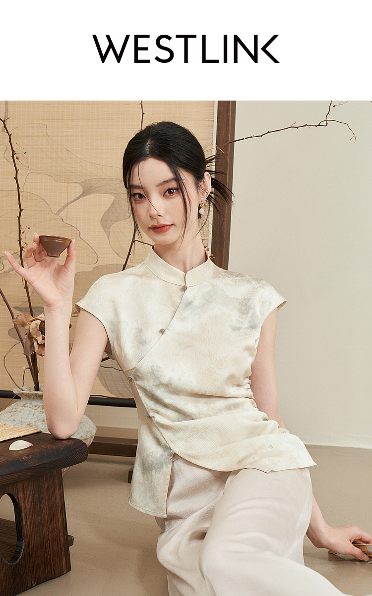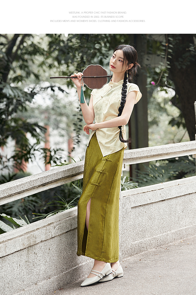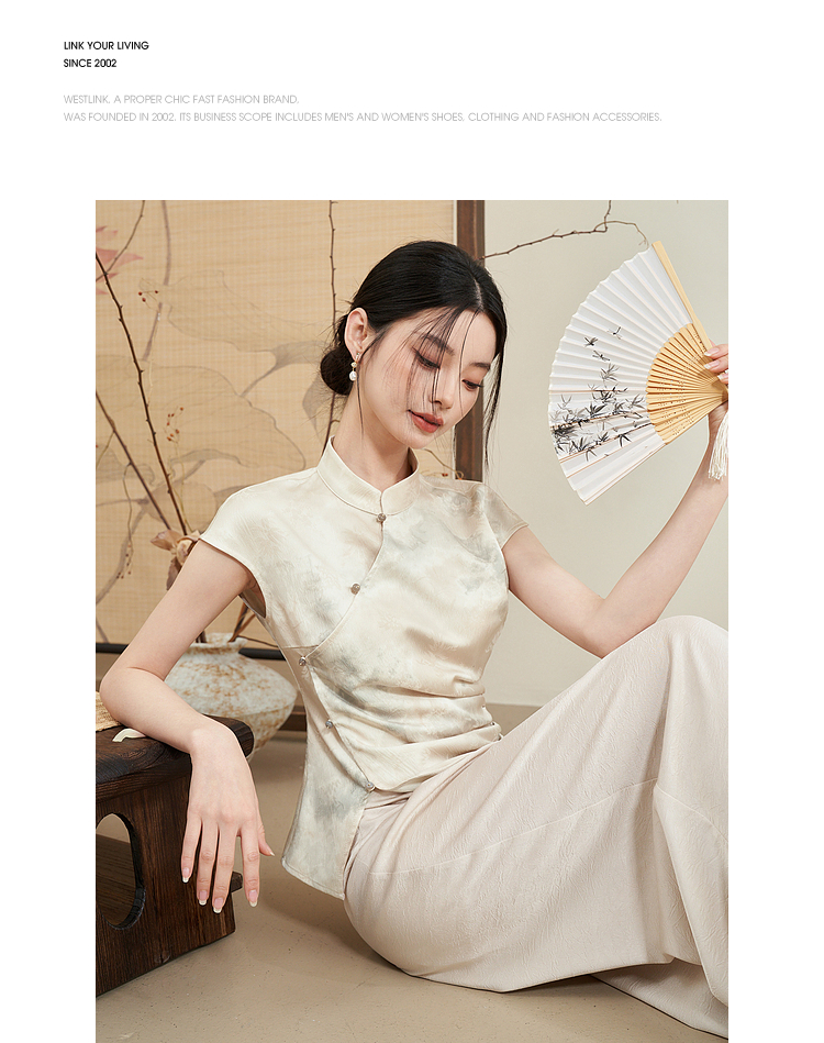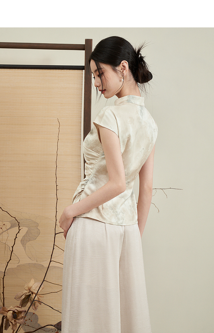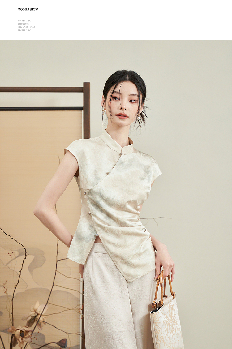 新中式国风不规则开襟珠扣短袖衬衫新款古典温婉衬衣V0440186