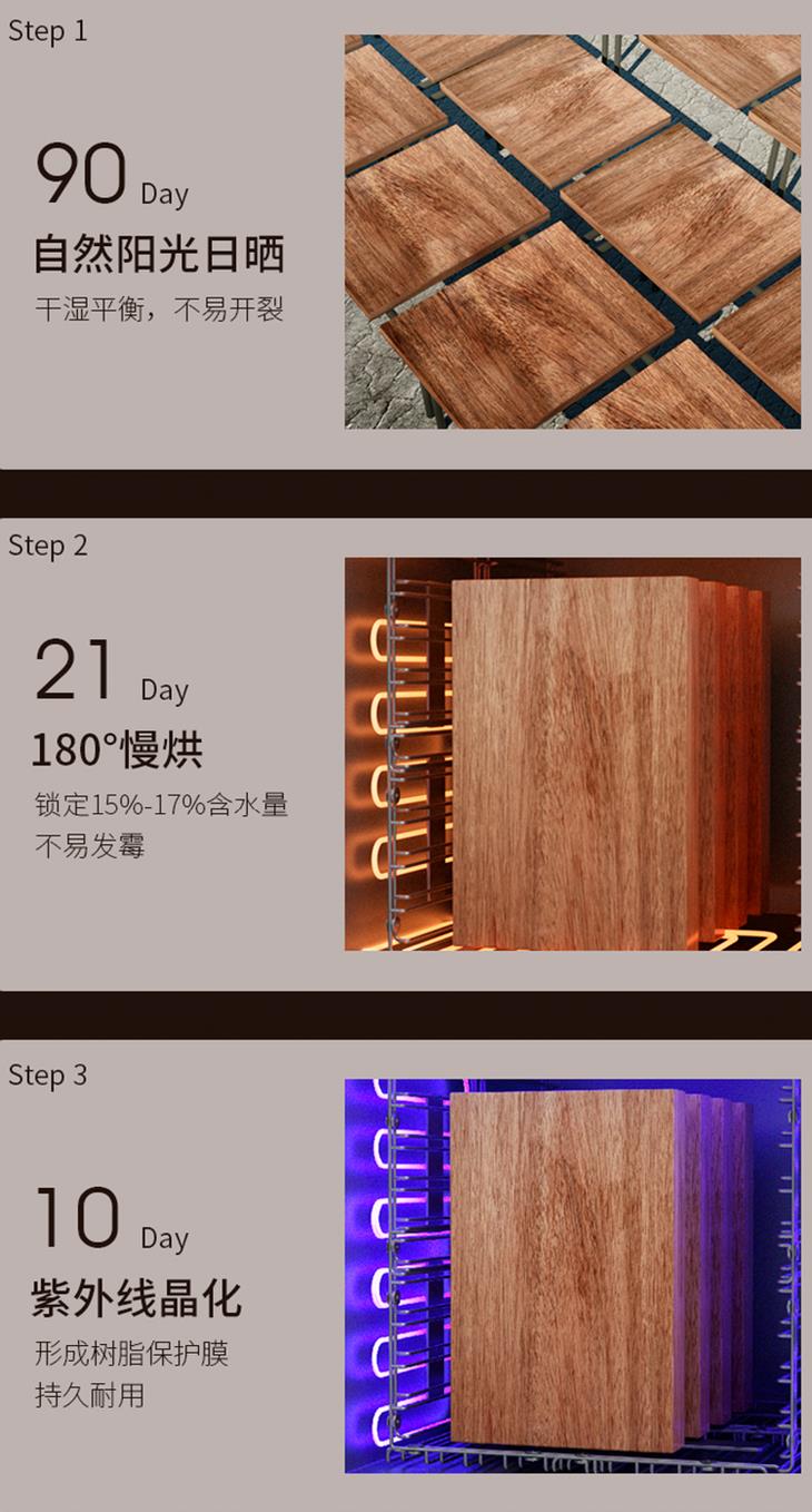 要90天的自然阳光日晒,保证木材干湿平衡,不易开裂。