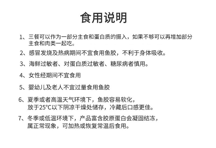 6.夏季或者高温天气环境下,鱼胶容易软化,放于25℃以下阴凉干燥处储存,冷藏后口感更佳。