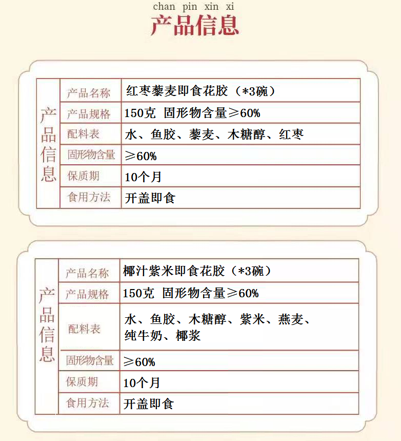 7.冬季或低温环境下,产品富含胶原蛋白会凝固结冻,属正常现象,可加热或恢复常温后食用。