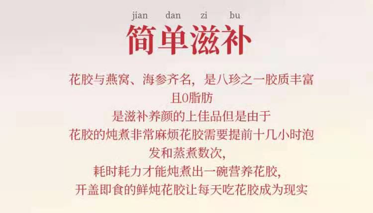 【滋补佳品上新!】开盖即食鲜炖花胶 满满的胶质 无添加防腐剂 150g*6碗装 固型物含量大于60% 每碗干胶投料10g,2种口味,3种规格, 保质期10个月