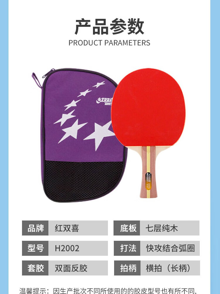 红双喜H系乒乓球拍成人儿童初级训练比赛乒乓球拍 H1002 H2002横拍/单拍(一支装)