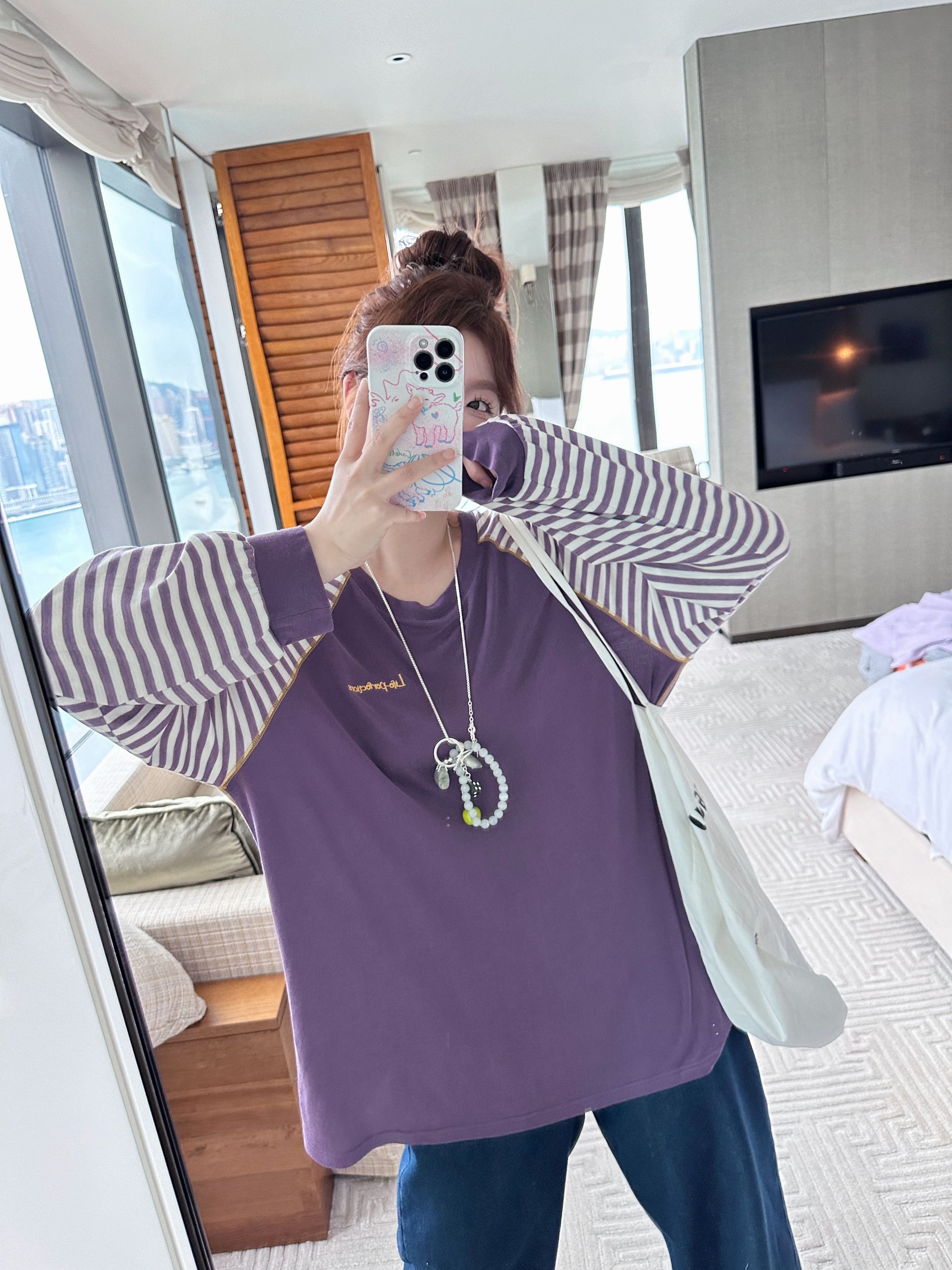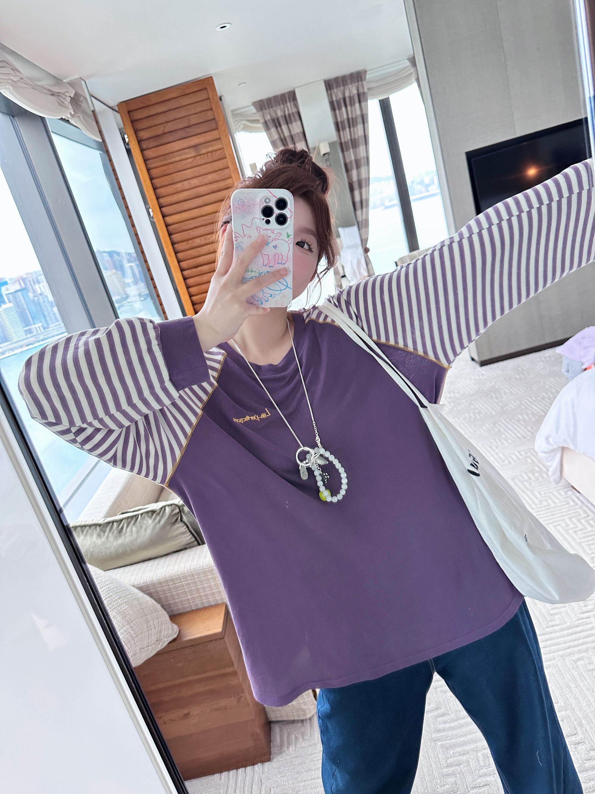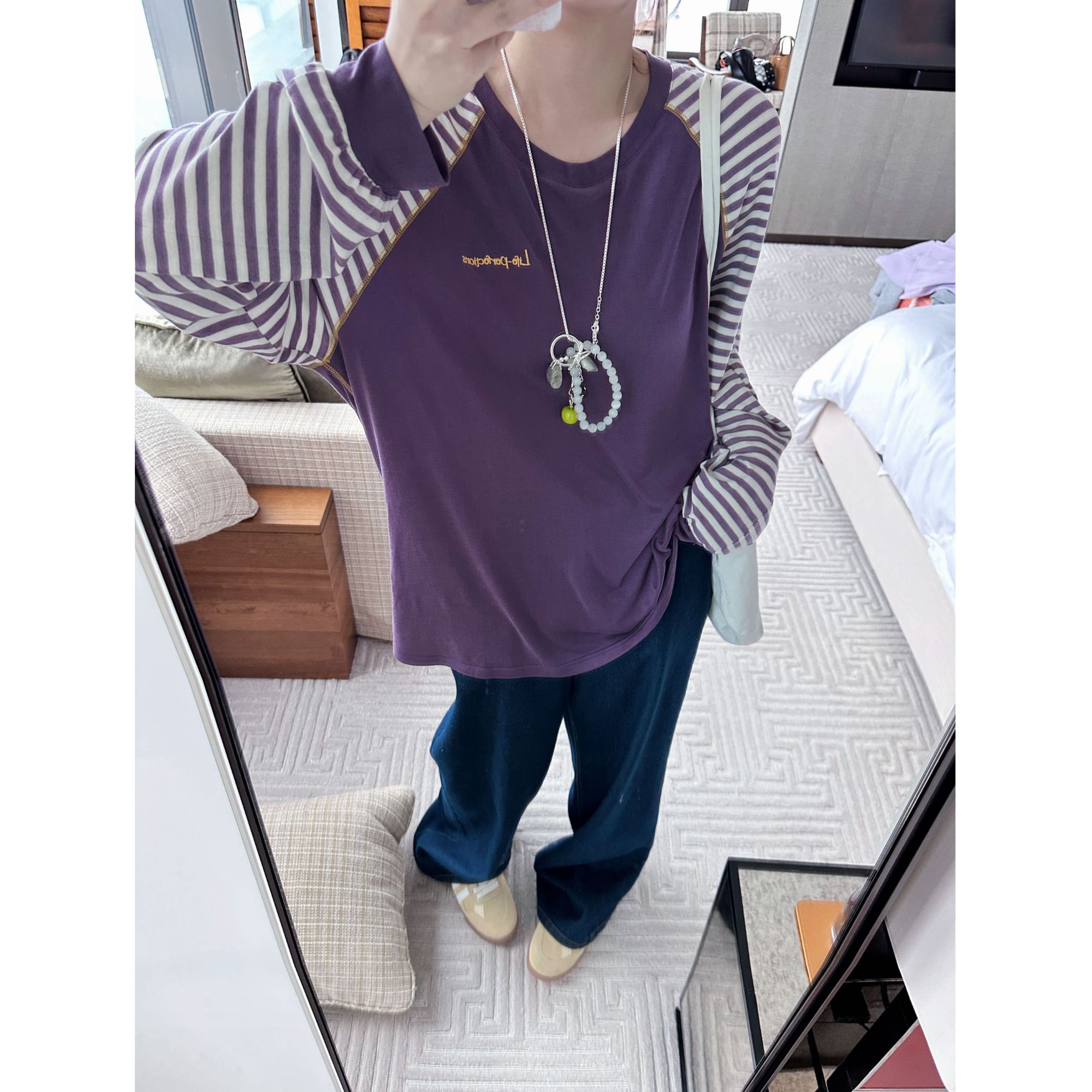 2025新品 蕾蕾同款【复古画报】宽松圆领插肩袖条纹拼接胸前刺绣大版长袖T恤