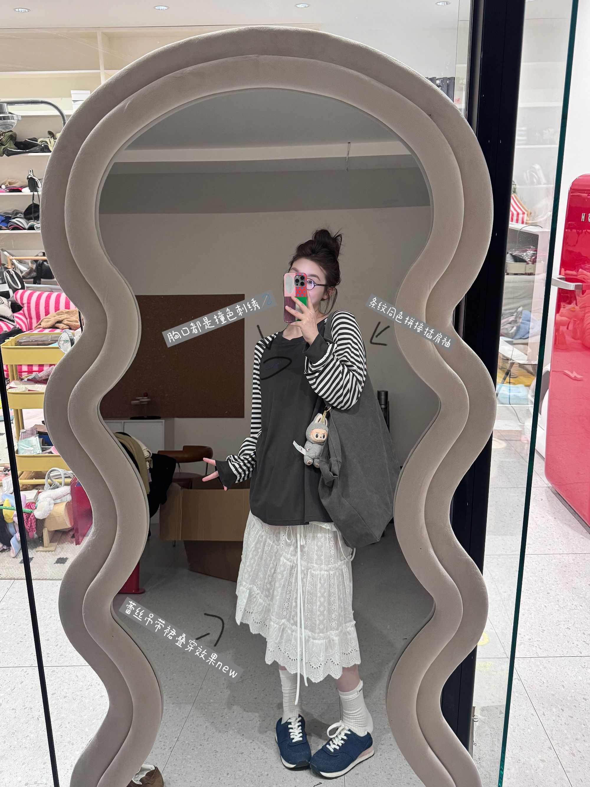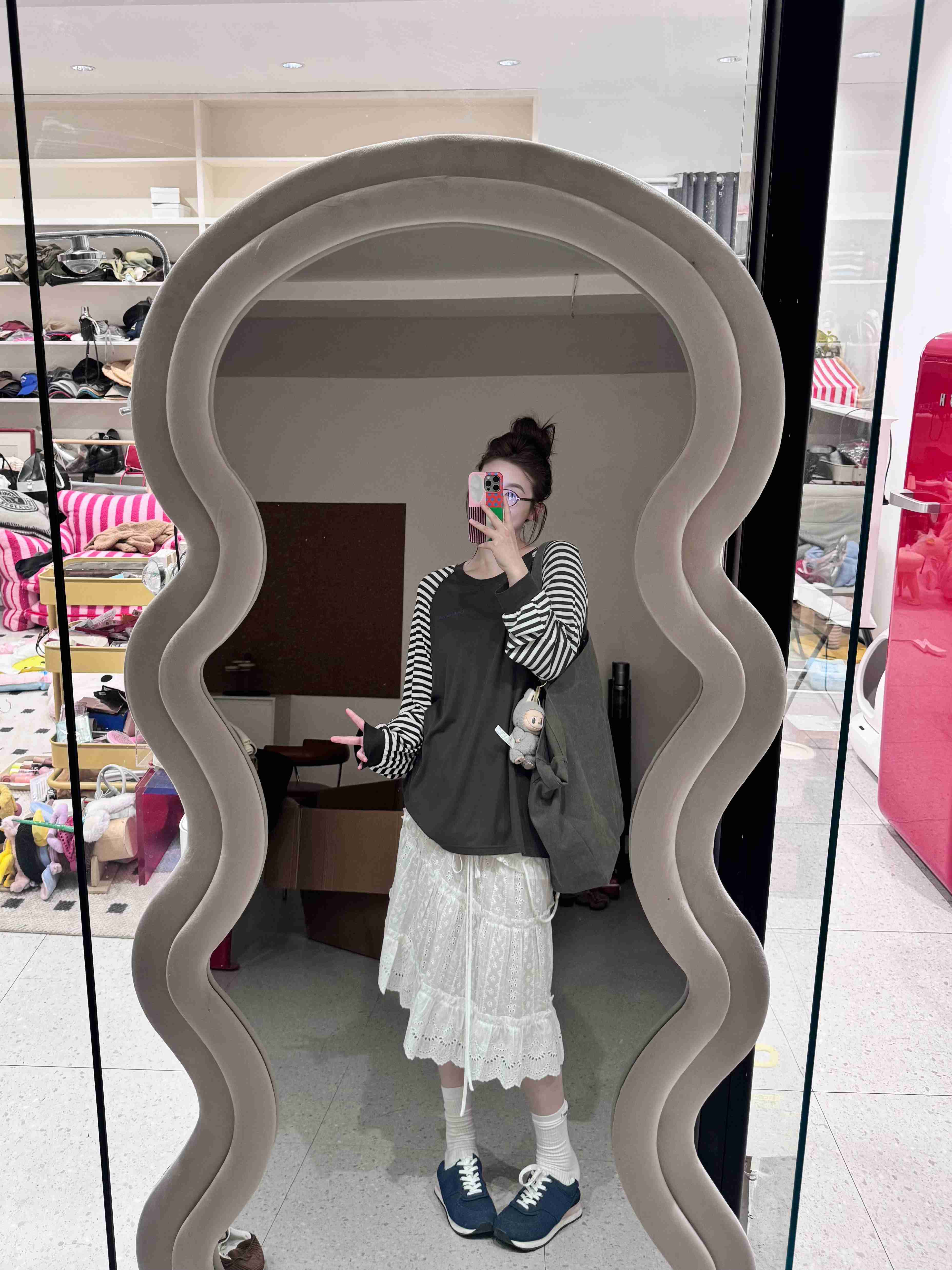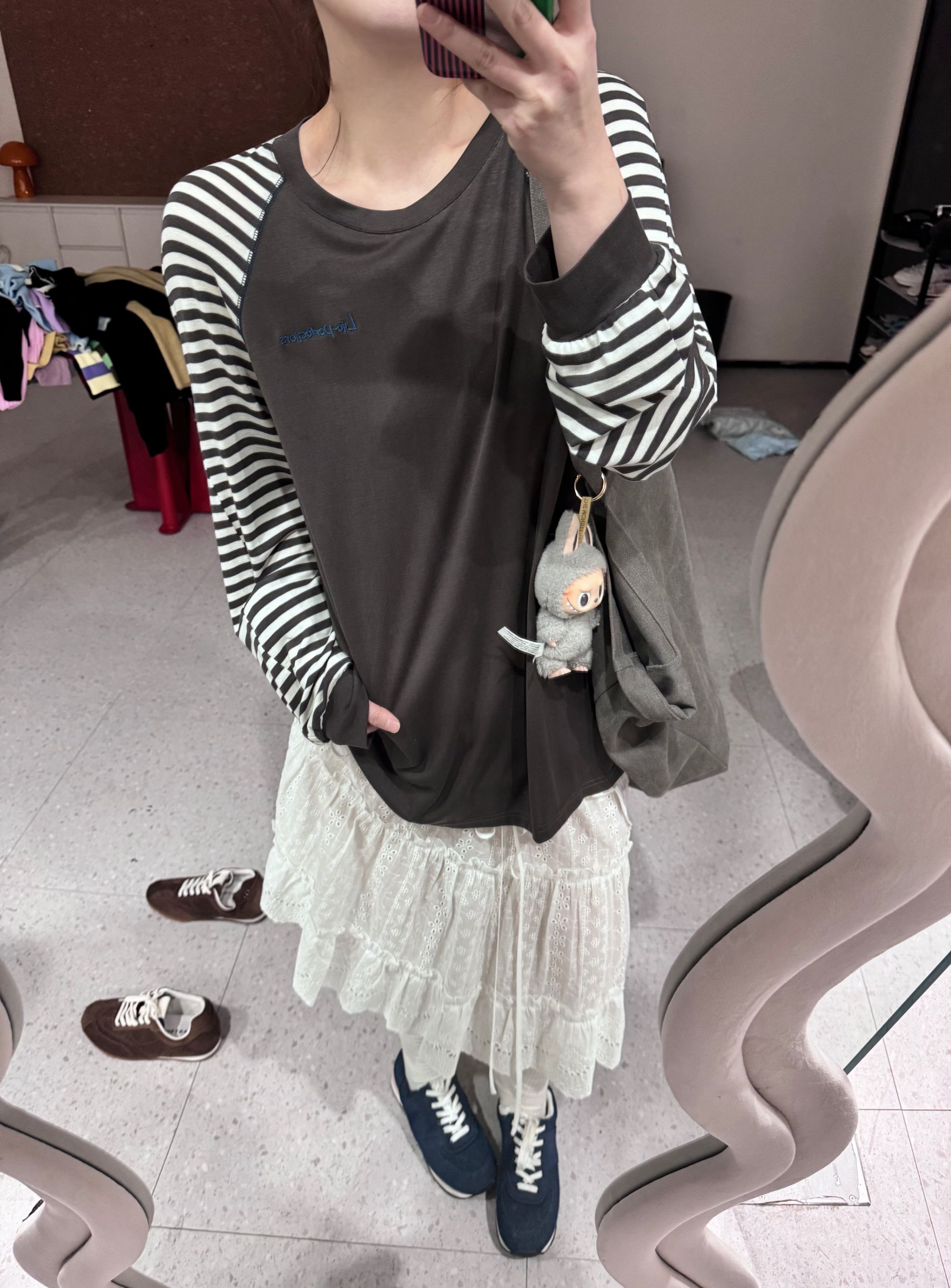 2025新品 蕾蕾同款【复古画报】宽松圆领插肩袖条纹拼接胸前刺绣大版长袖T恤
