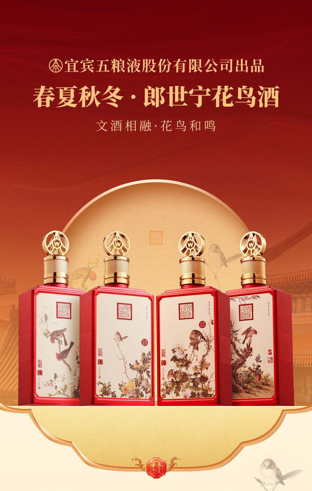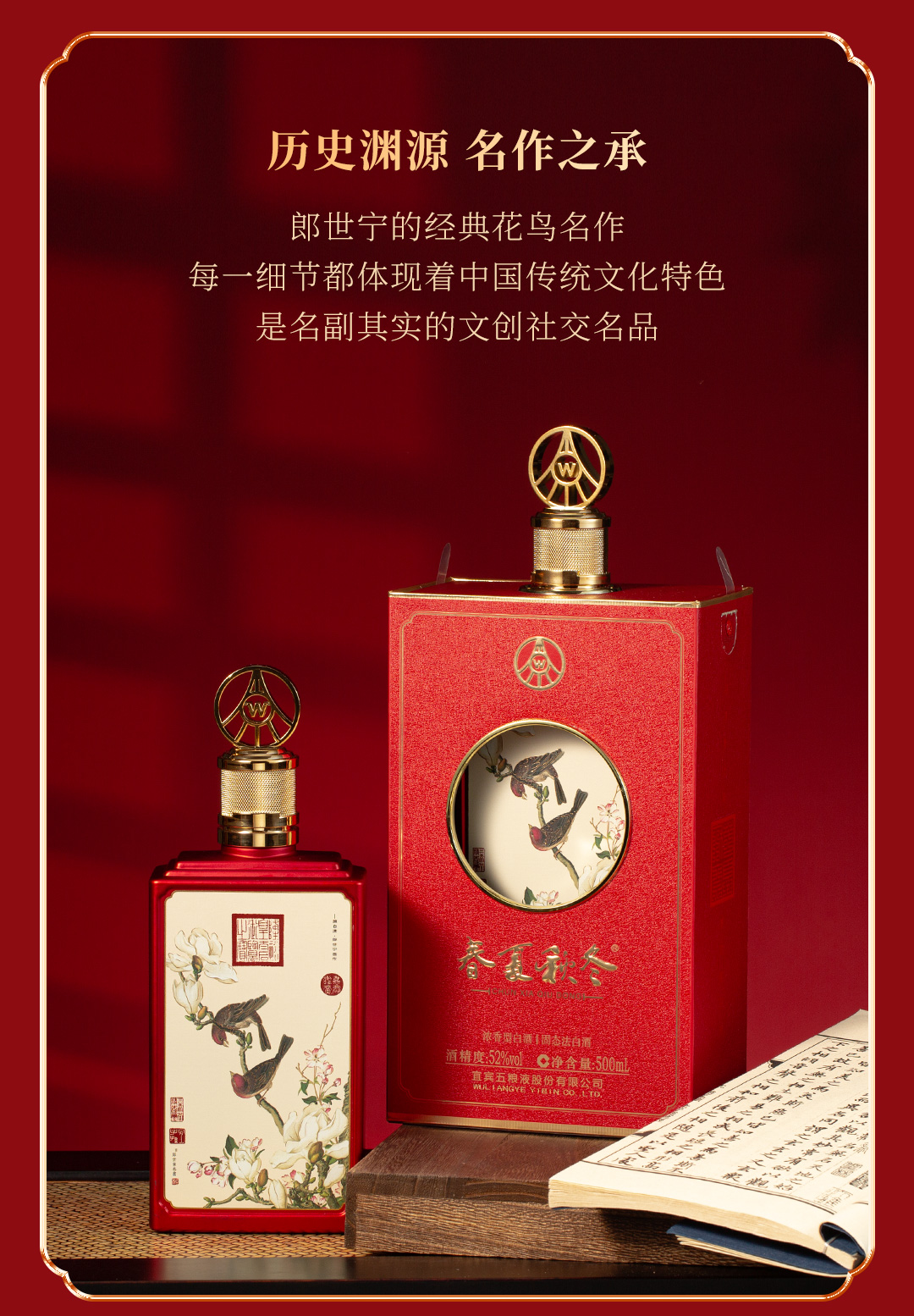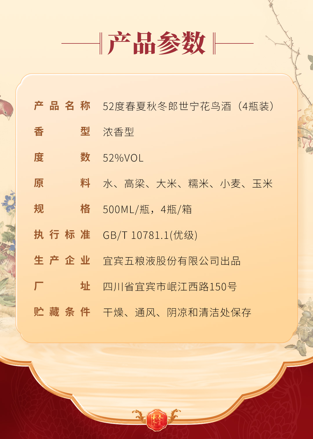 严选 | 五粮液春夏秋冬·郎世宁花鸟酒 500ml*4瓶装 整箱装 五粮液股份出品 52度