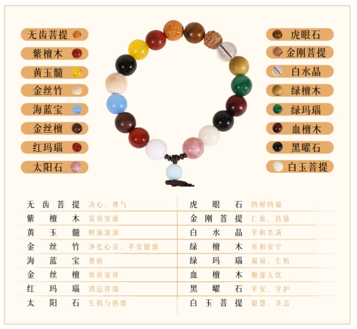 【材质】无齿菩提、紫檀木、虎眼石、金刚菩提、白水晶、绿檀木、绿玛瑙、血檀木、黑曜石、白玉菩提、太阳石、红玛瑙、金丝檀、海蓝宝、金丝竹、黄玉髓
