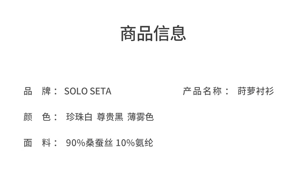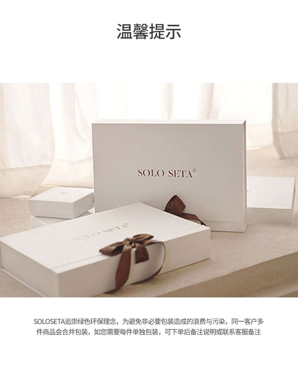 - soloseta专注于真丝织物,灵感源自意大利语,中文含义为“只做真丝”的意思。让睡衣变时尚,居家和外出瞬间切换,使其更具有出街,度假,参加宴会等功能。