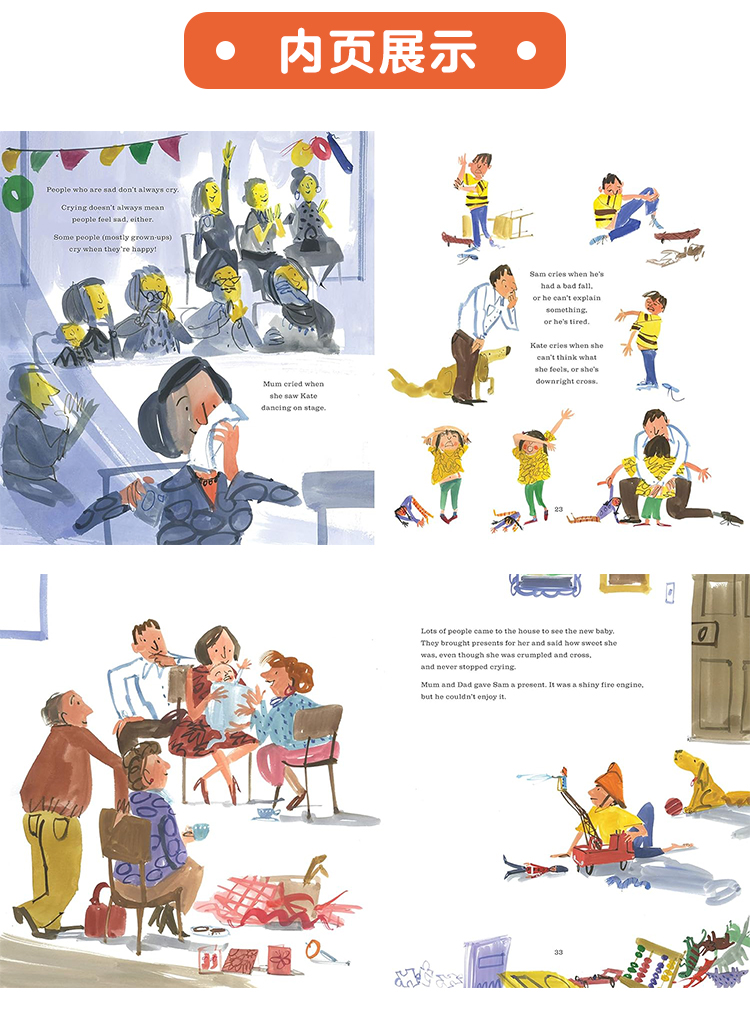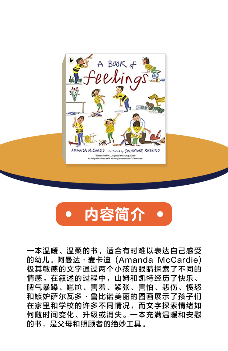 一本温暖、温柔的书,适合有时难以表达自己感受的幼儿。阿曼达·麦卡迪 (Amanda McCardie) 极其敏感的文字通过两个小孩的眼睛探索了不同的情感。在叙述的过程中,山姆和凯特经历了快乐、脾气暴躁、尴尬、害羞、紧张、害怕、悲伤、愤怒和嫉妒——萨尔瓦多·鲁比诺美丽的图画展示了孩子们在家里和学校的许多不同情况,而文字探索情绪如何随时间变化、升级或消失。一本充满温暖和安慰的书,是父母和照顾者的绝妙工具。