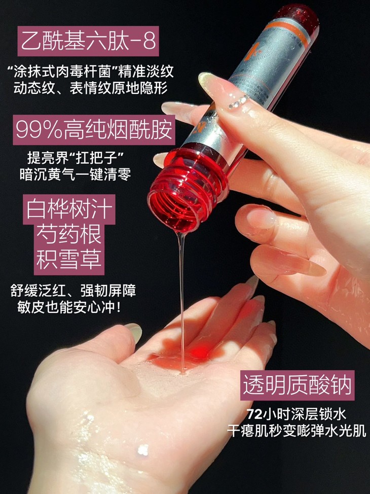 🔹乙酰基六肽-8:"涂抹式肉毒杆菌",精准淡纹,动态纹、表情纹原地隐形!