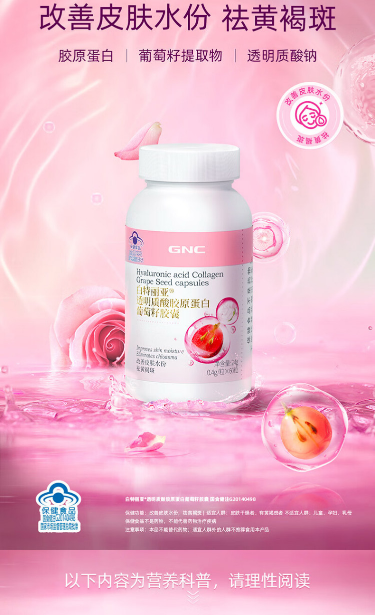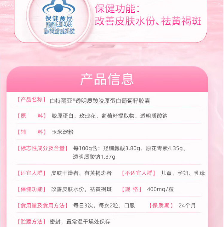 【特卖捡漏】白特丽亚® 透明质酸胶原蛋白葡萄籽胶囊【保质期:2025年6月】