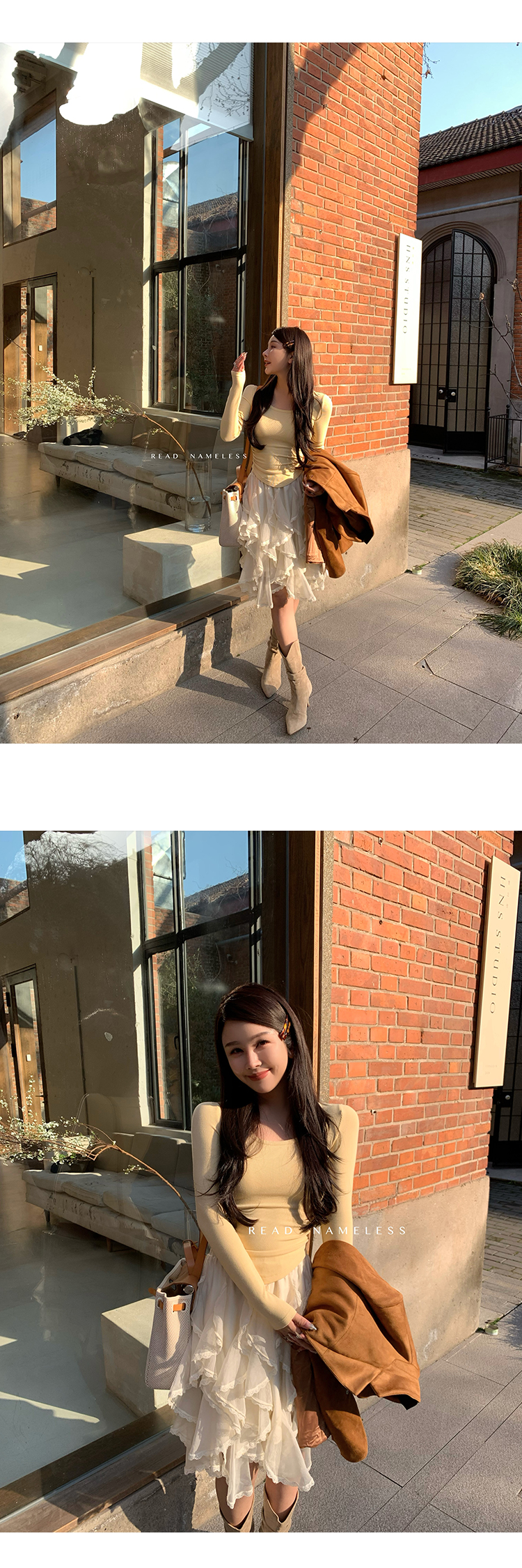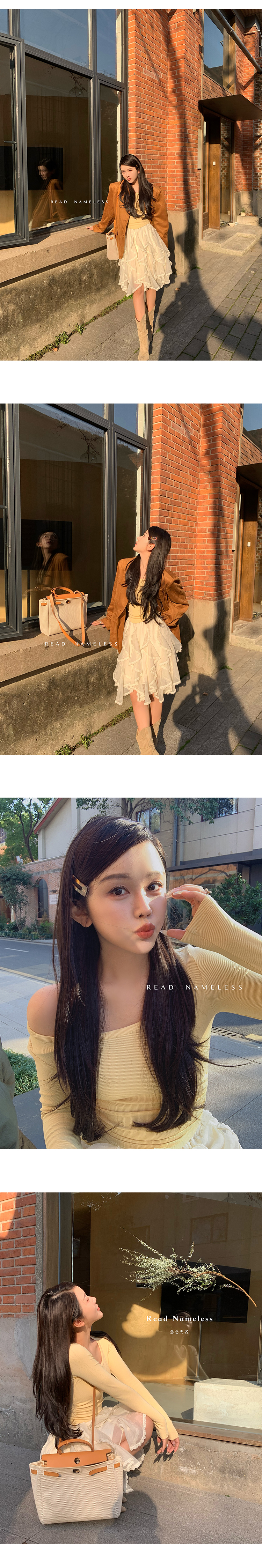 Read Nameless /巧克力纱针织挂脖+米色麂皮拼接纱裙 2025/10/13